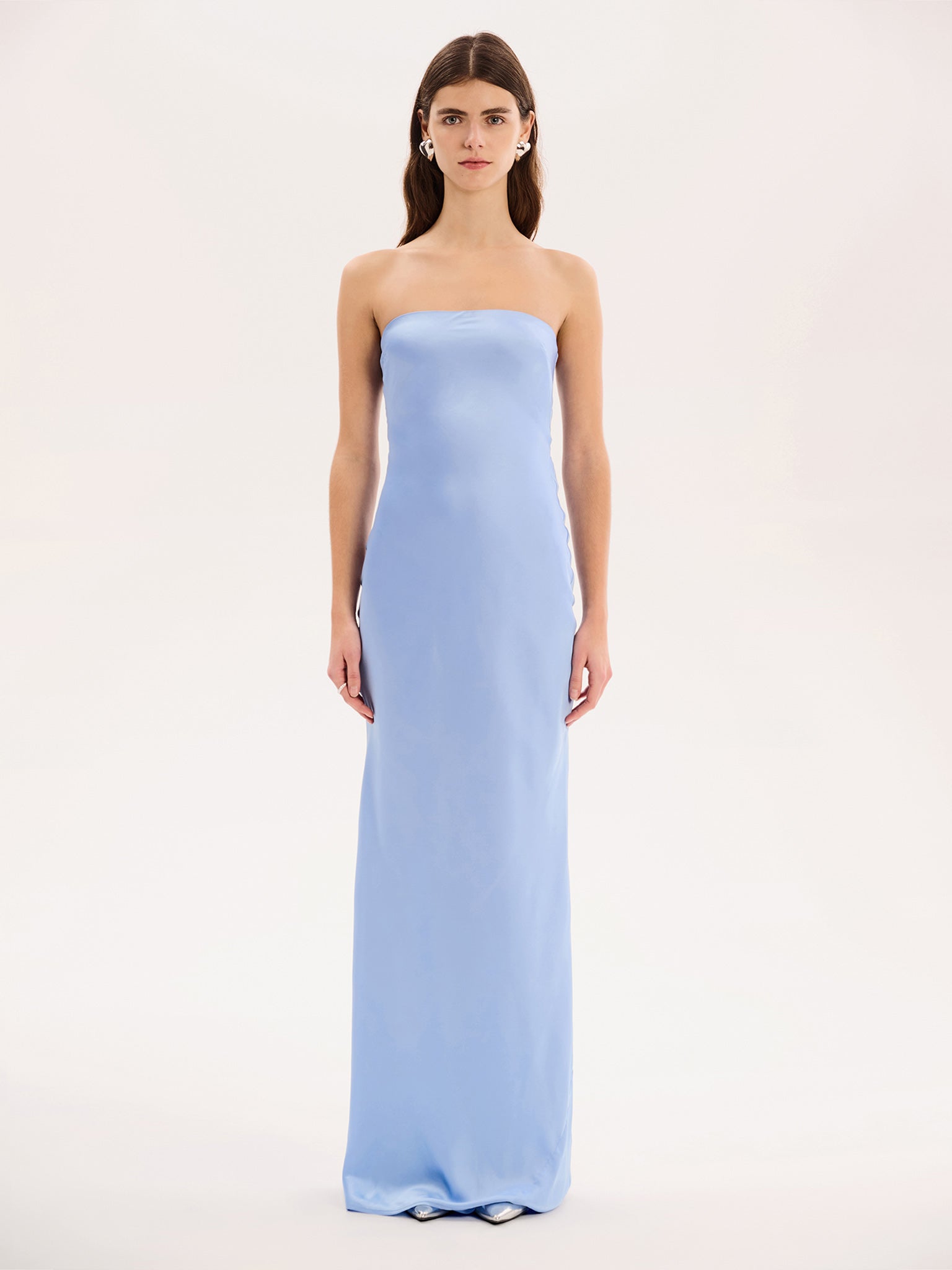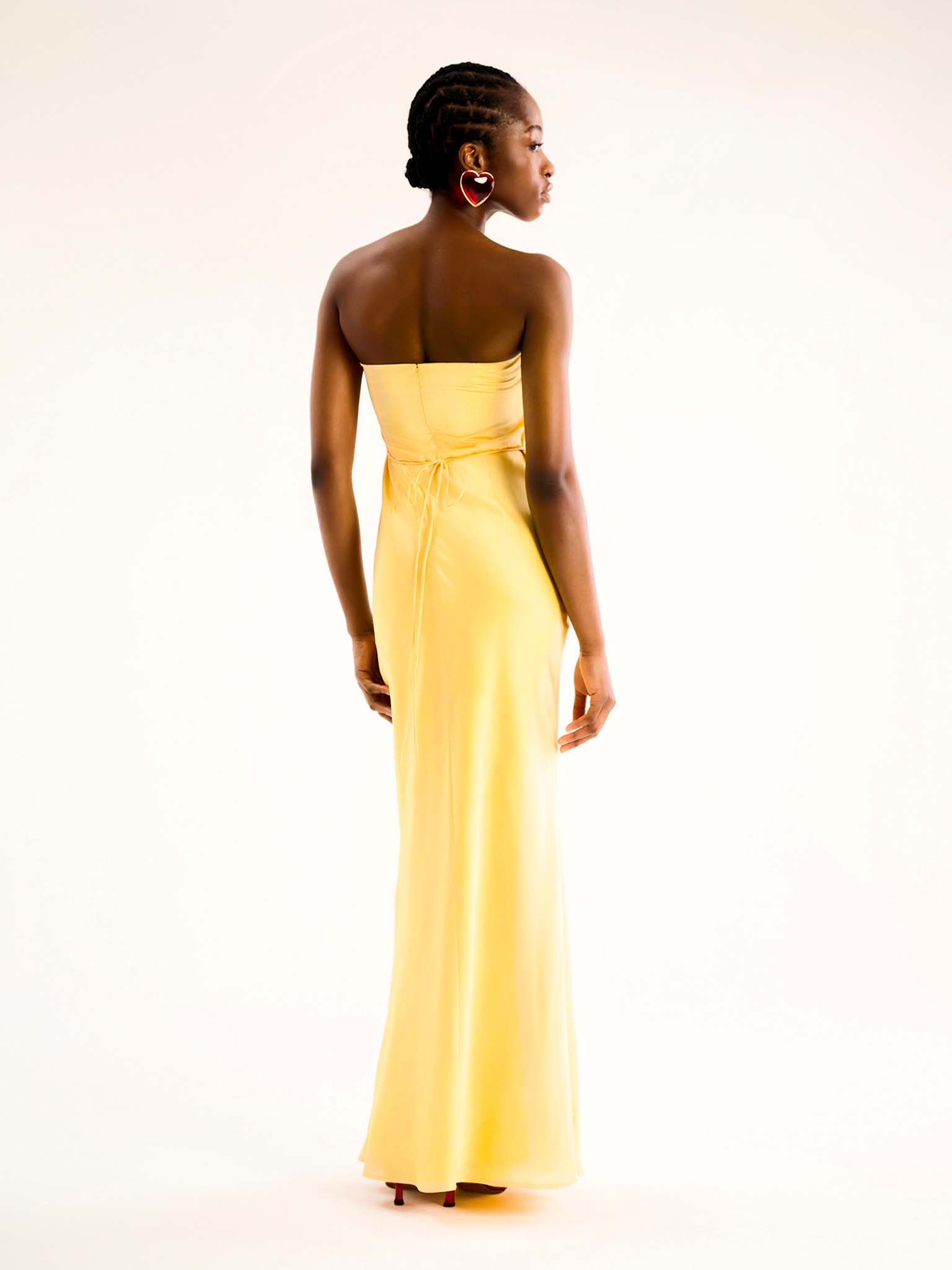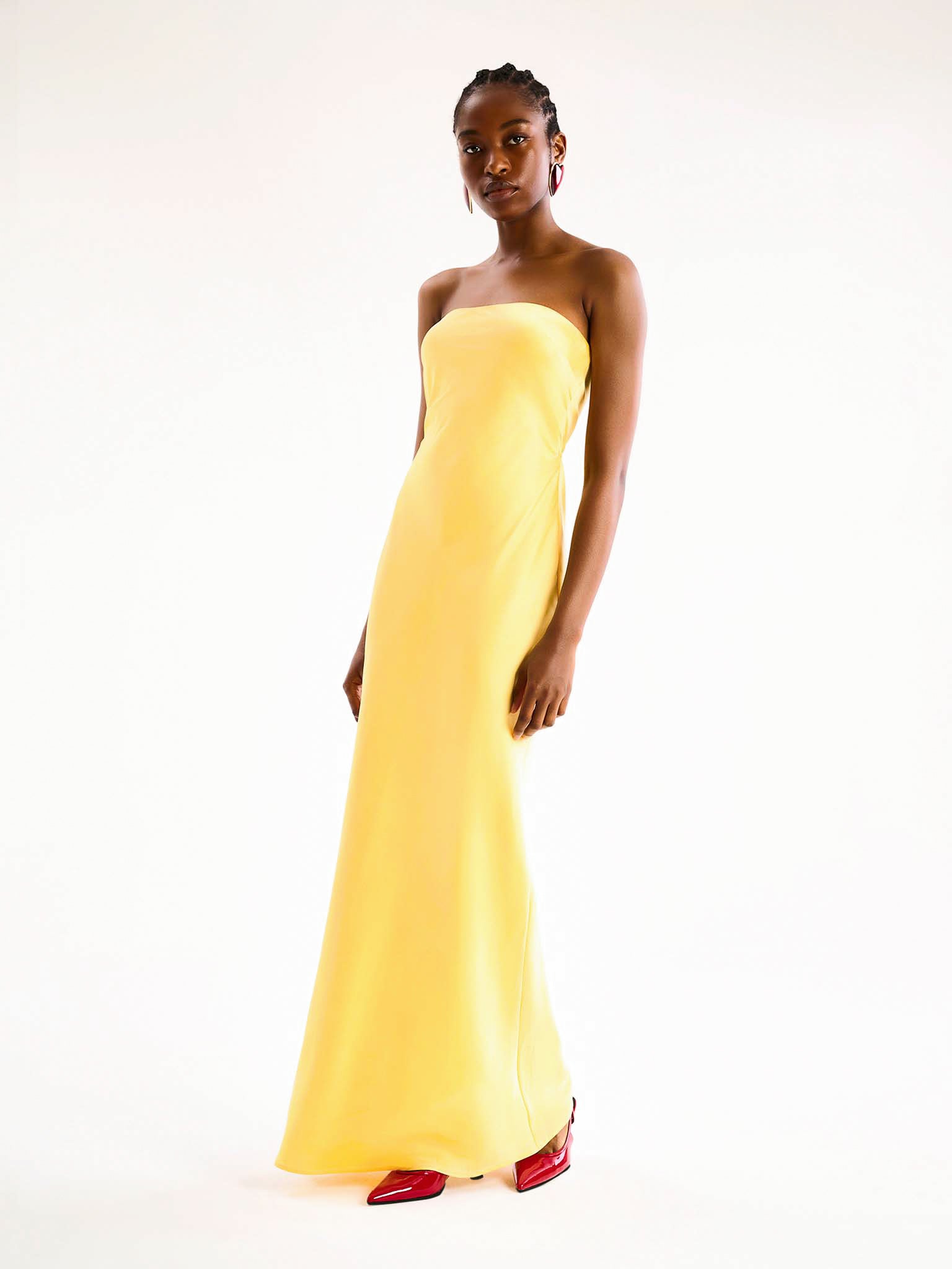 Simple, strapless, stunning; the Amdra is all that and more. Crafted from slinky 100% recycled polyester in a gorgeous butter yellow, she’s fitted throughout to enhance the elegance of the silhouette.
