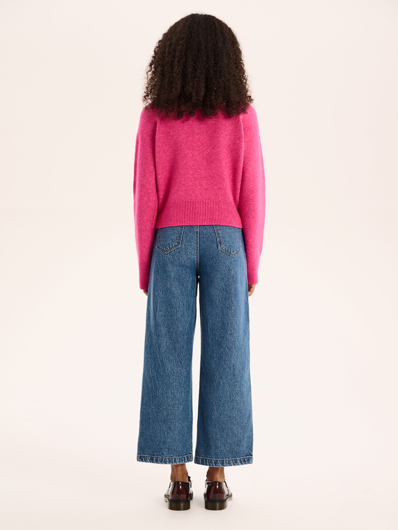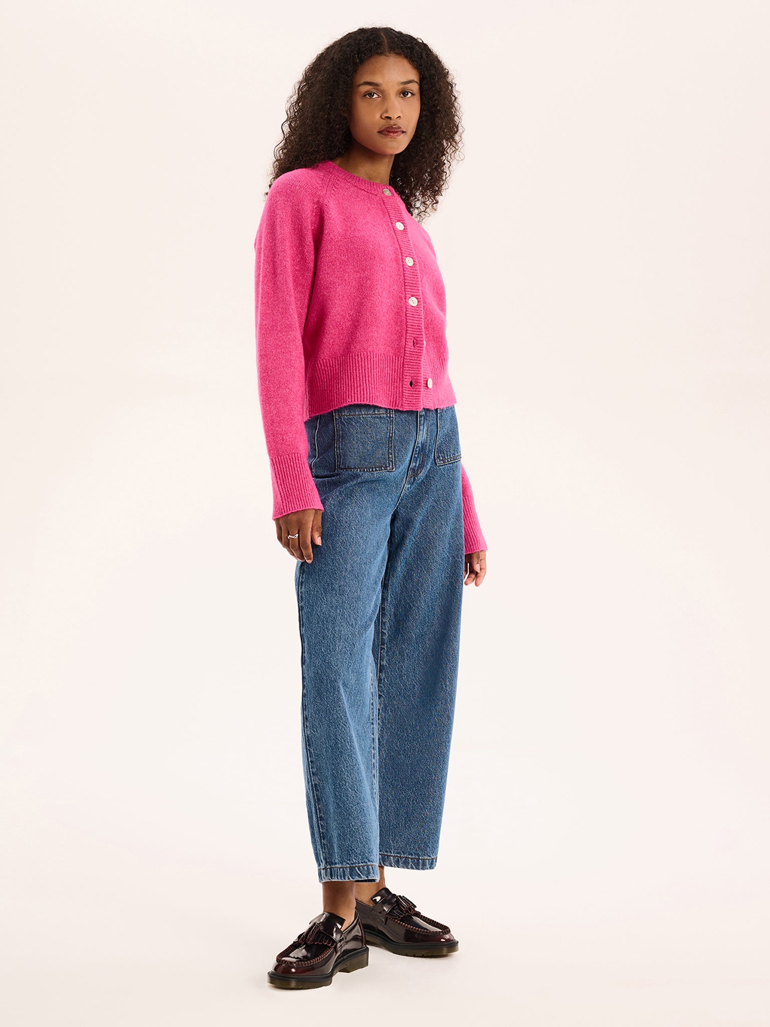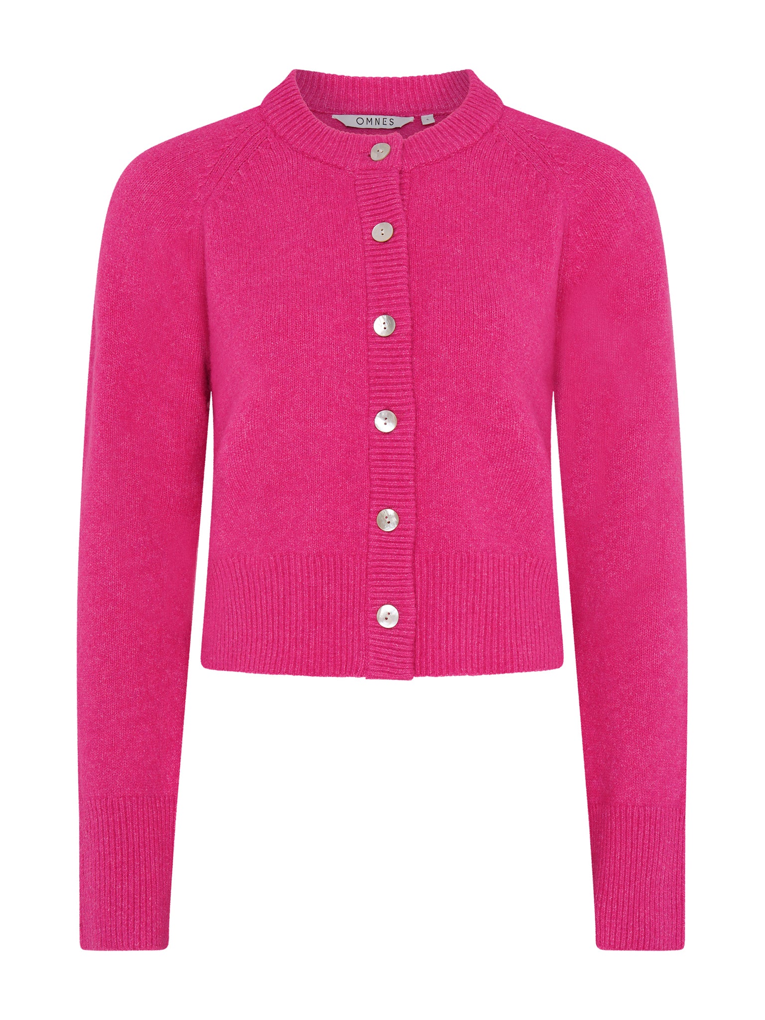 Model Height: 5'9 / 175cm Model wears UK size S Fit: Regular Magenta cardigan with contrasting navy trim, high neck and button front.