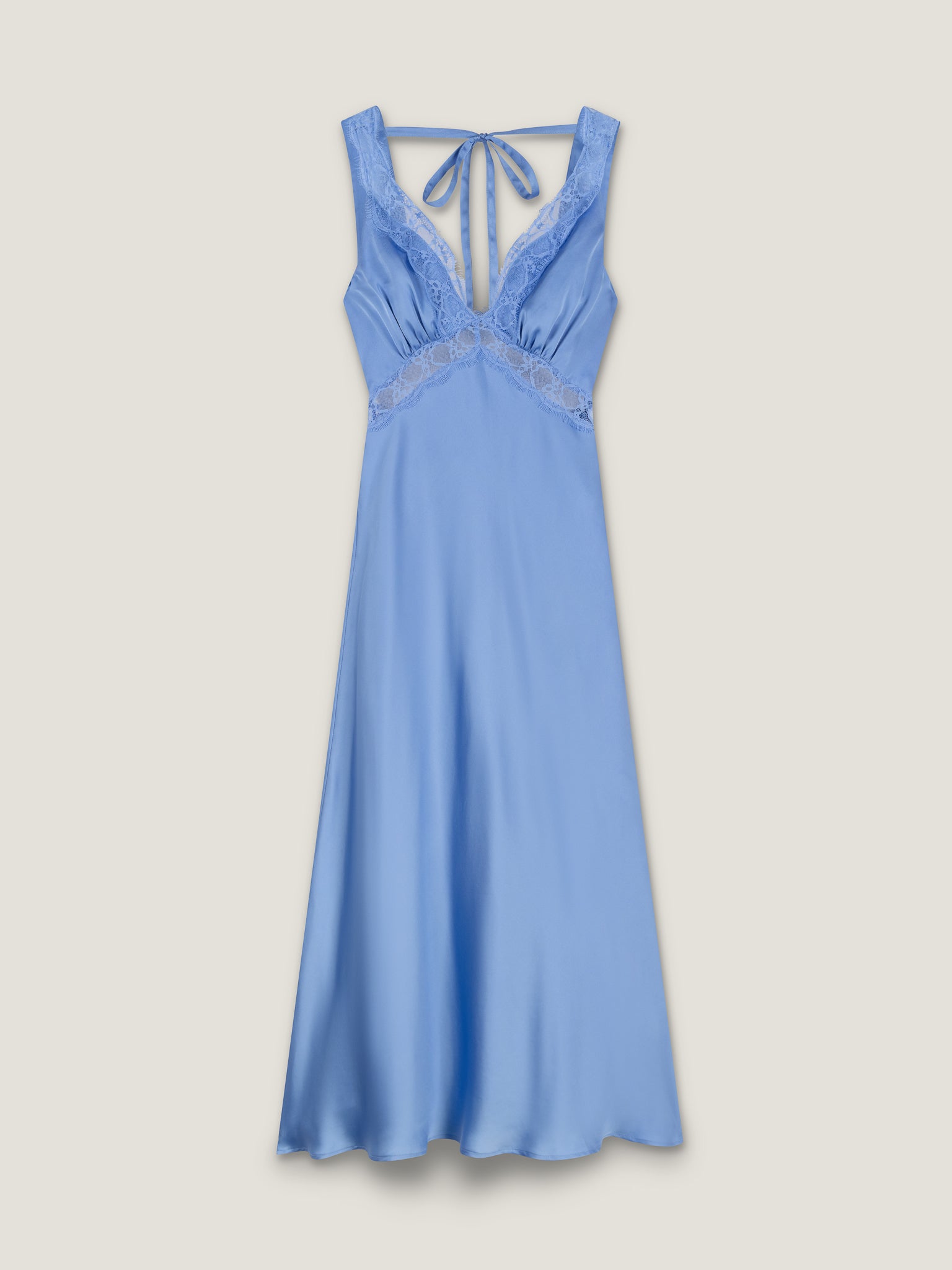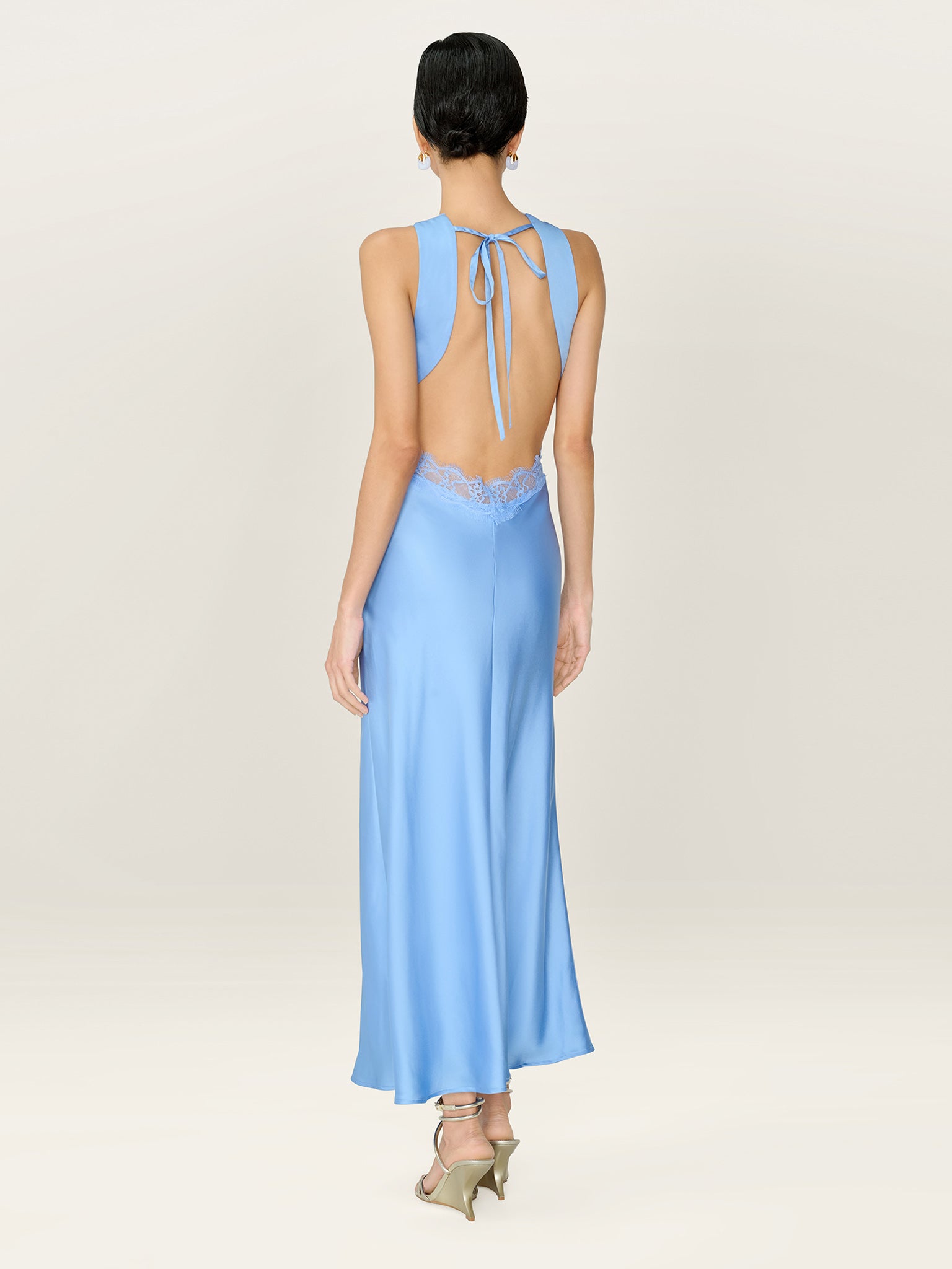 Aurelia features a plunging neckline and open back, artfully outlined by lace details. Crafted from satin in dreamy powder blue, this romantic midi dress is oozing with feminine details from the curved tie-back to the peek-a-boo lace under the bust.