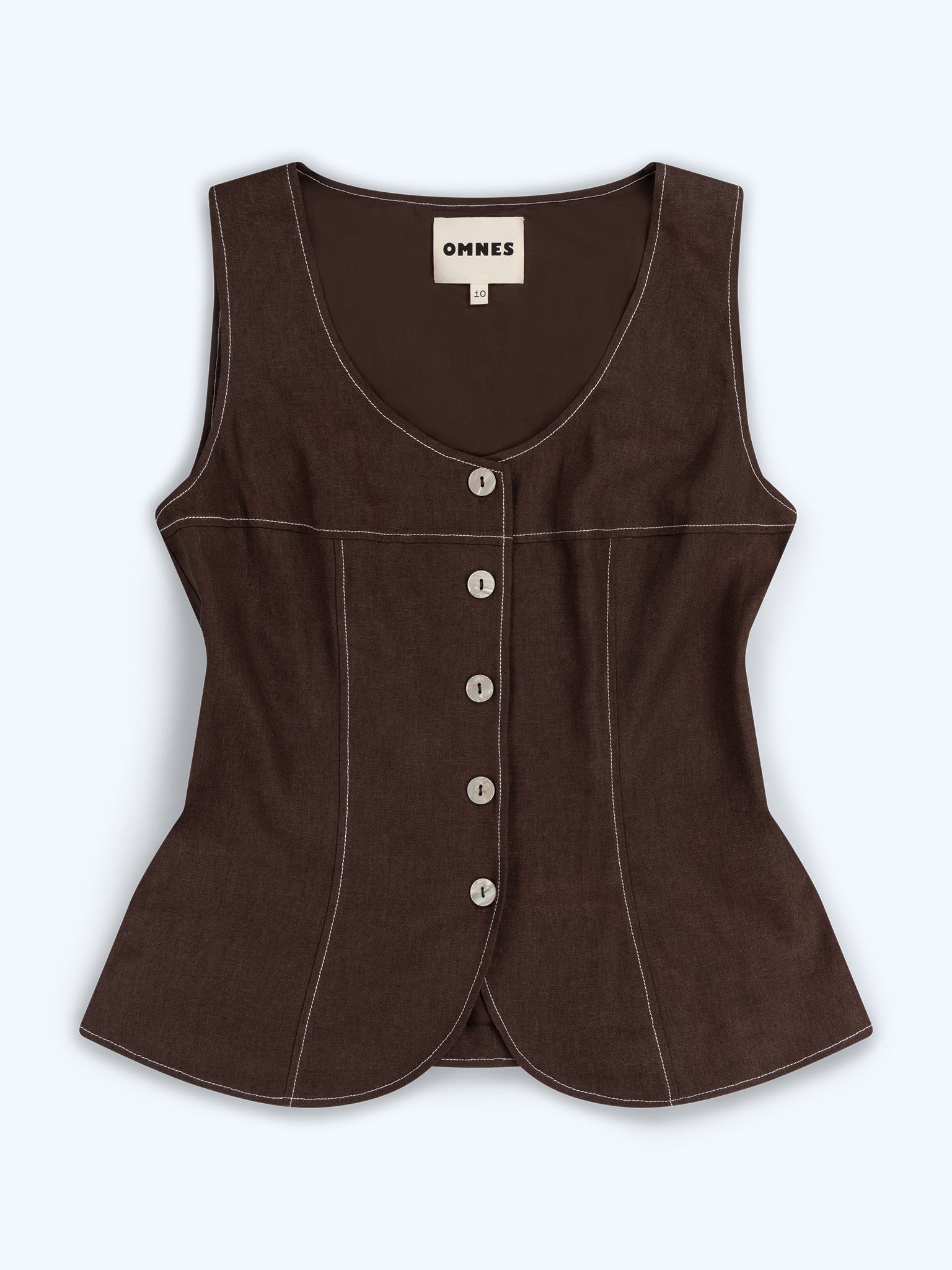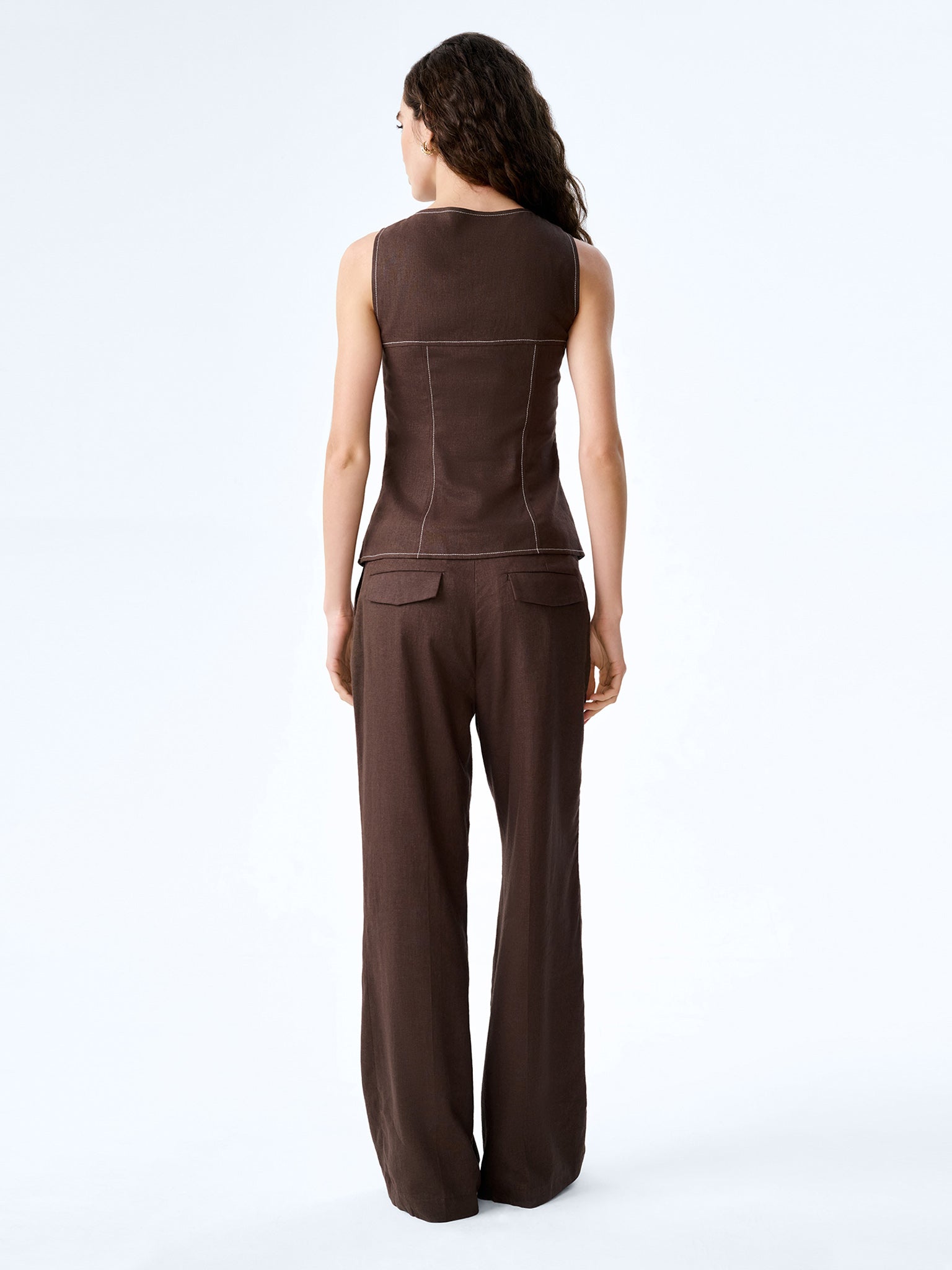 Inspired by classic menswear, the Austen waistcoat is crafted from breathable linen in a rich chocolate hue. It features a clean button-front and a waistcoat-inspired silhouette with a sharp, tailored fit. Finished with subtle contrast stitching for a modern twist, Austen works perfectly worn alone or layered. Style it with the matching Pearl trousers for a playfully polished co-ord.