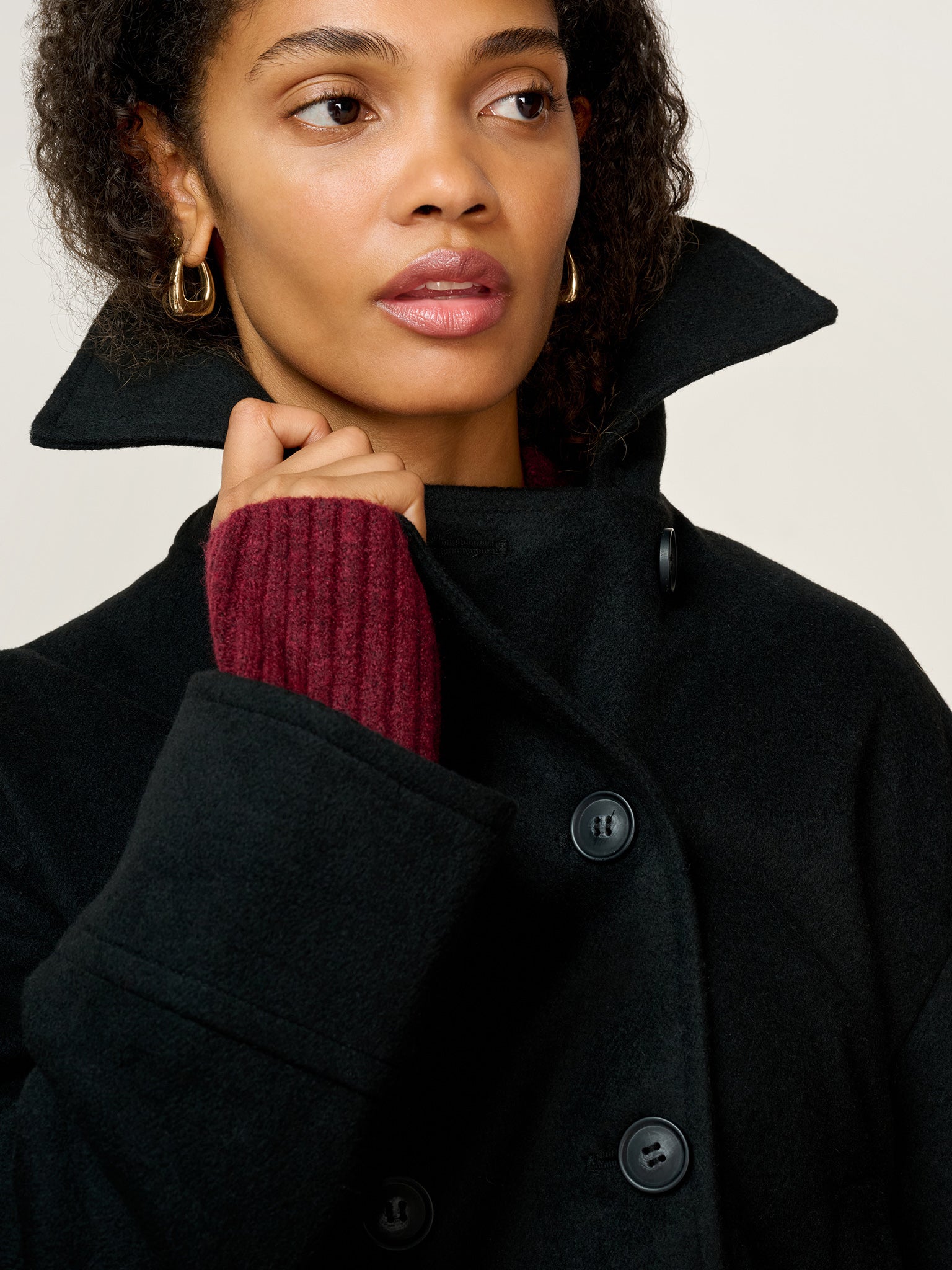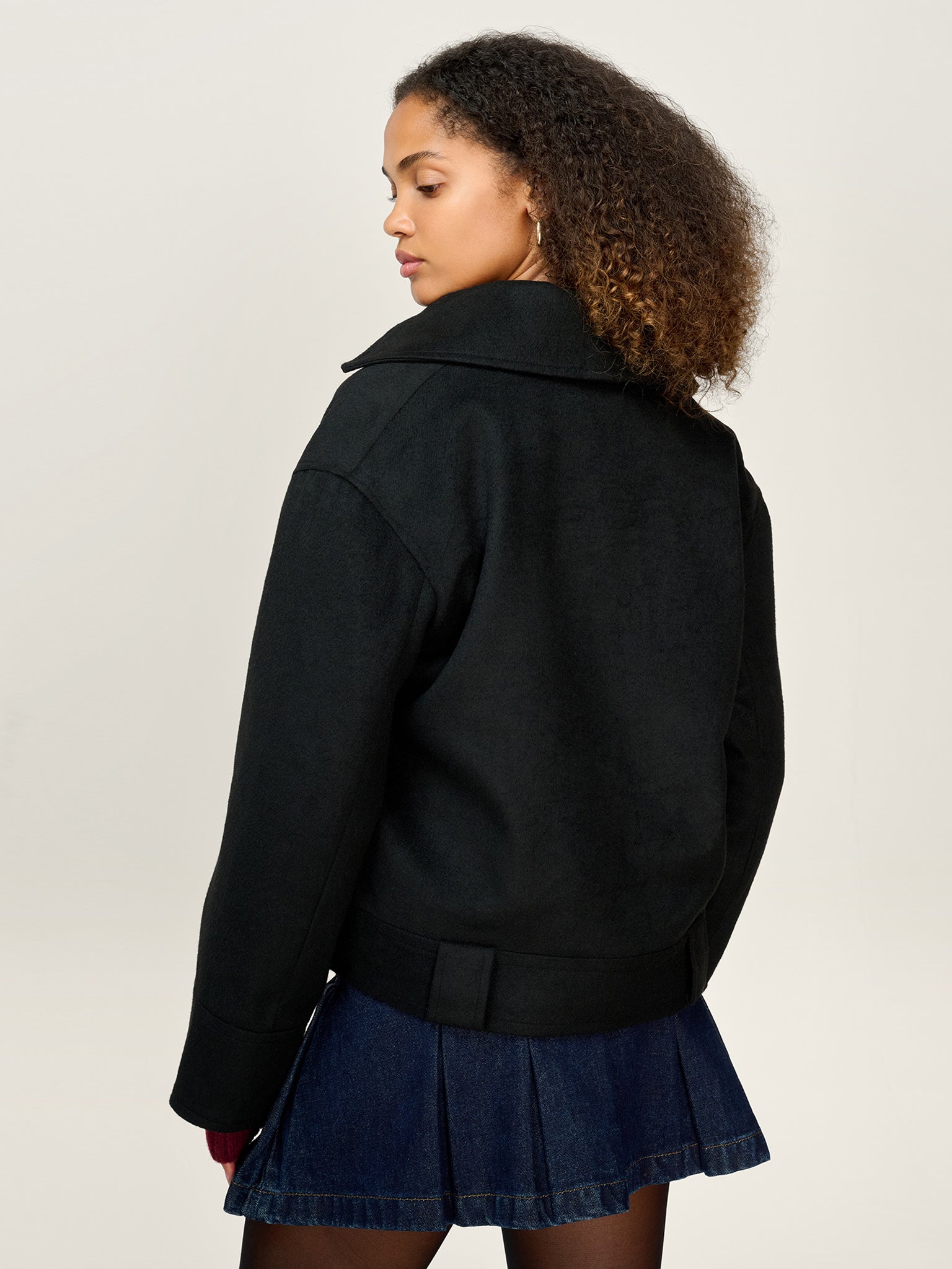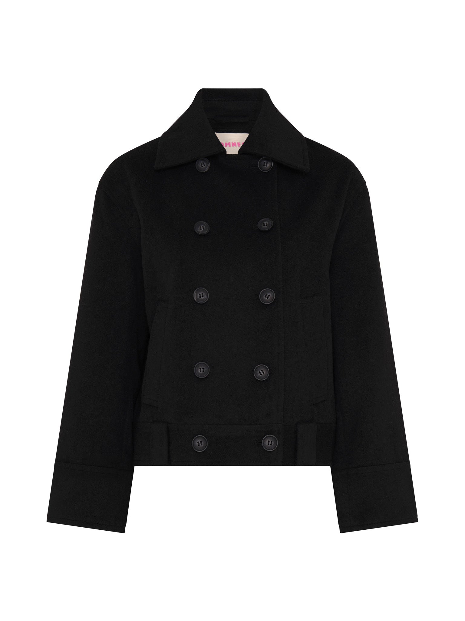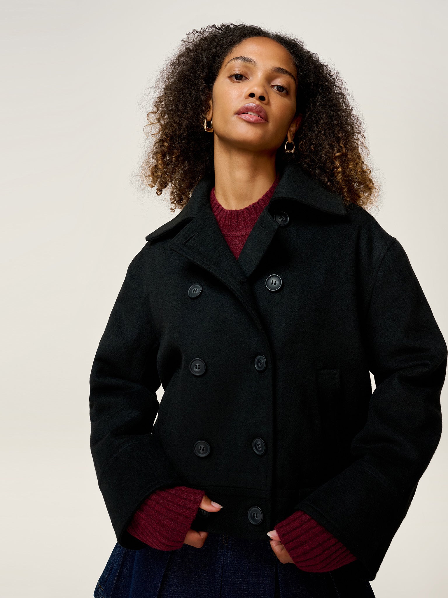 Tailored in a soft wool blend, this cropped coat is designed with a sharp, structured collar and a double row of buttons for a polished, put-together finish. The boxy silhouette gives it a modern edge, while the clean lines make it easy to style with your existing wardrobe. Throw Clyde over denim or tailoring and step out feeling equal parts cosy and considered.