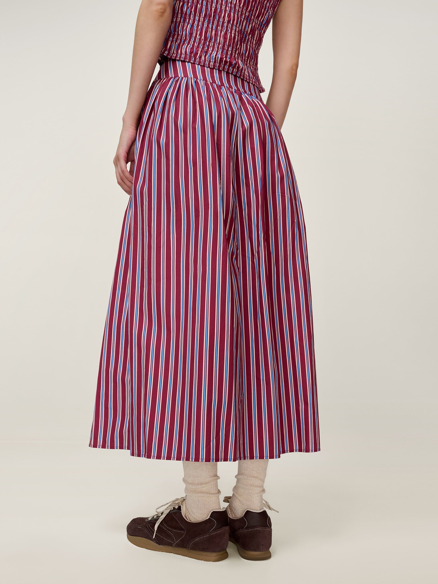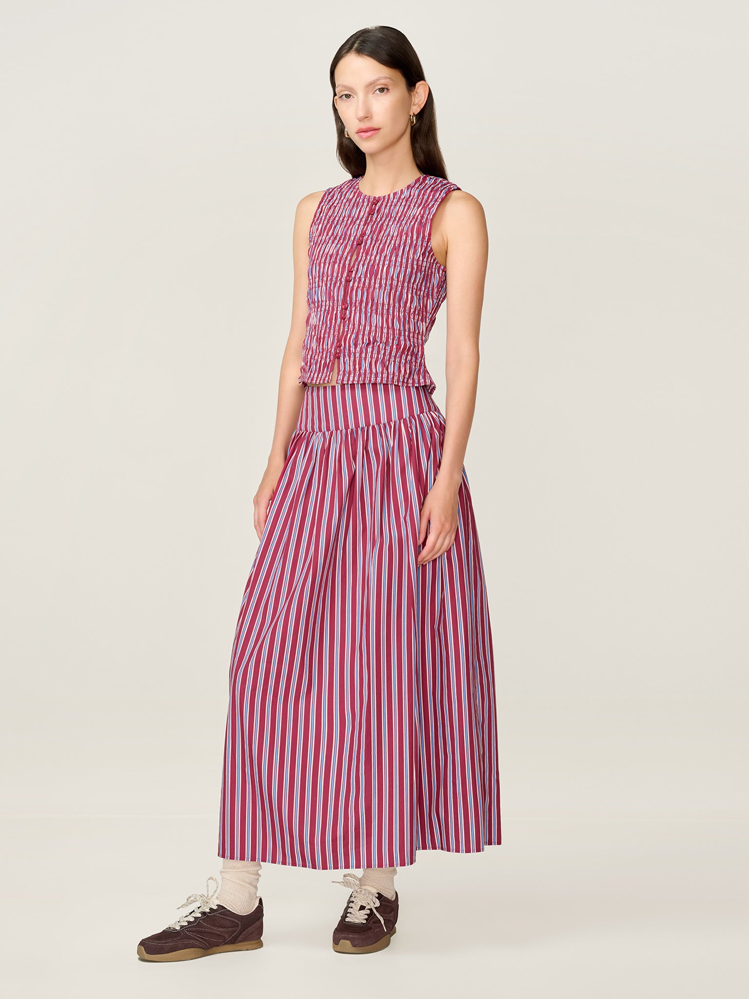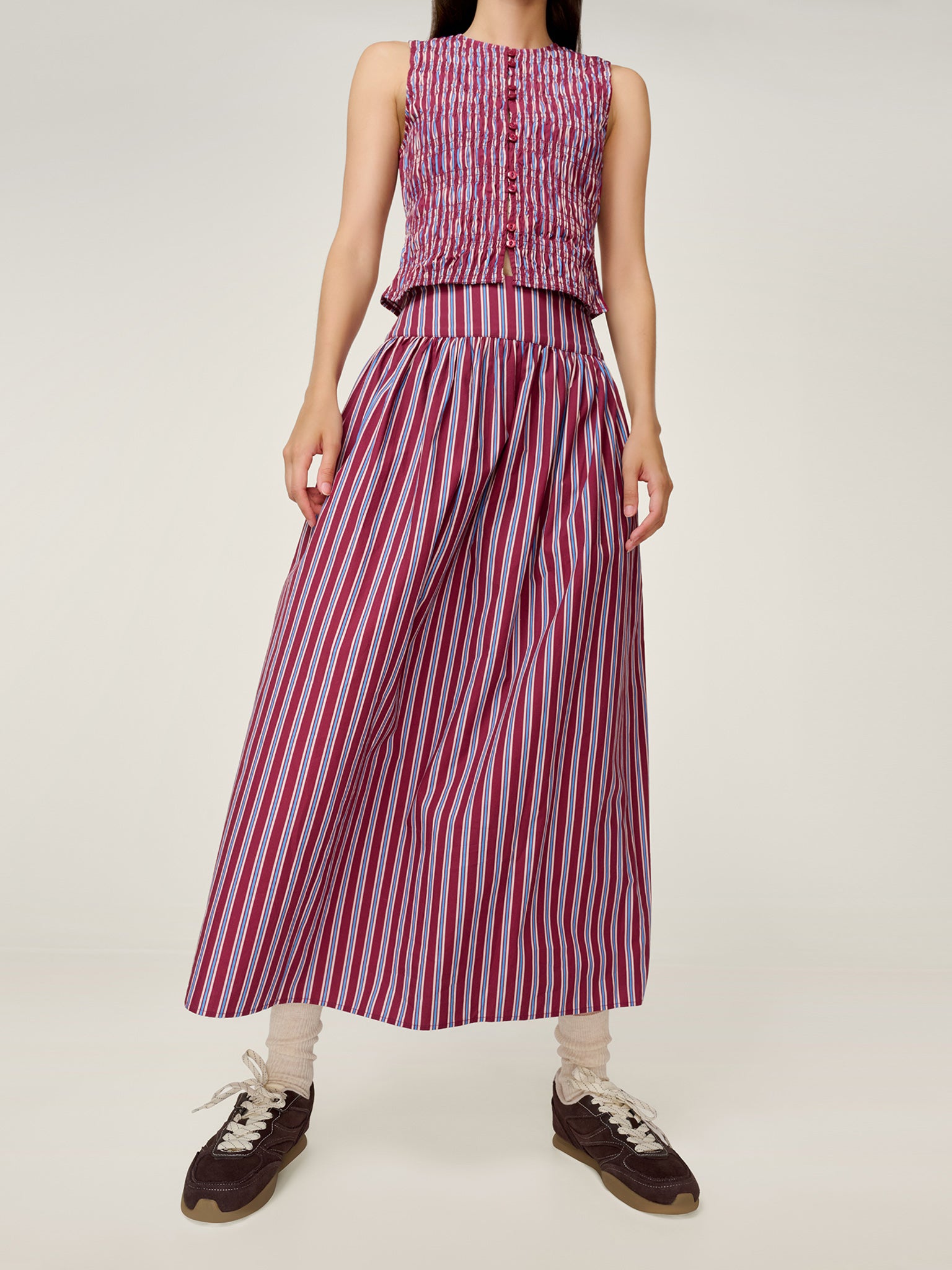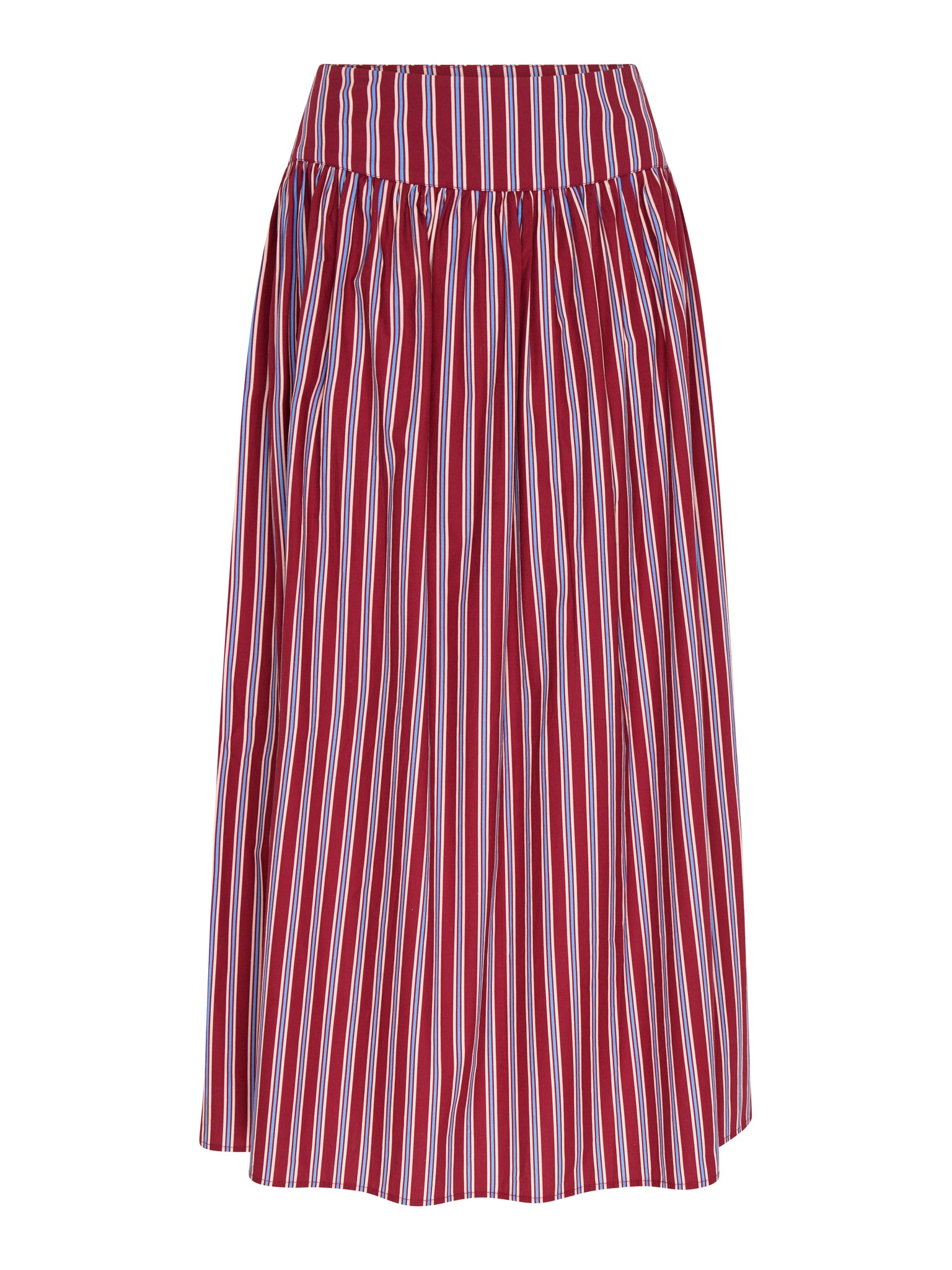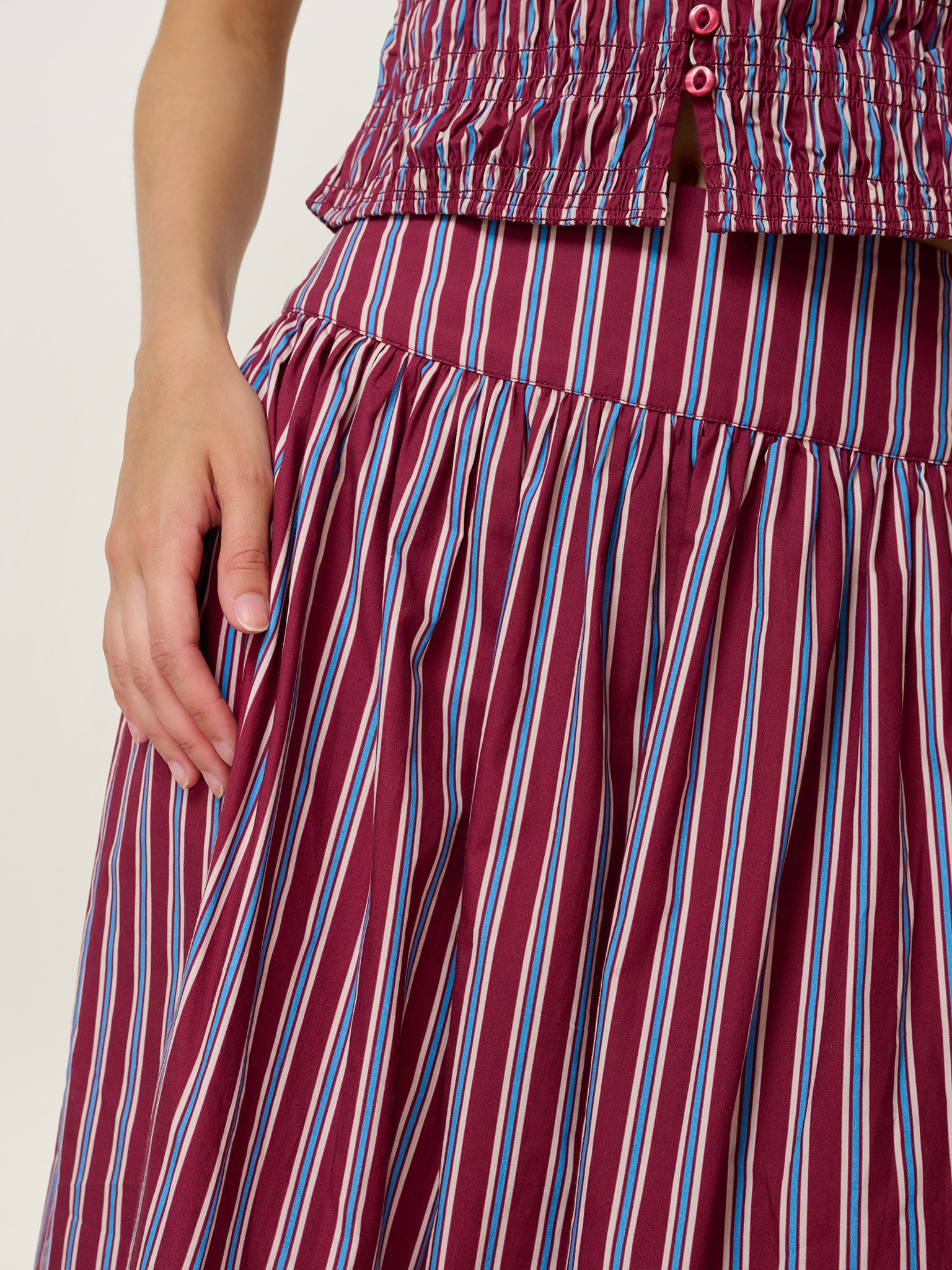 Darcie is an effortless and endlessly wearable cotton skirt in a blue and brown vertical stripe. Designed with a flattering drop waist and a full midi skirt, she’s made for easy styling; wherever the day takes you.