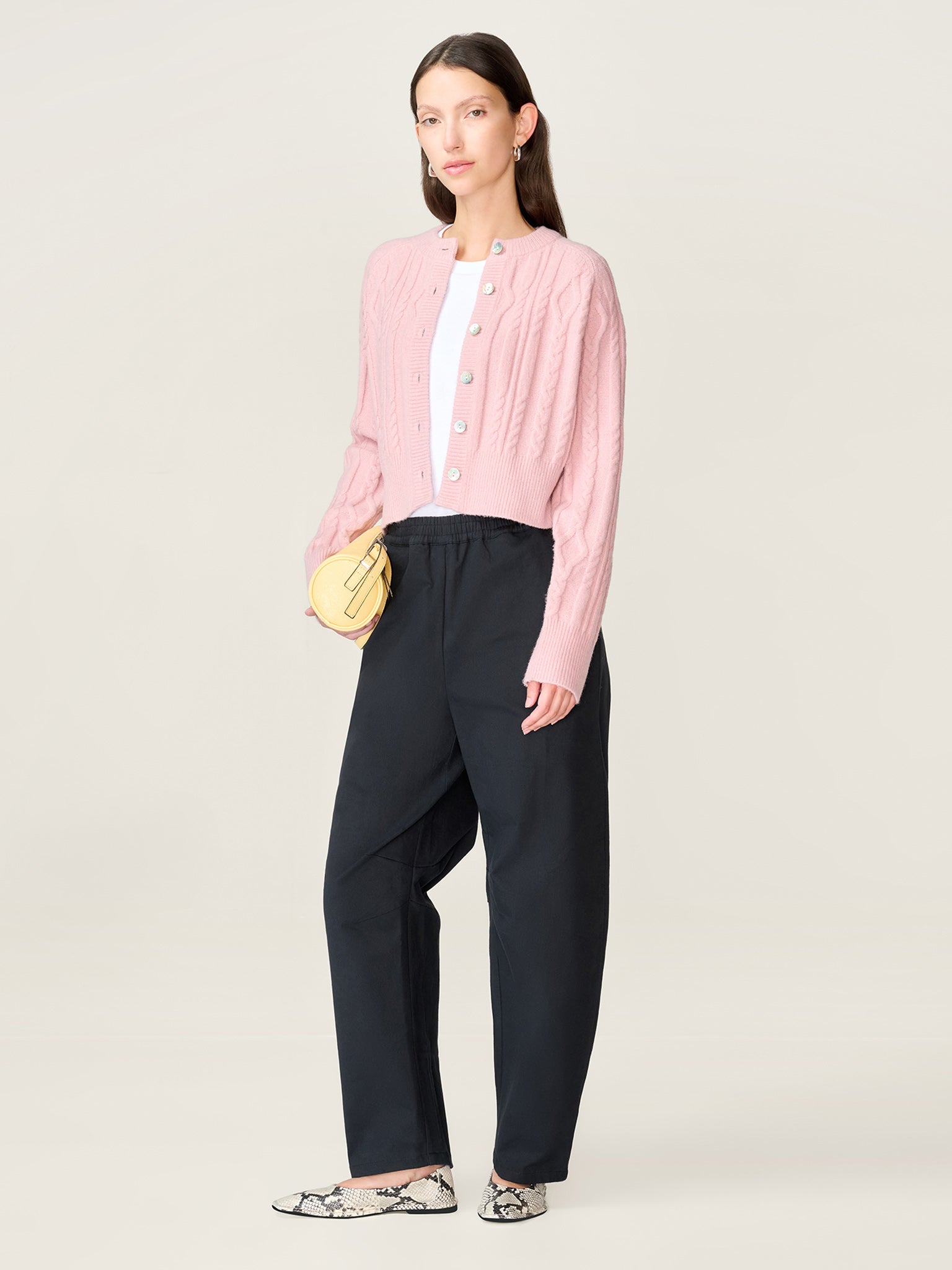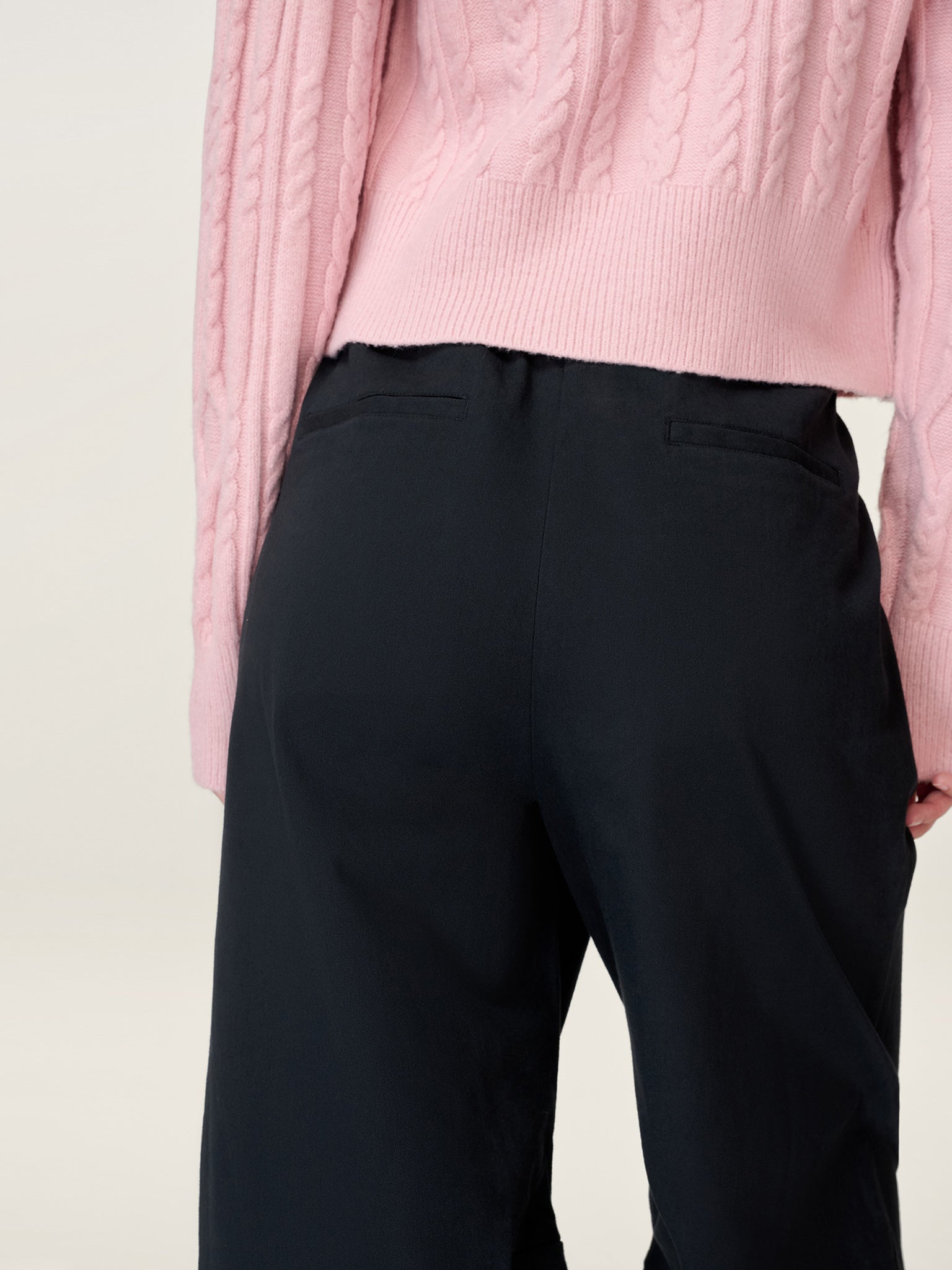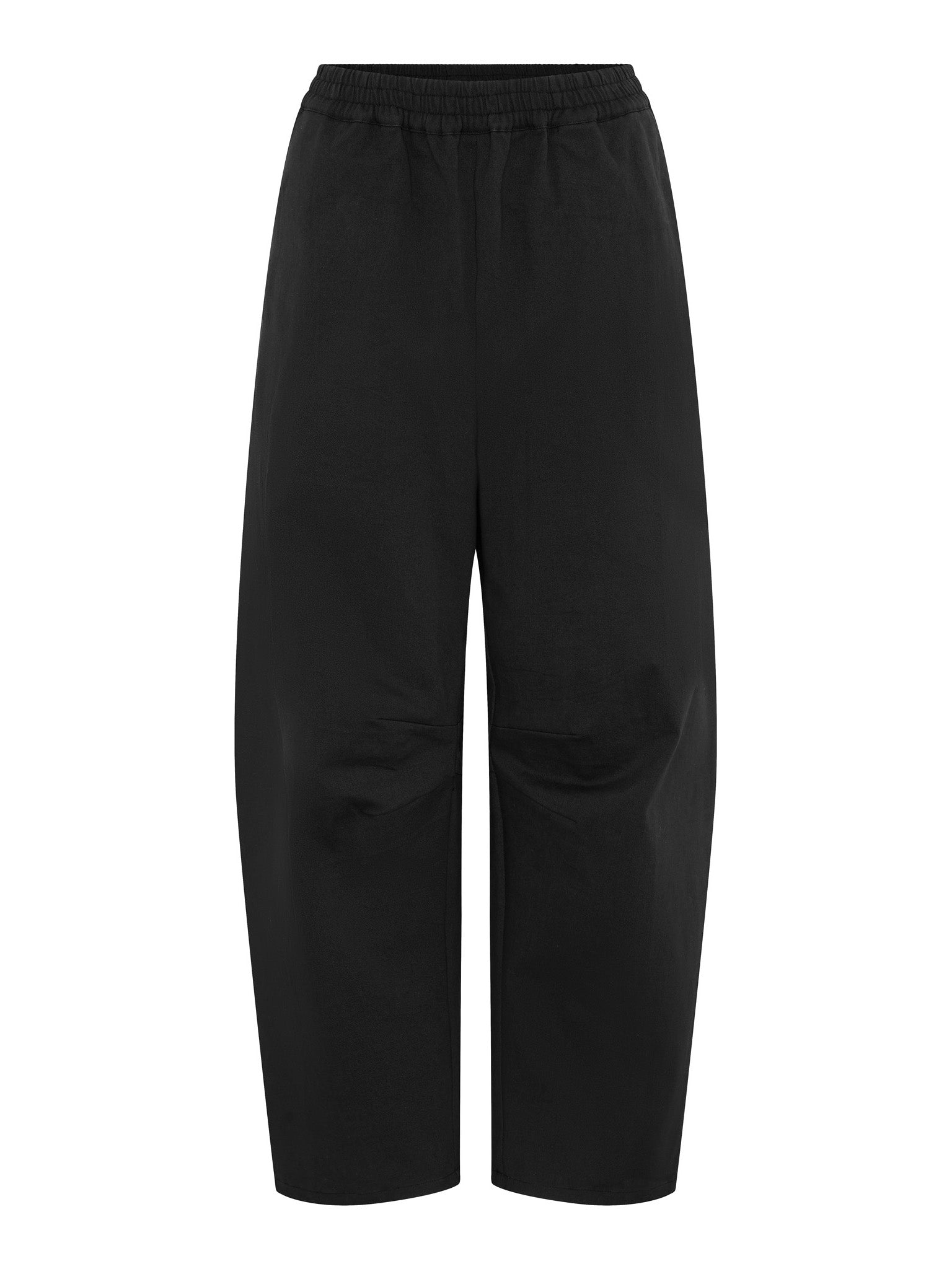 Crafted from breathable cotton in a classic black, Ezra features a comfy elasticated waist and a curved barrel leg for that laid-back yet elevated silhouette. Pair with anything from a fun blouse to your favourite tee ; these trousers are the perfect minimalist foundation piece.