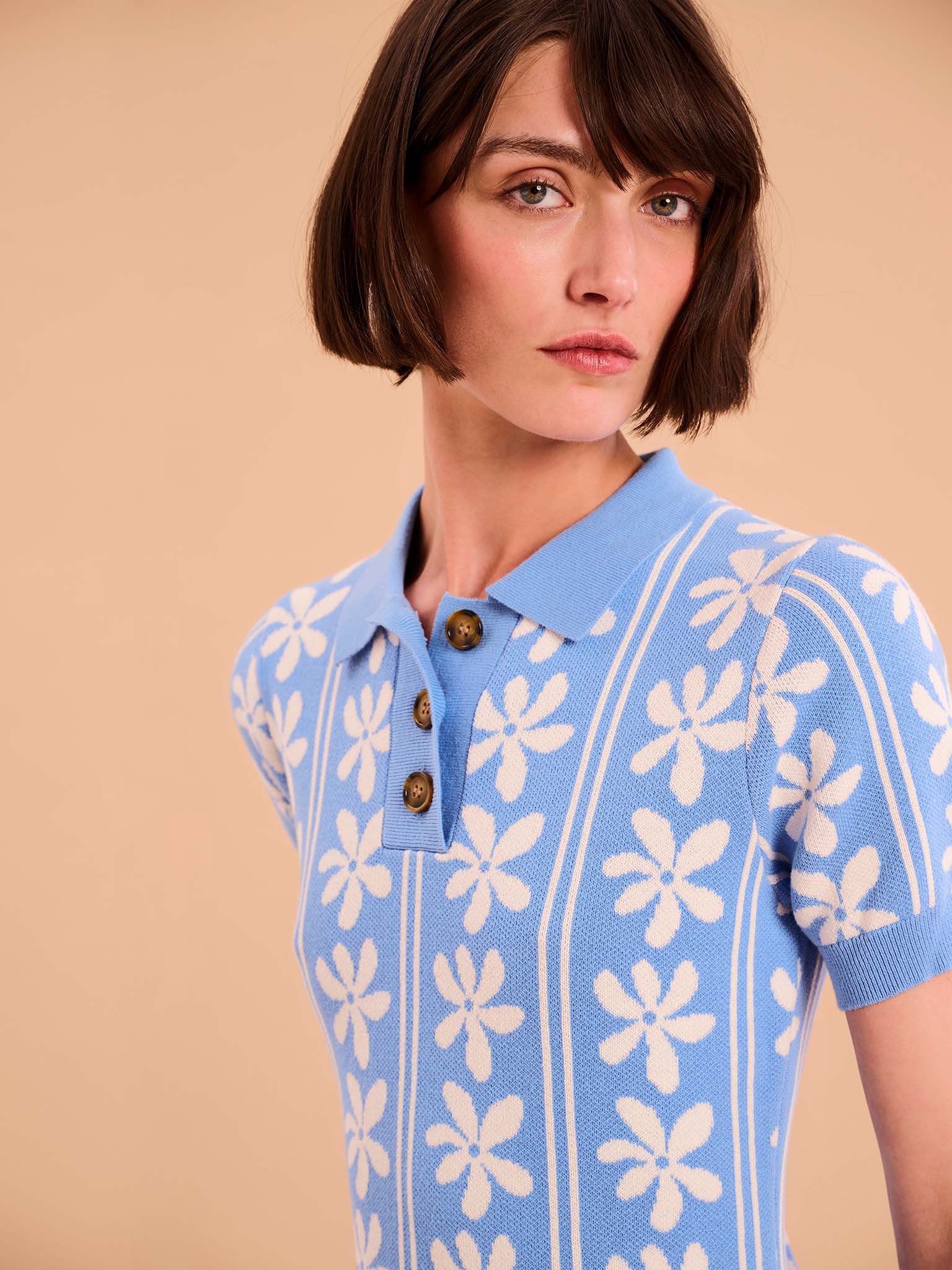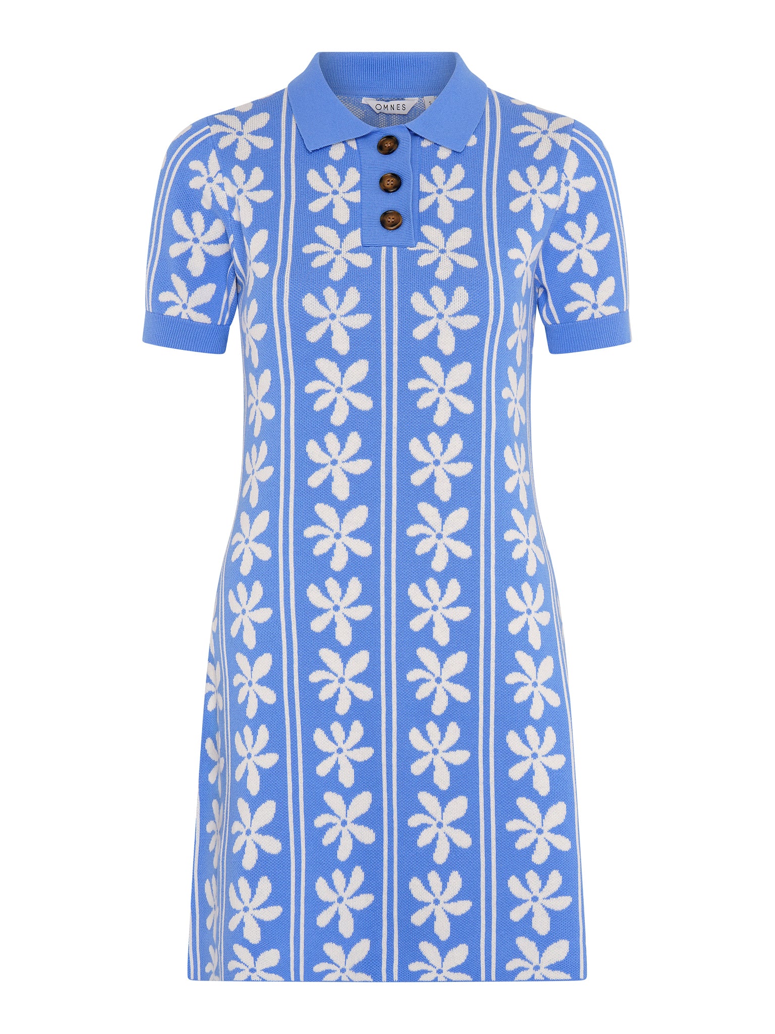 Woven from soft BCI member cotton in a dreamy palette of cornflower blue and creamy, Fable is a short-sleeved, knitted mini dress with an illustrative floral print. She’s got a mini collar and button detail at the neckline, a nod to the classic polo. Her name might be fable but we promise she’s just as cute in reality.