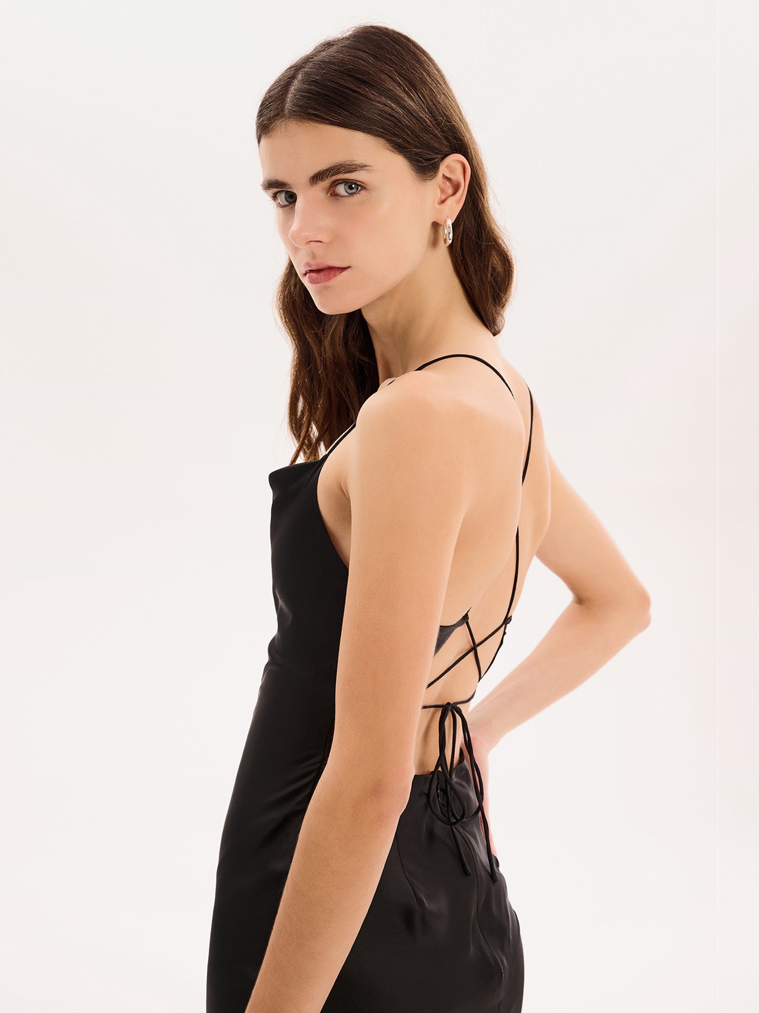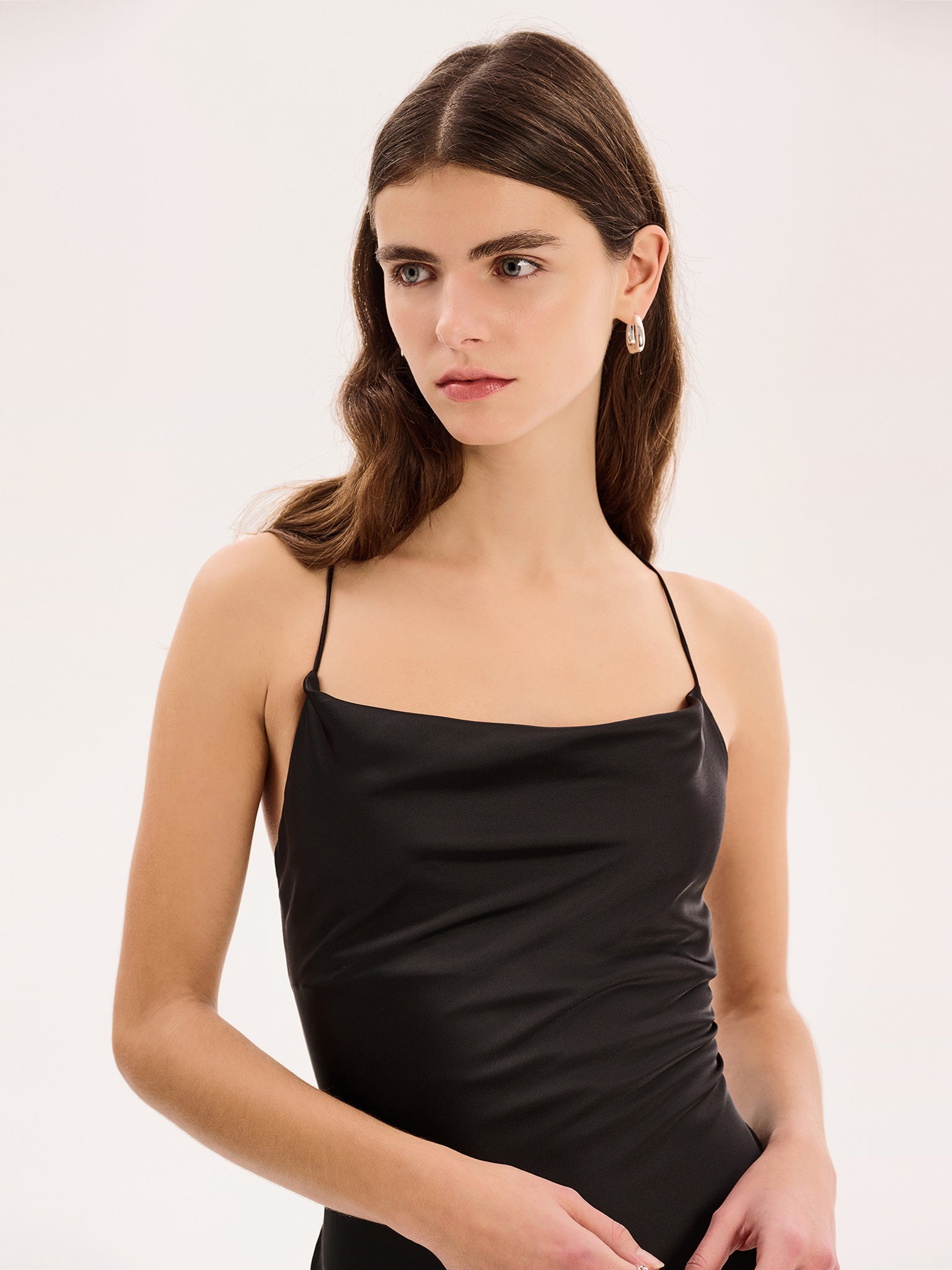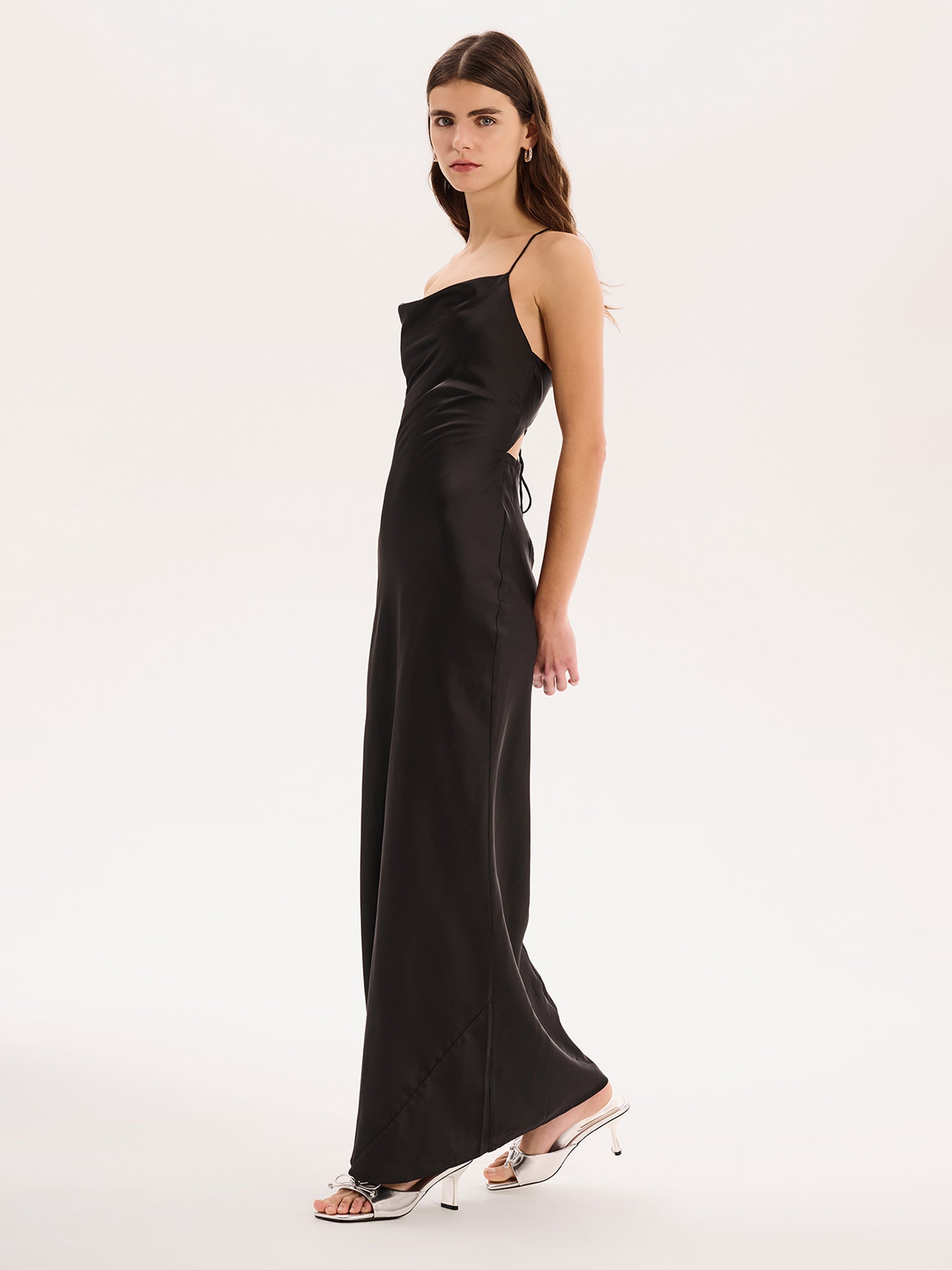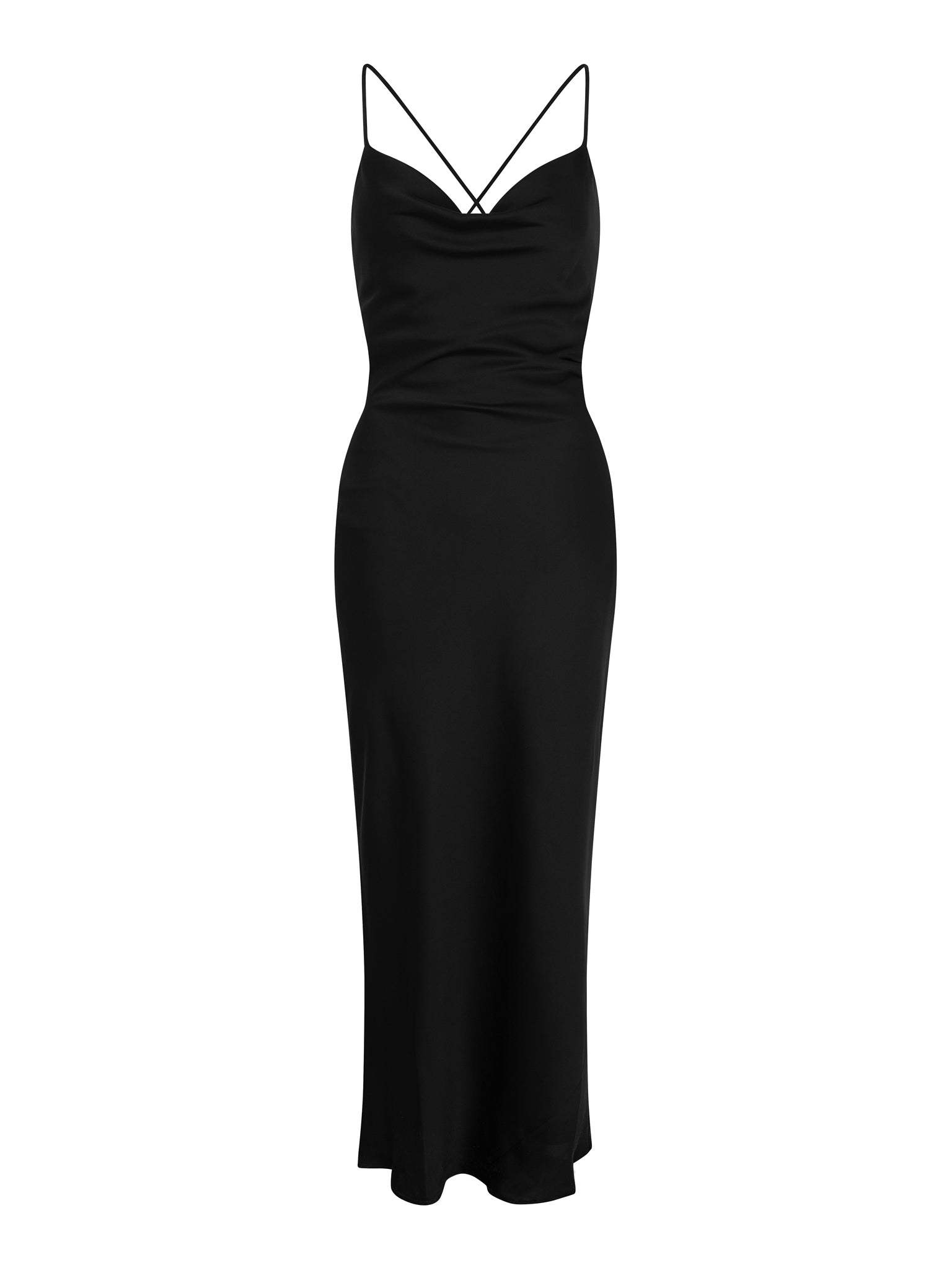 Ginny is an update on our classic Riviera in a gorgeous new maxi-length. She's got the same cowl neck and backless lace-up detail and is crafted from our signature slinky satin made using 100% recycled polyester. In a sultry black shade, Ginny is the perfect dress for when you feel like keeping it paired-back but chic.