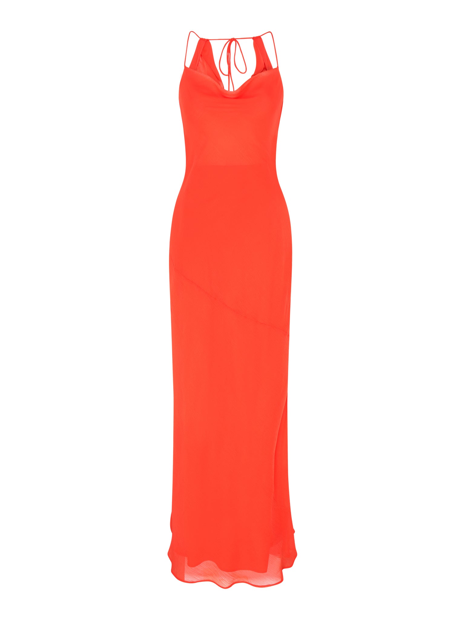 Koko is a slinky slip maxi dress in a floaty recycled polyester chiffon. She’s designed with a deep cowl back with tie detail adding just a touch of drama to the otherwise simple silhouette. In a vibrant orange, Koko is the kind of dress that makes a room take notice.