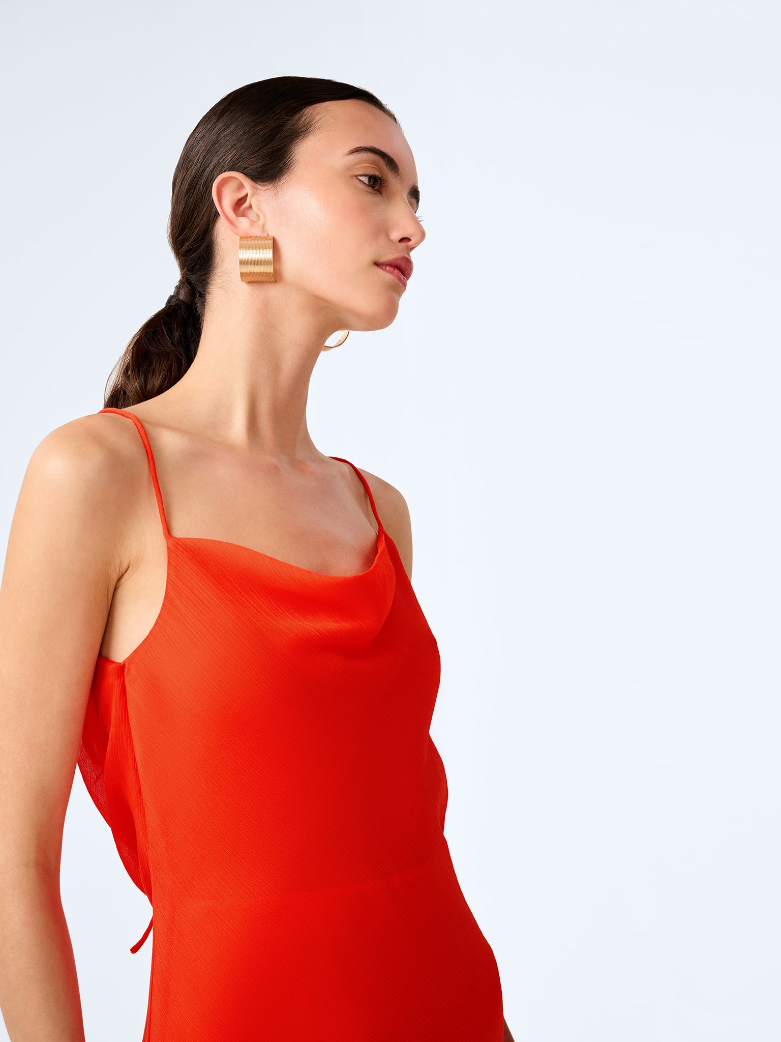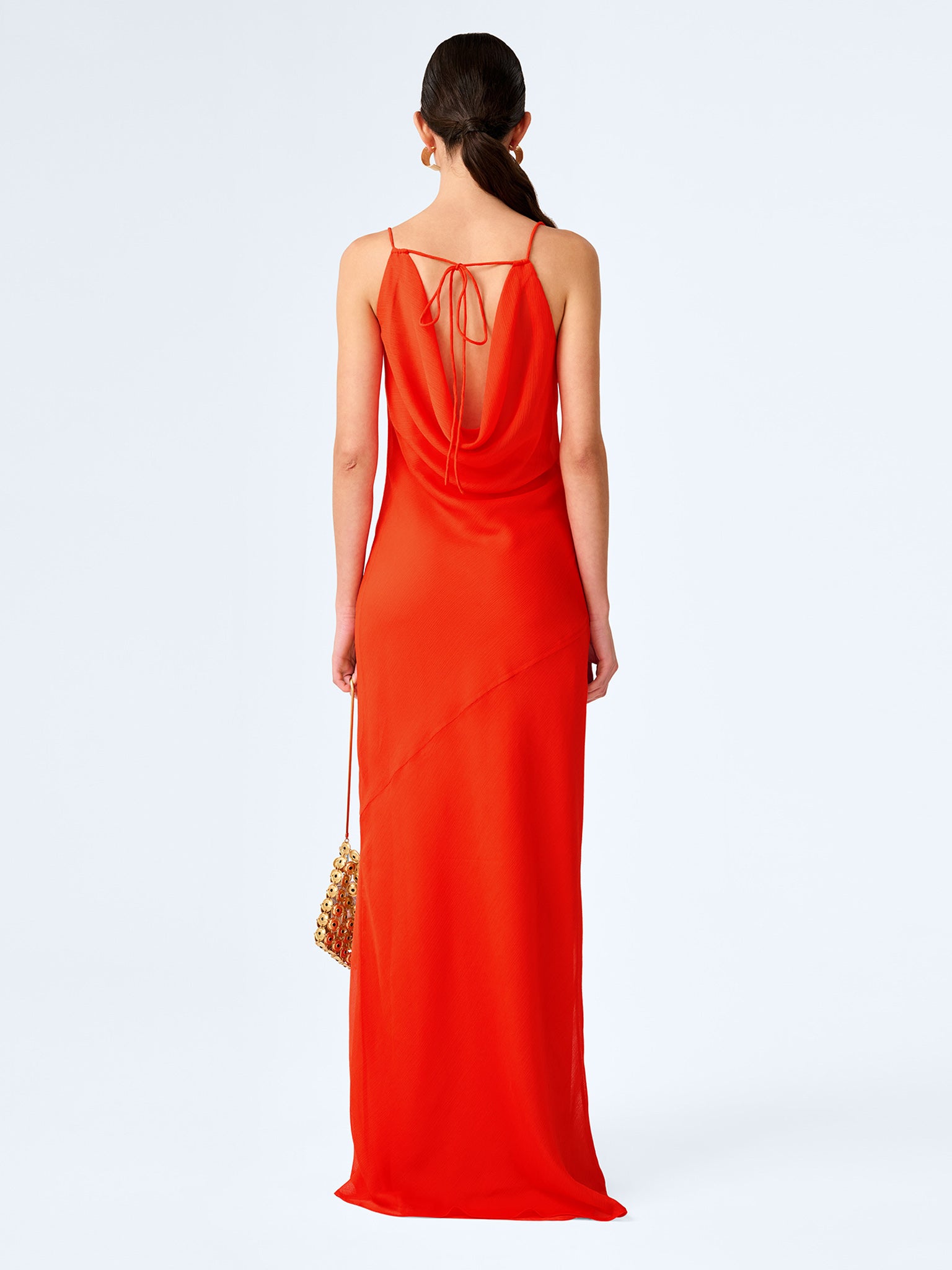 Koko is a slinky slip maxi dress in a floaty recycled polyester chiffon. She’s designed with a deep cowl back with tie detail adding just a touch of drama to the otherwise simple silhouette. In a vibrant orange, Koko is the kind of dress that makes a room take notice.