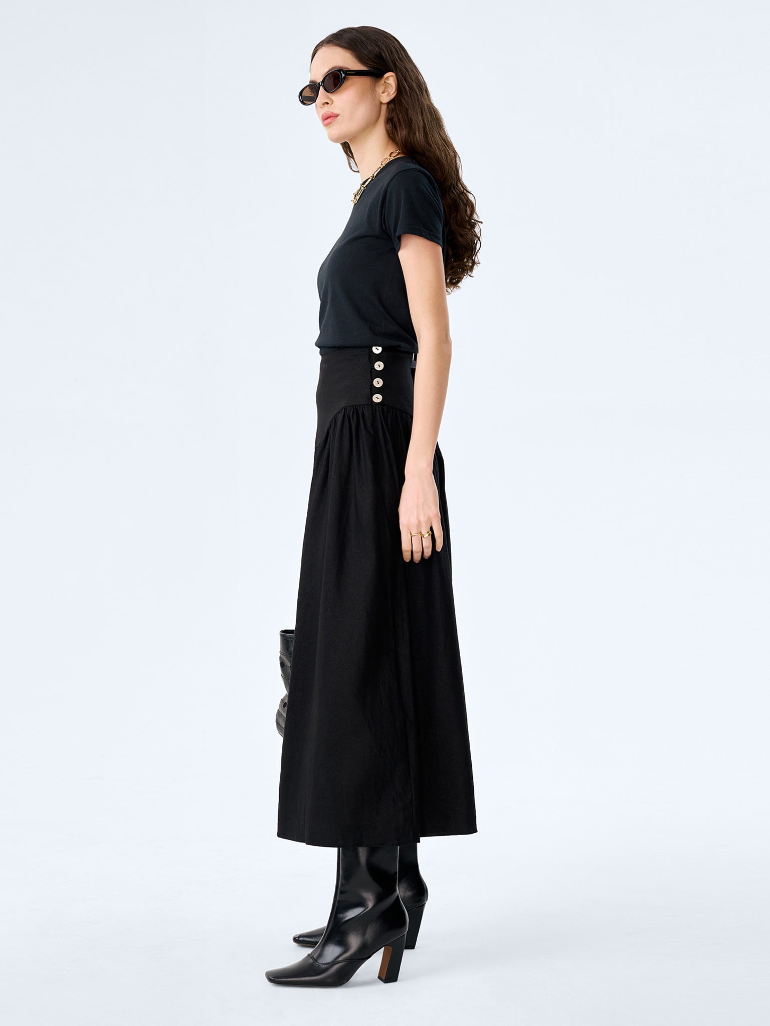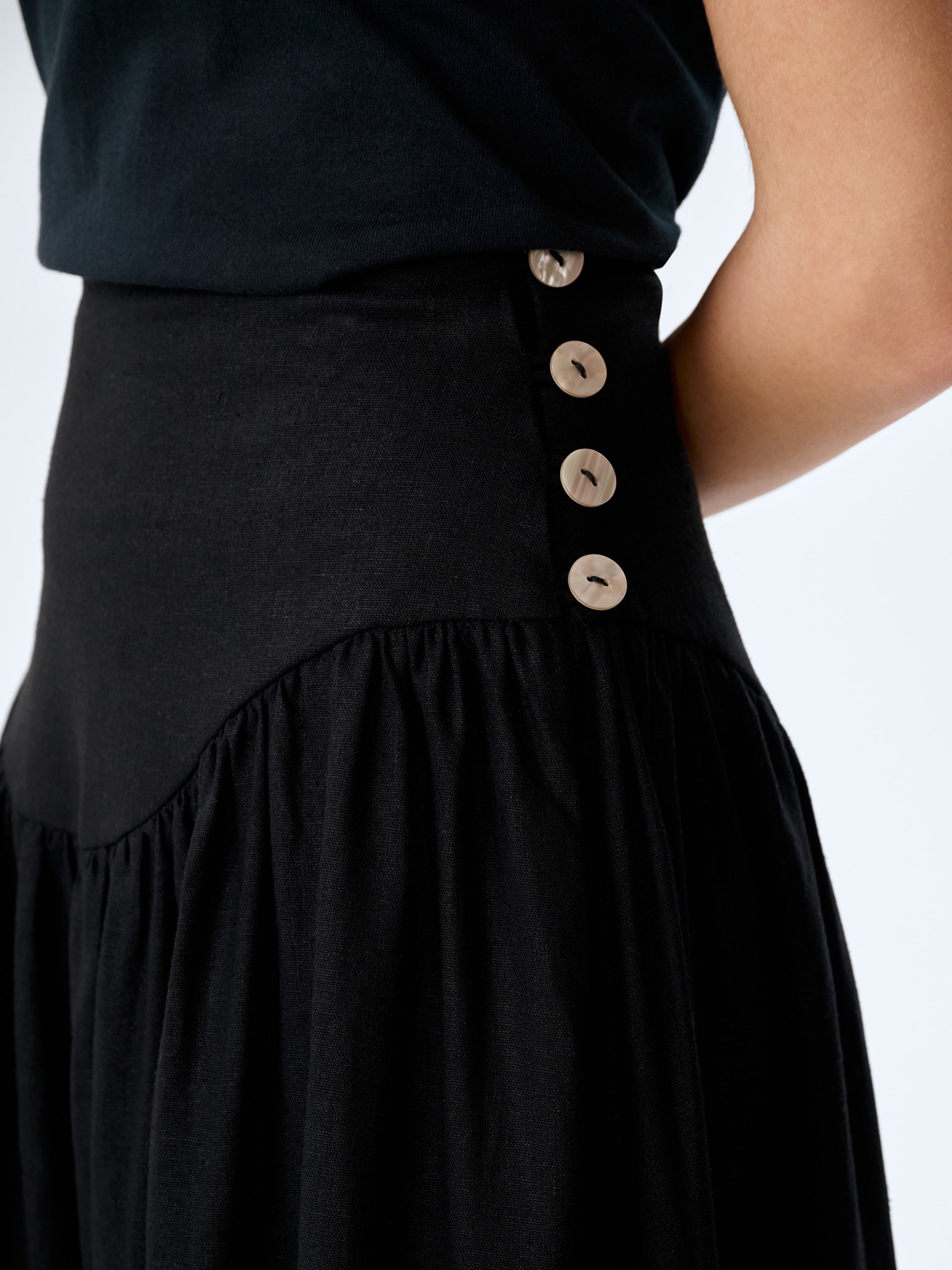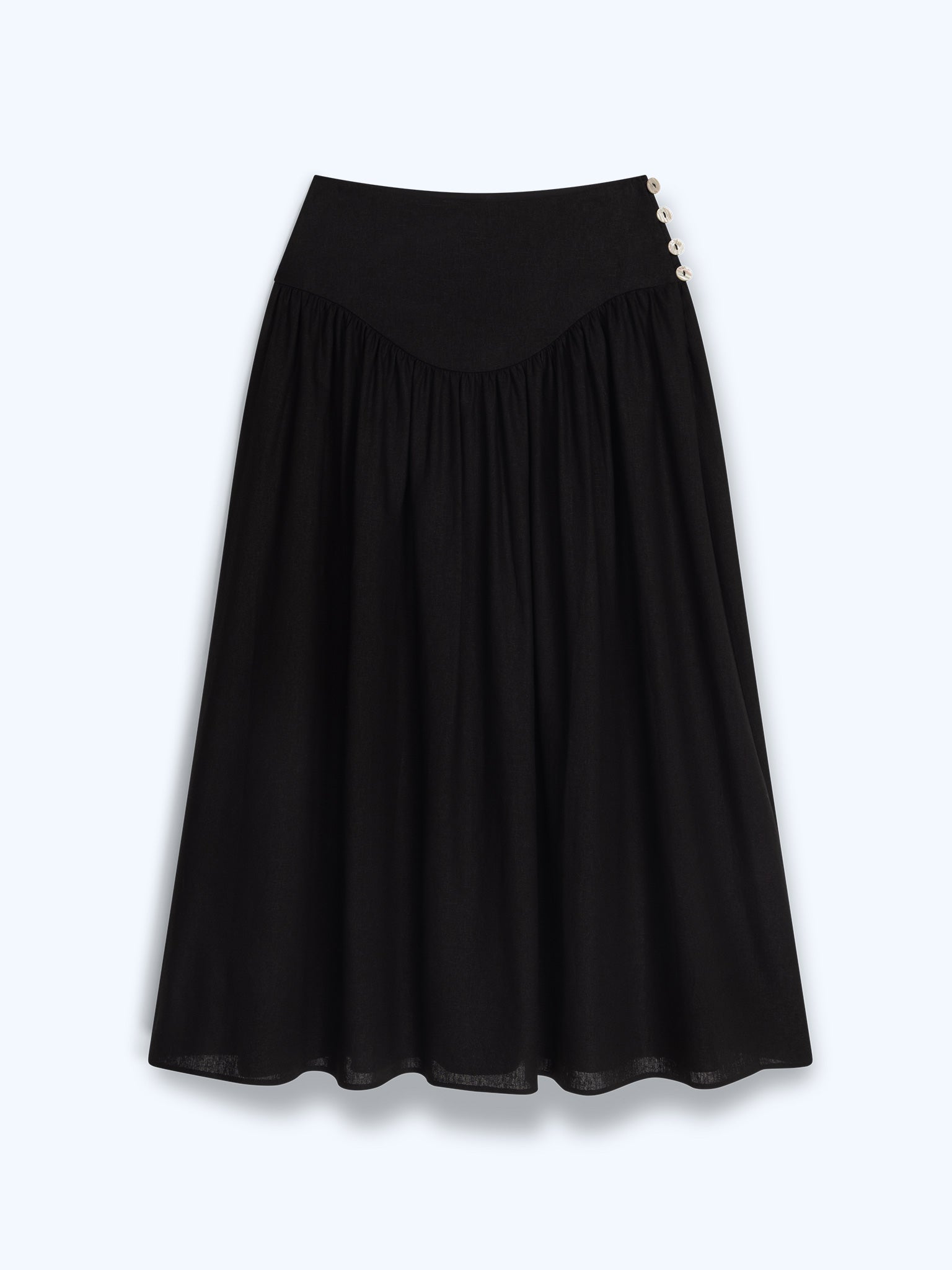 The Lucille skirt combInez structure with softness. Crafted from light linen, this midi skirt features a flattering drop waist that flows into a full, swishy skirt to create volume and enhance your natural silhouette. Designed in black, a side button fastening keeps the finish clean. Dress her up or down, Lucille is perfect for everything from casual days to date nights.