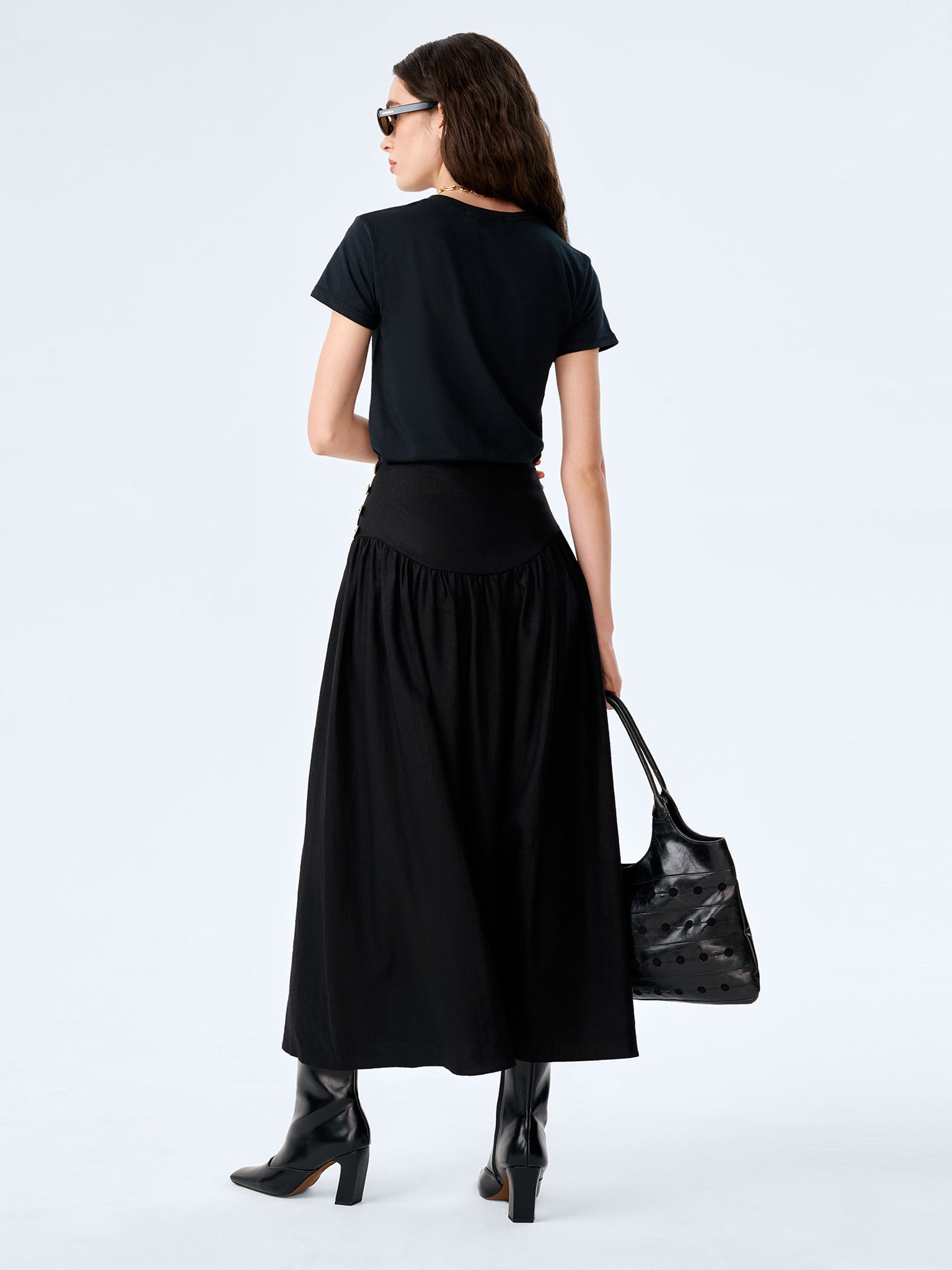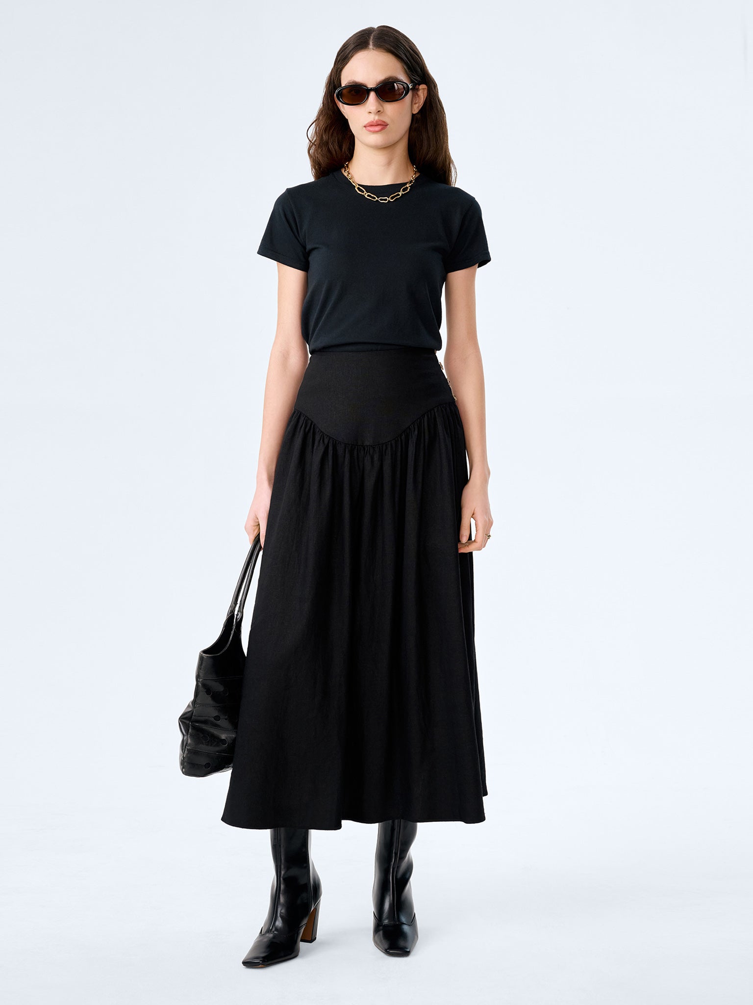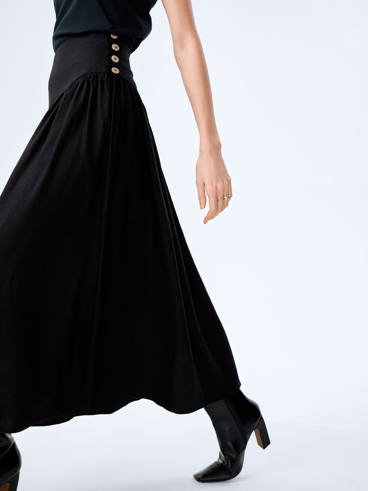 The Lucille skirt combInez structure with softness. Crafted from light linen, this midi skirt features a flattering drop waist that flows into a full, swishy skirt to create volume and enhance your natural silhouette. Designed in black, a side button fastening keeps the finish clean. Dress her up or down, Lucille is perfect for everything from casual days to date nights.
