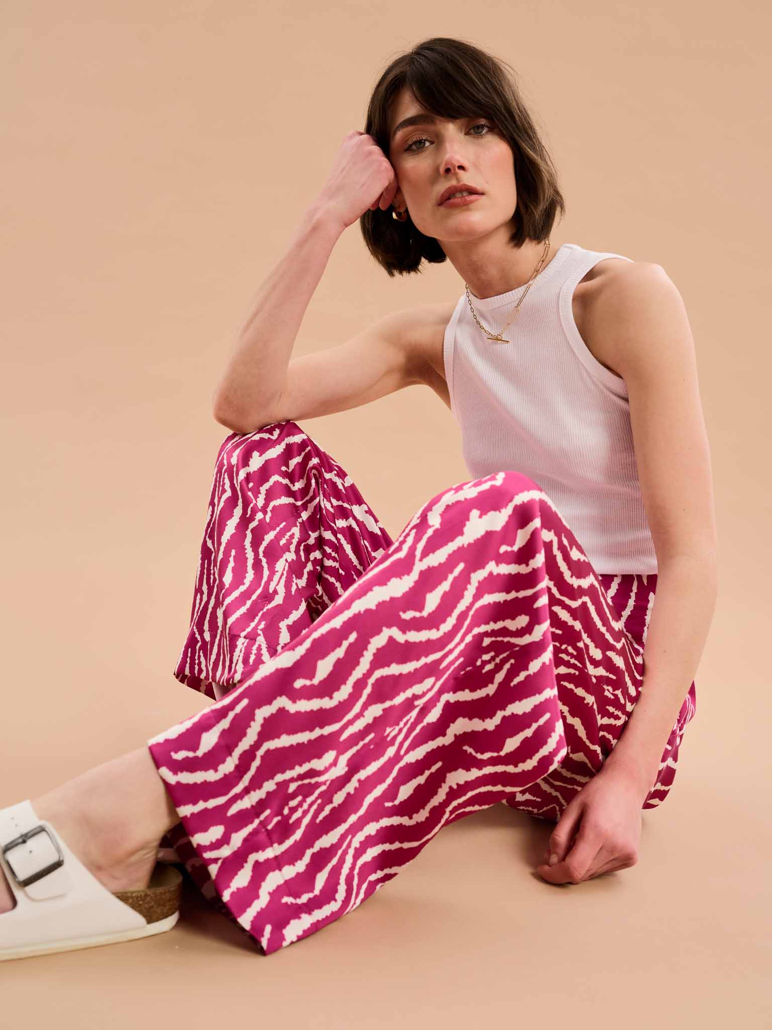 High-waisted and wide-legged, Lynx is a trouser with personality. Crafted from slinky recycled polyester satin with a bold, magenta zebra print she’s giving pure summer vibes. Wear with a simple white tee or get wild with pattern clashing for an adventurous aesthetic.