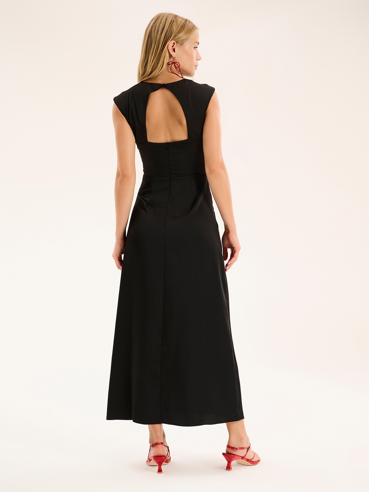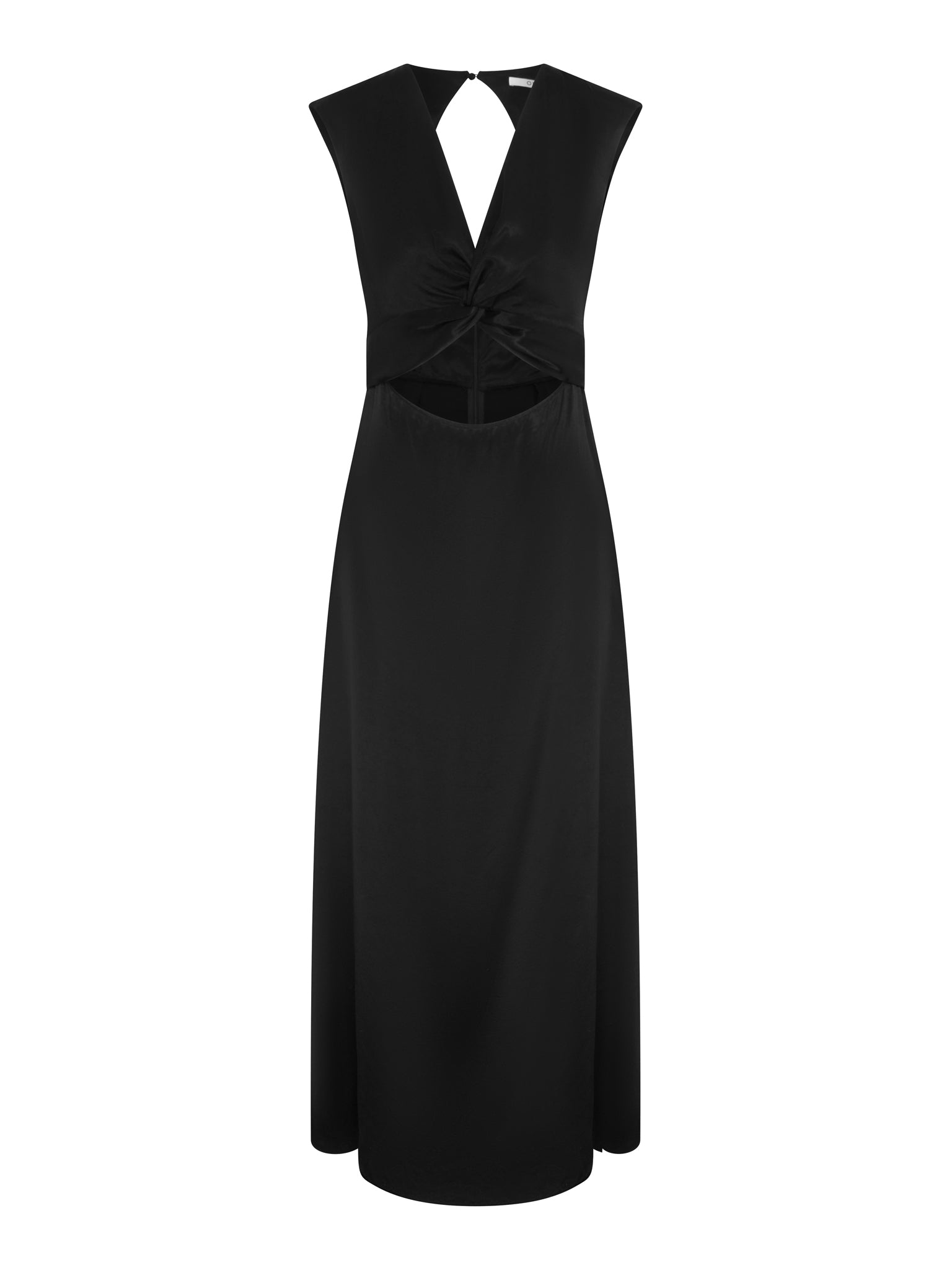 A little something extra. The Marin is your perfect occasion dress but with a twist front, v-neck and cutout under the bust. In timeless black with a peek-a-boo cut-out detail at the back, she is giving a fresh take on a classic silhouette