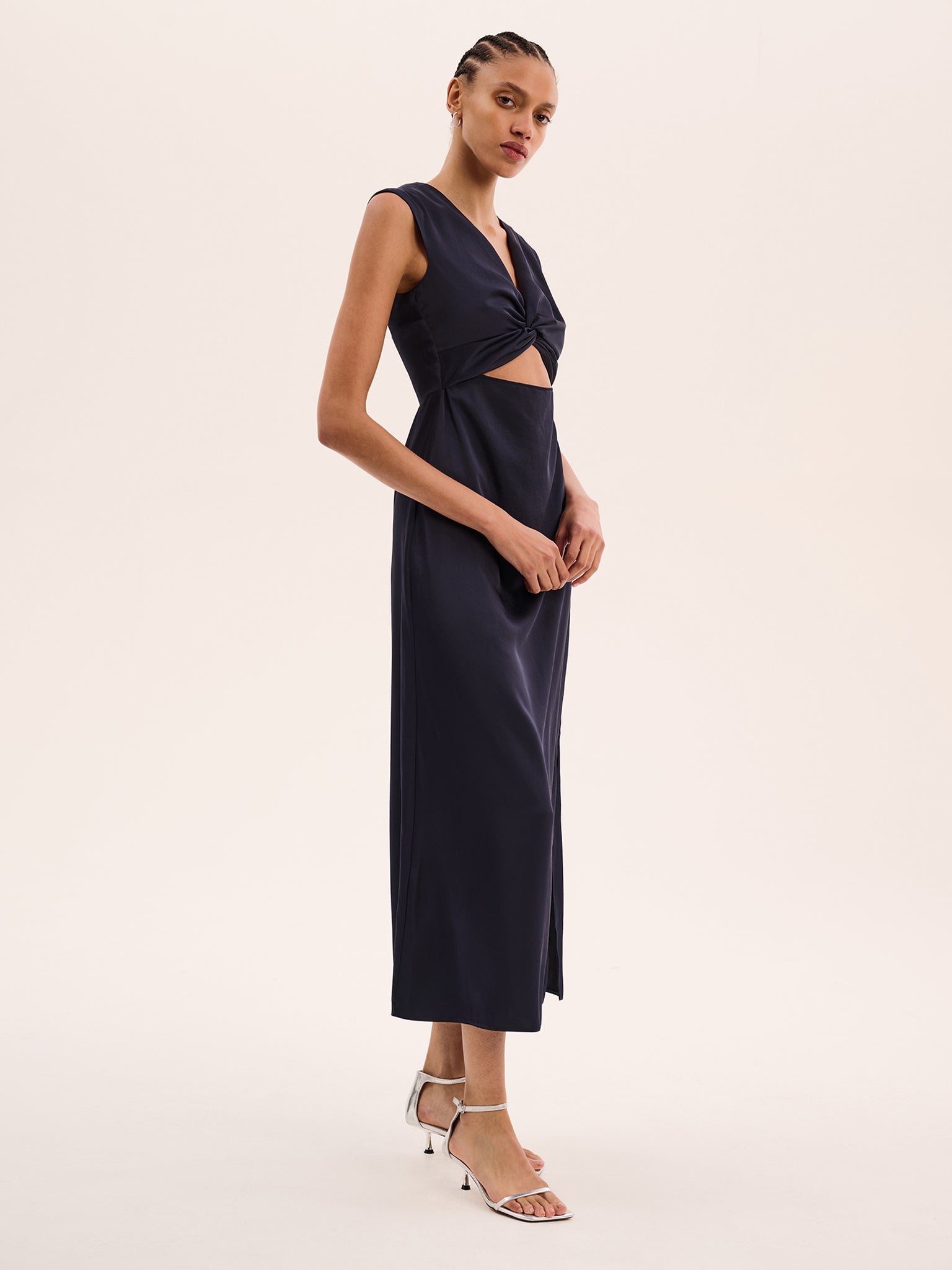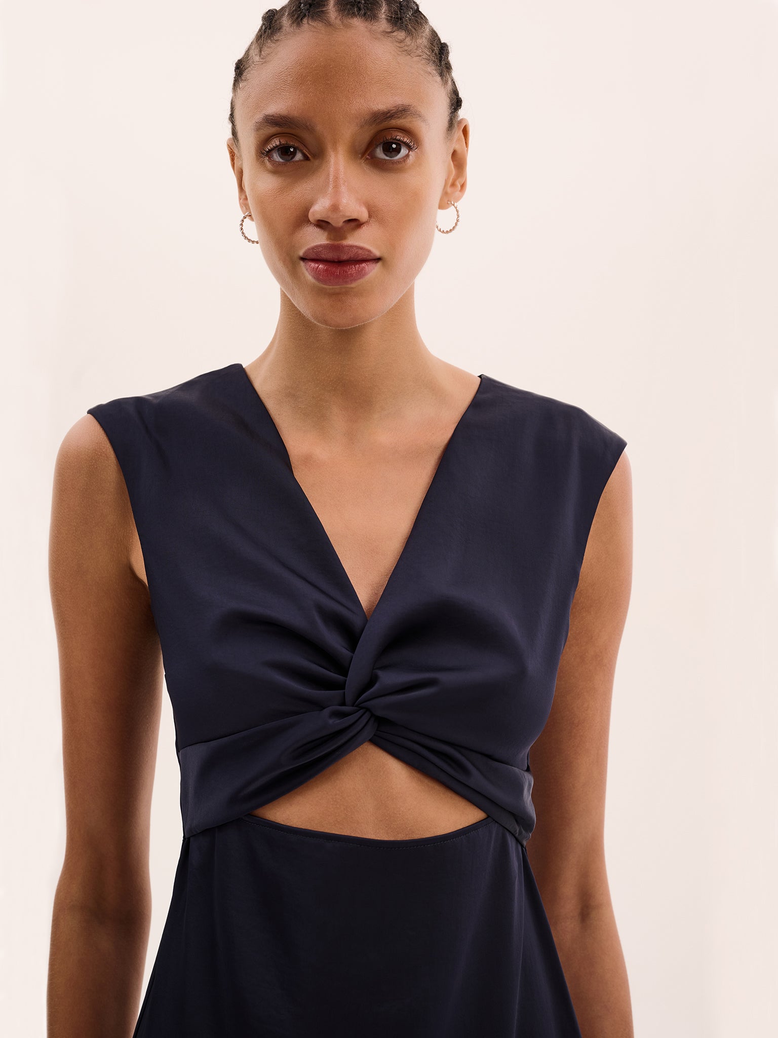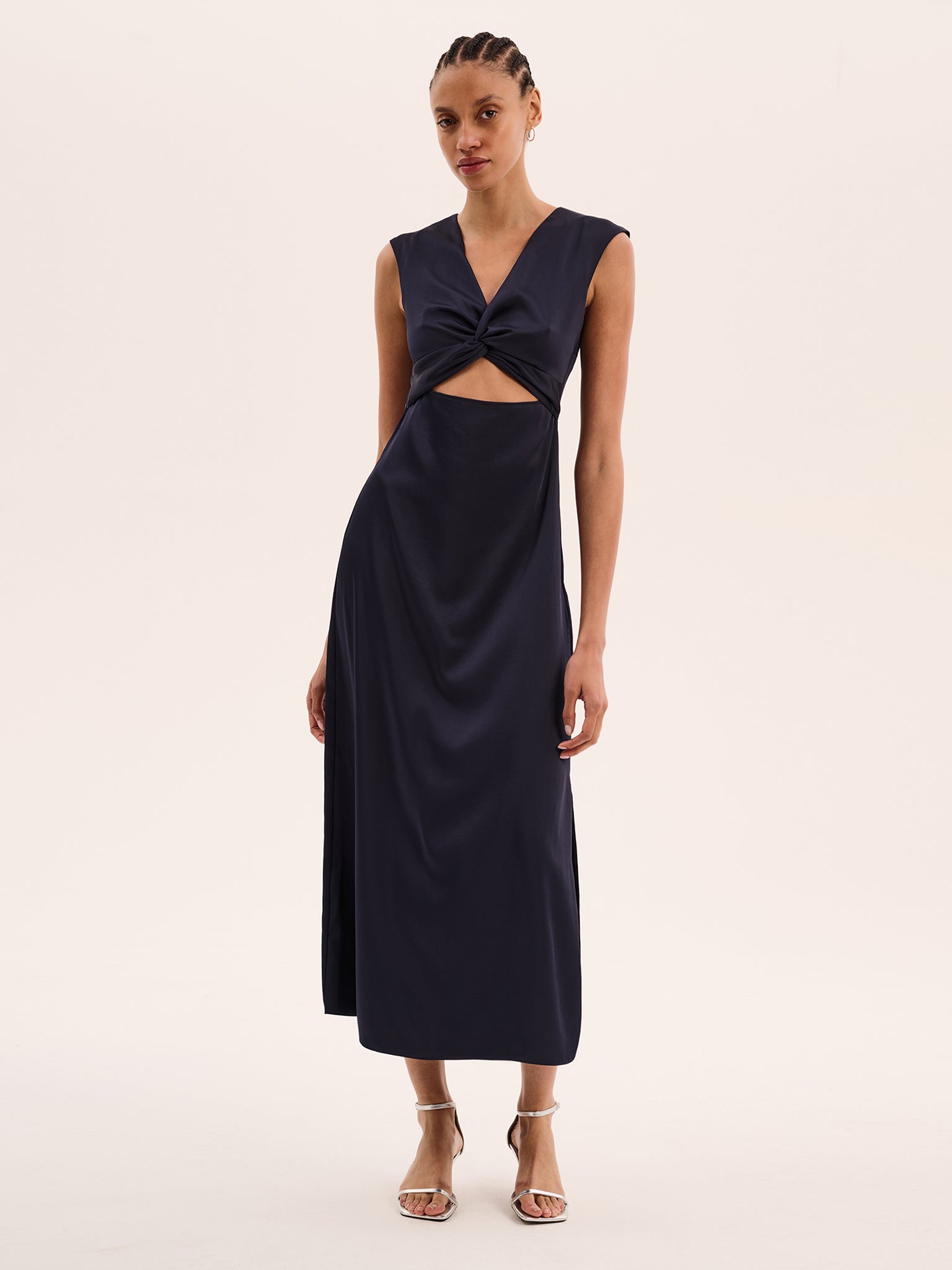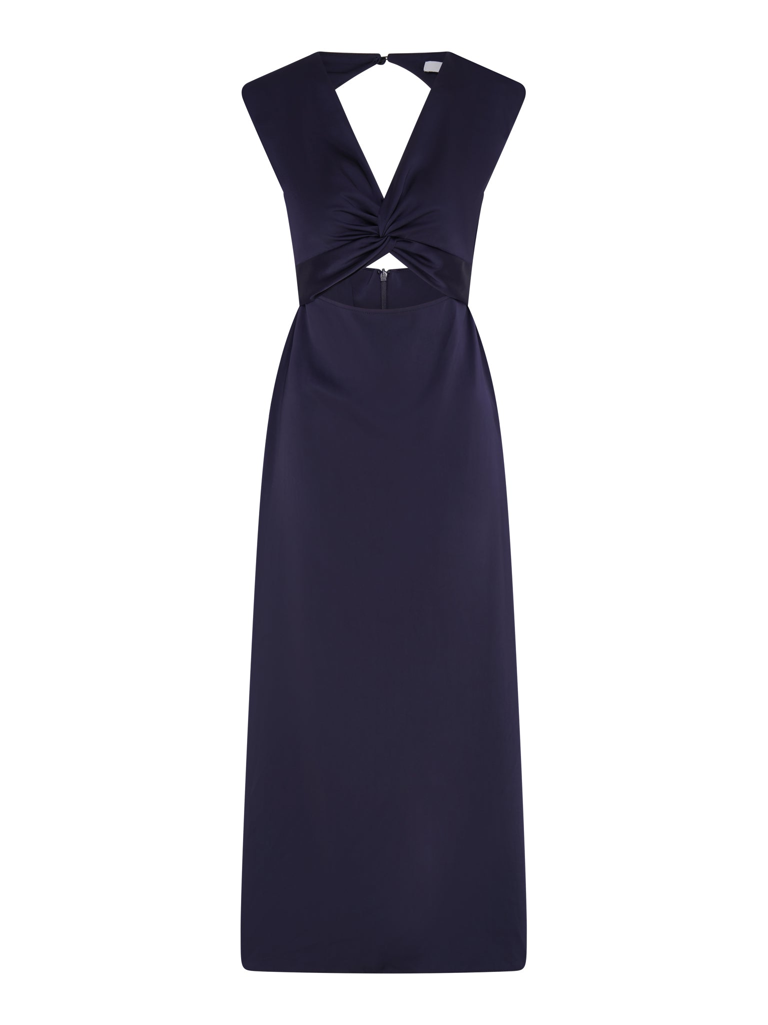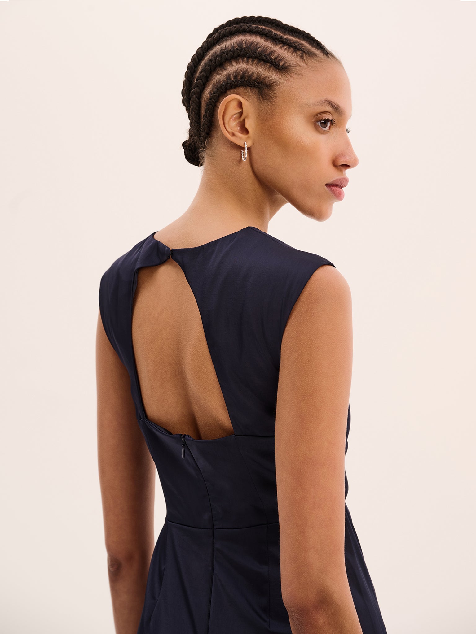 A little something extra. The Marin is your perfect sustainable satin occasion dress but with a twist front, v-neck and cutout under the bust. Crafted in opulent navy with a peek-a-boo cut-out detail at the back, she is giving a fresh take on a classic silhouette.