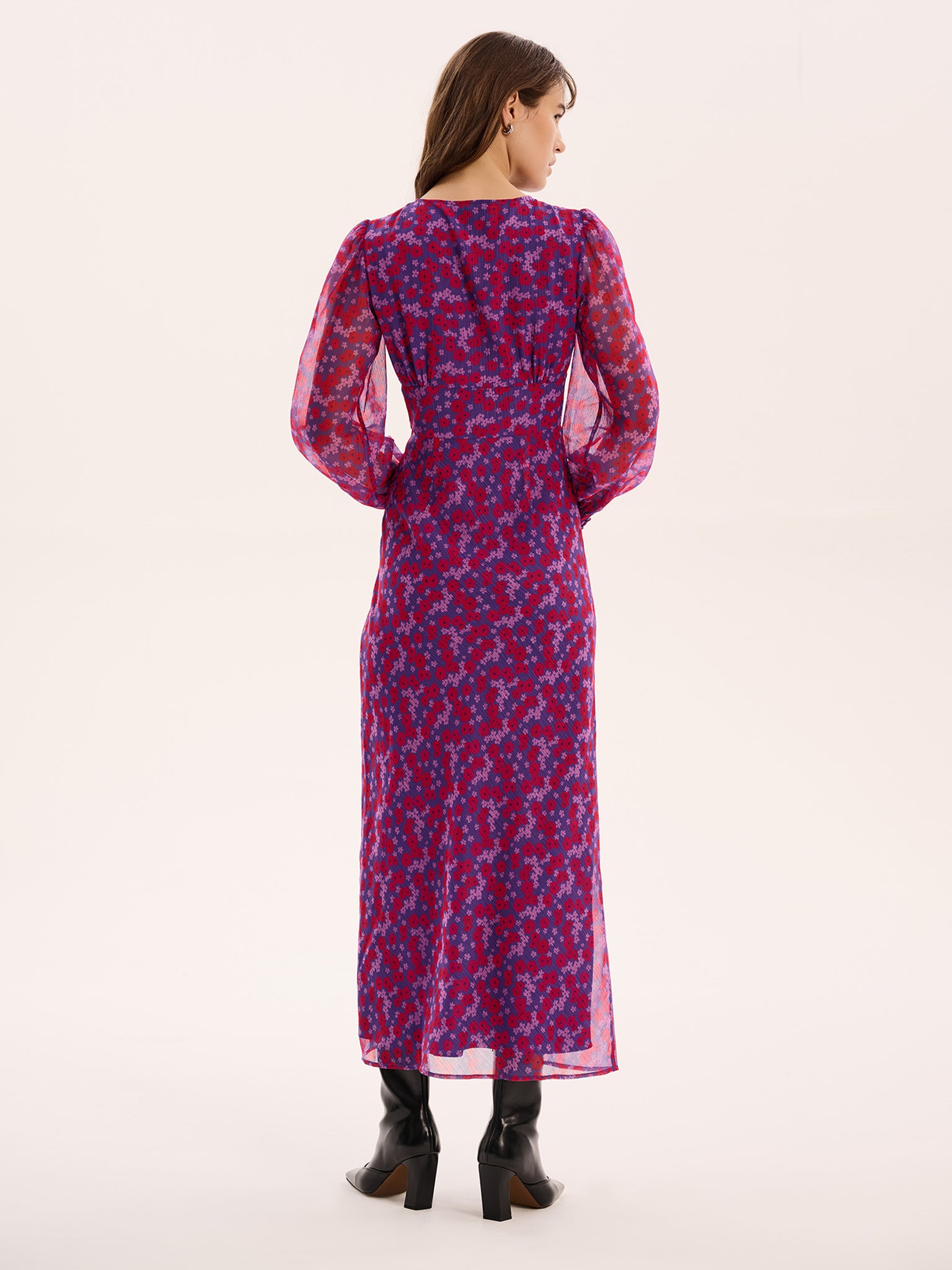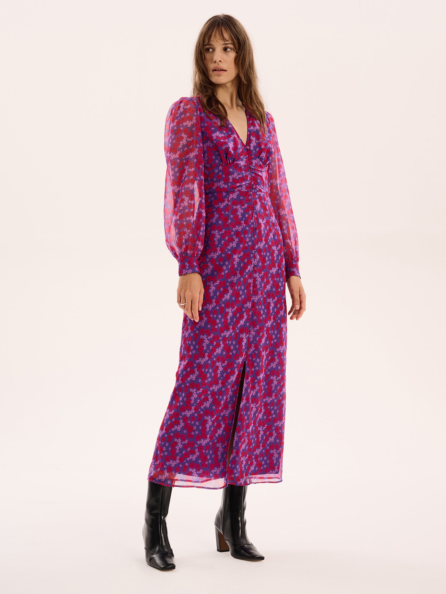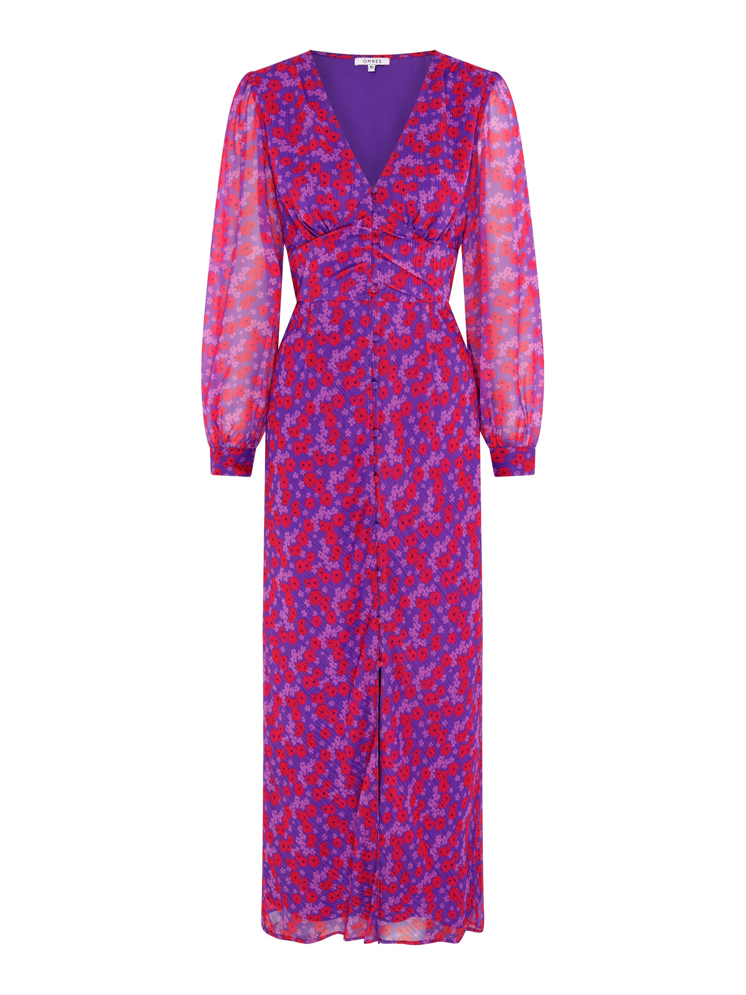 Mary-Rose is a vintage-inspired silhouette crafted from 100% recycled polyester chiffon in a purple and red illustrated floral print. This sweet maxi dress is designed with a button front and slight balloon sleeve.