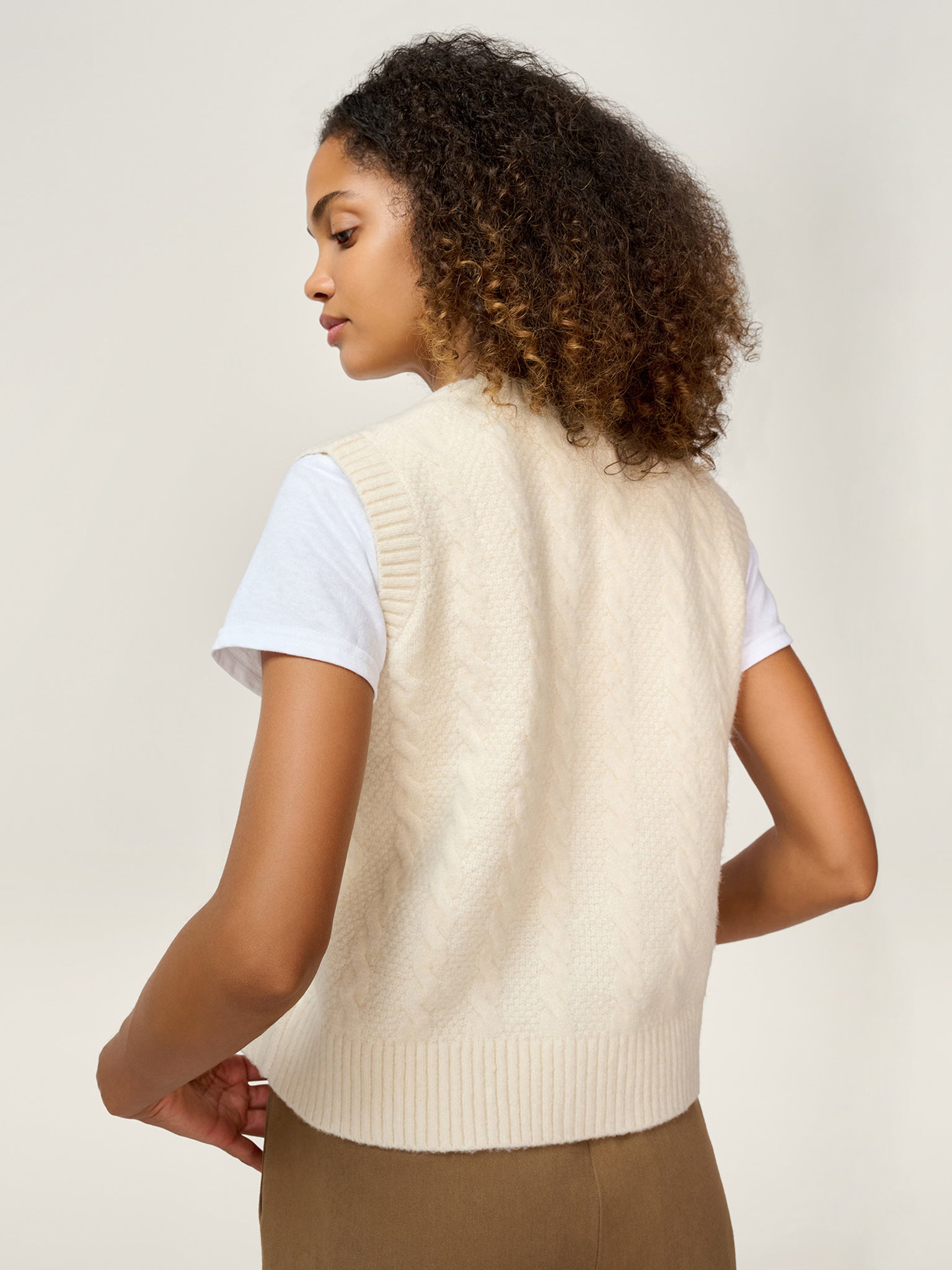 The Matilda Vest is a celebration of craftsmanship and texture, featuring an artful mix of stitch patterns. Thoughtfully arranged grid stitch and classic cable knit panels add personality and dimension to this cosy and contemporary piece. Crafted from soft yarns, it’s designed with a relaxed fit for easy everyday layering.