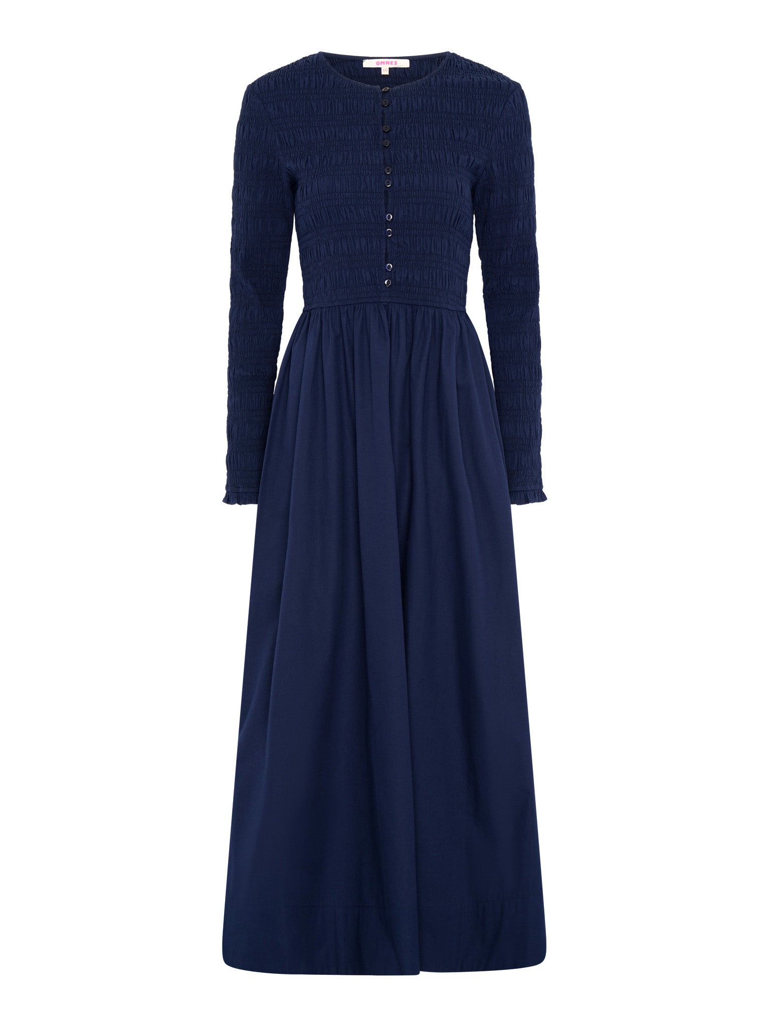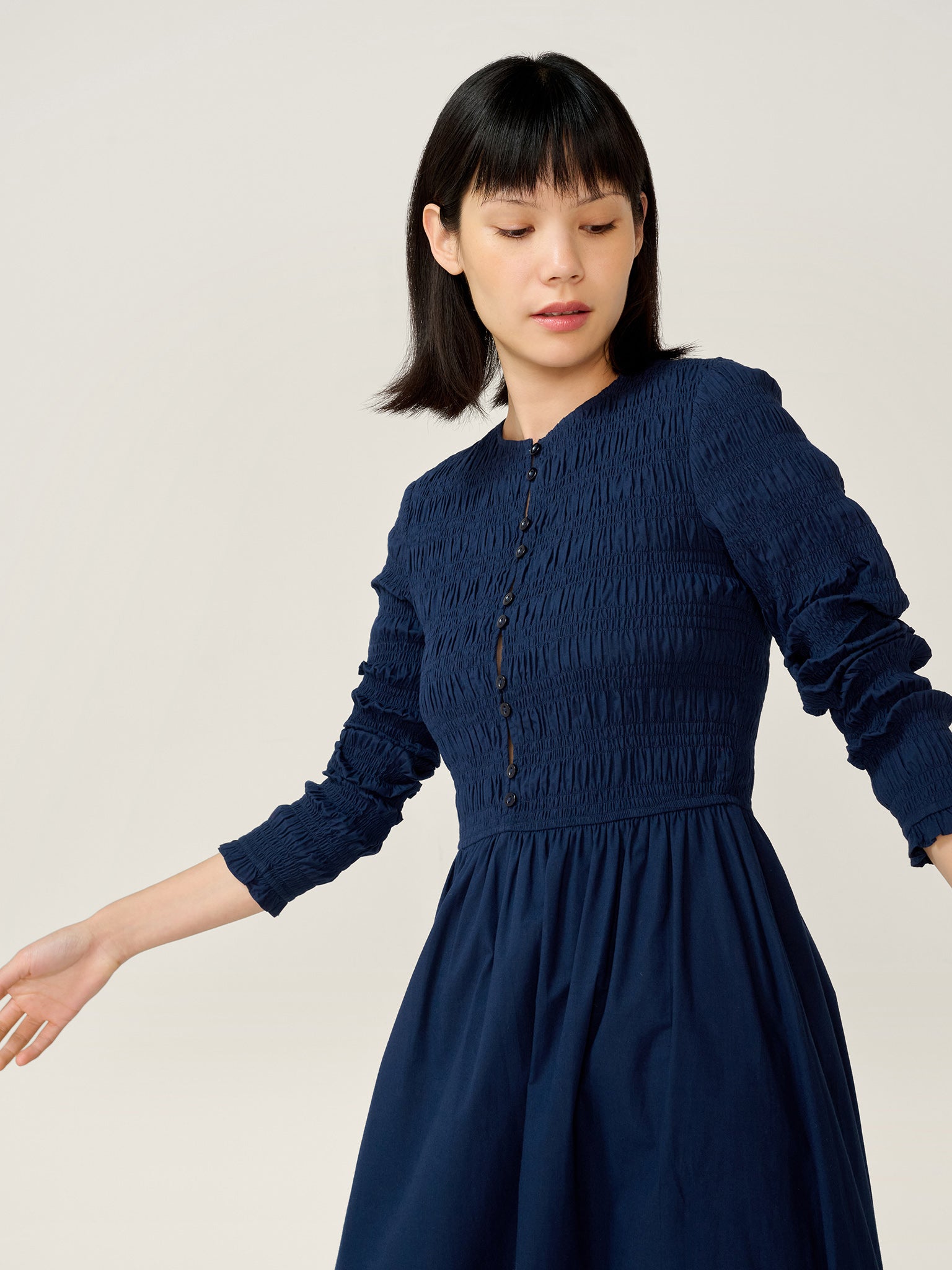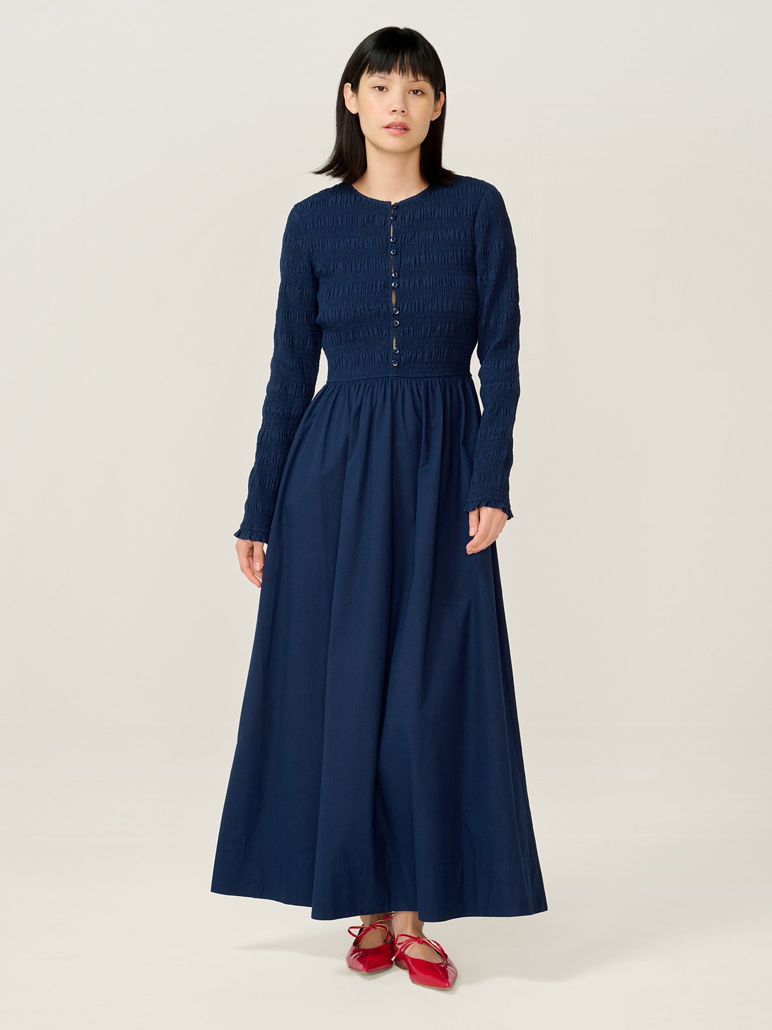 Mina is your go-to for easy elegance. Designed with a shirred top for a flattering, flexible fit, she features full-length sleeves finished with a delicate ruffle and button detailing down the front. The full skirt adds gentle volume, making her perfect for everything from farmers market mornings to laid-back dinners.