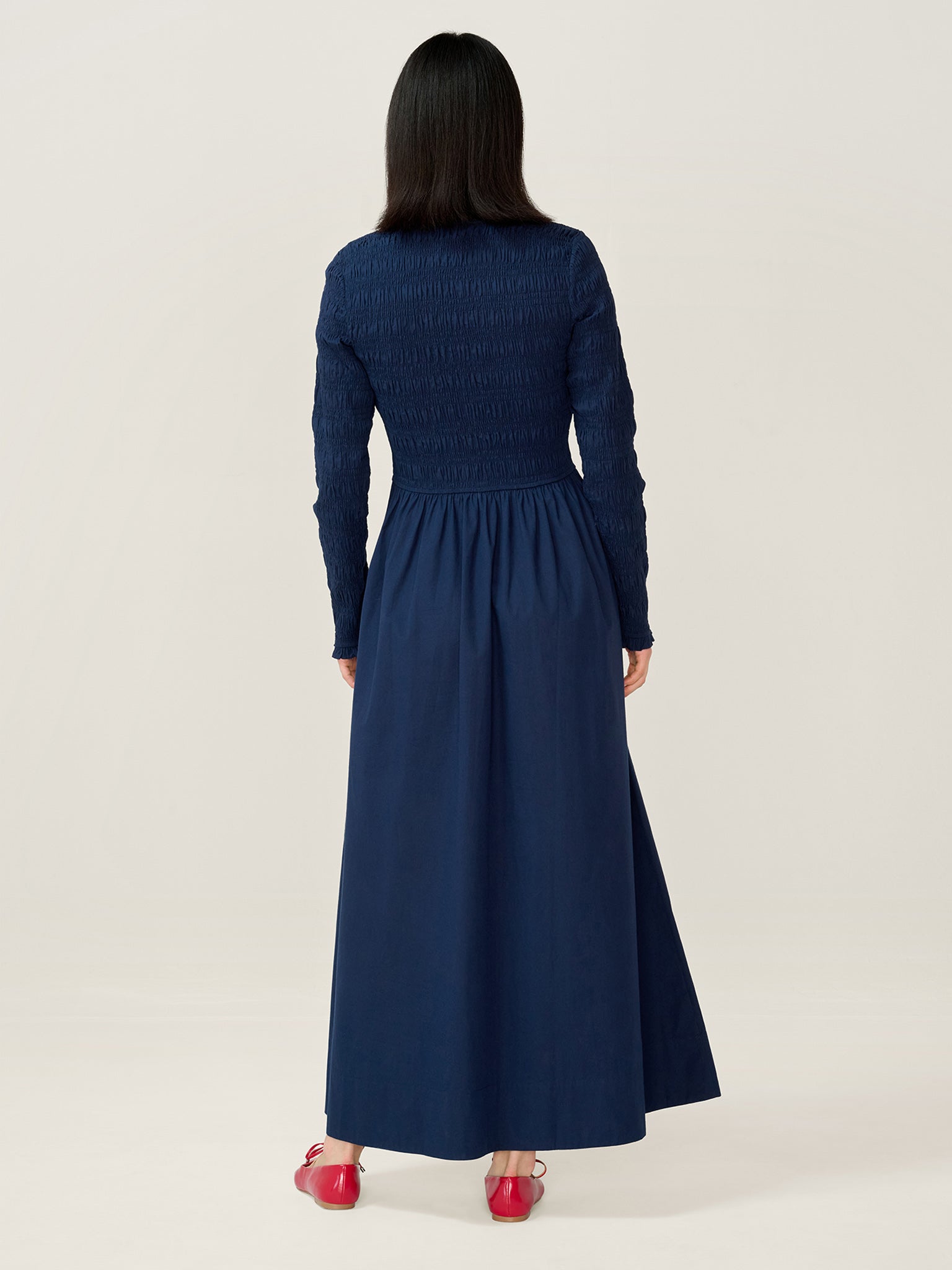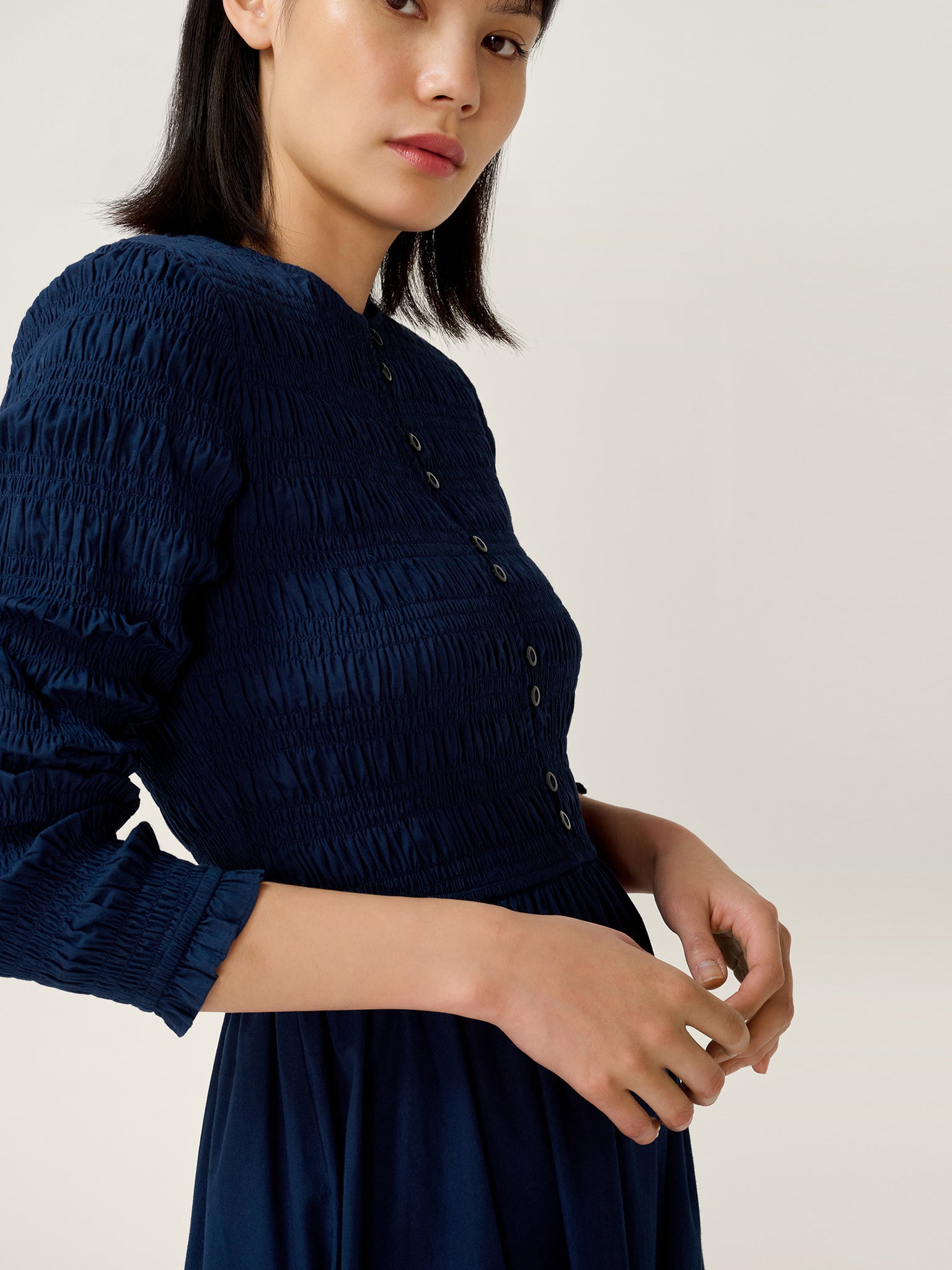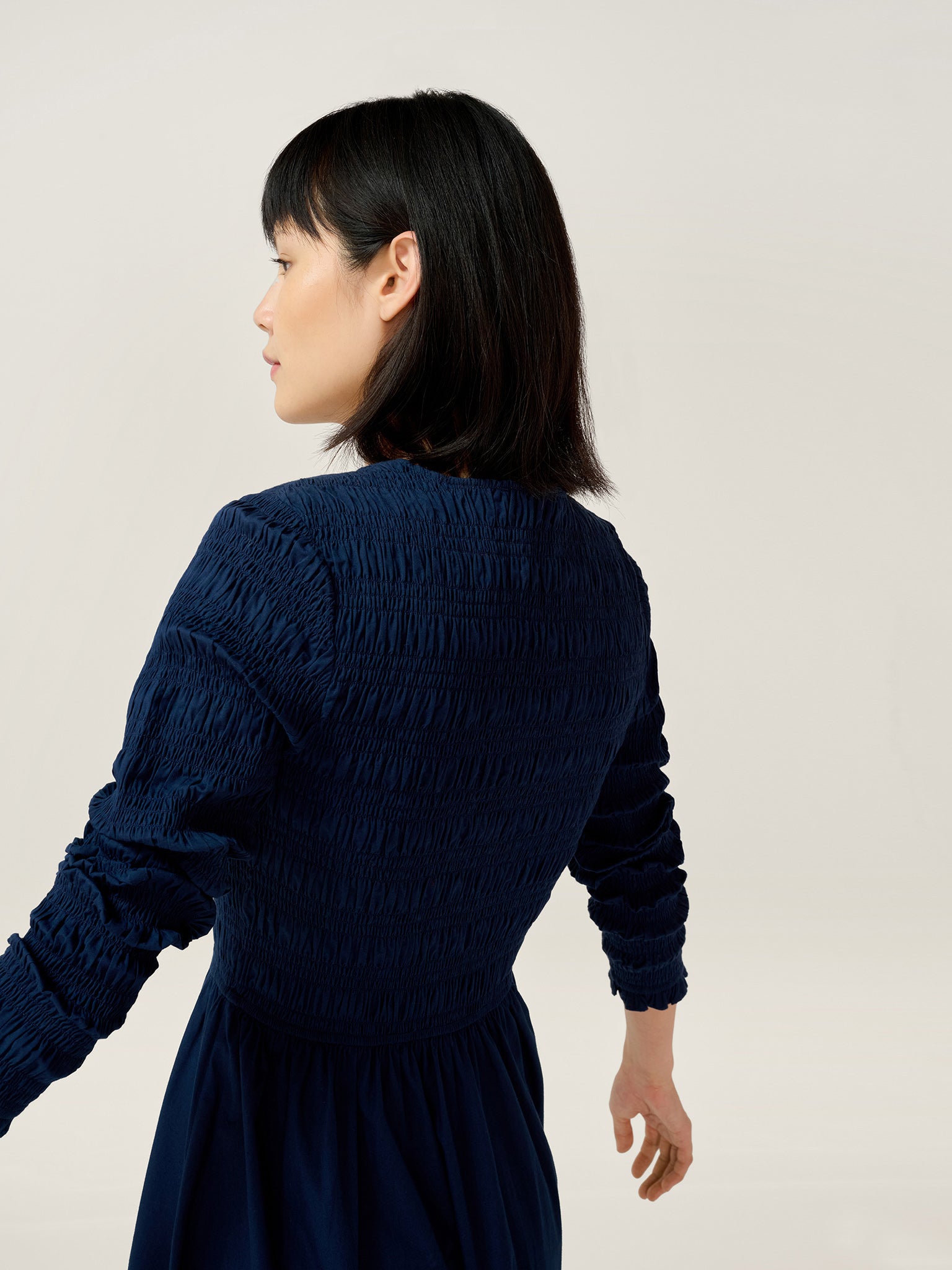 Mina is your go-to for easy elegance. Designed with a shirred top for a flattering, flexible fit, she features full-length sleeves finished with a delicate ruffle and button detailing down the front. The full skirt adds gentle volume, making her perfect for everything from farmers market mornings to laid-back dinners.