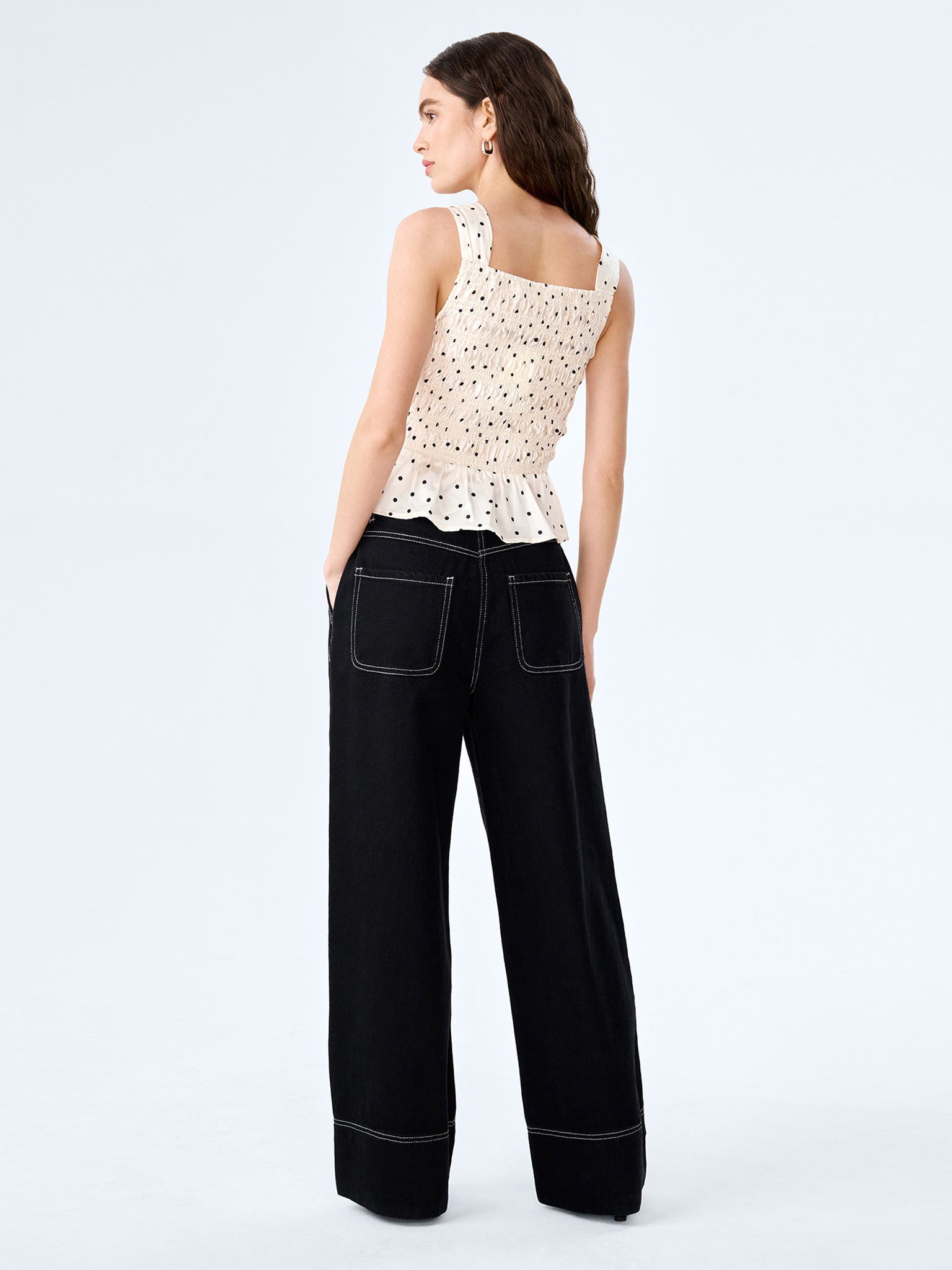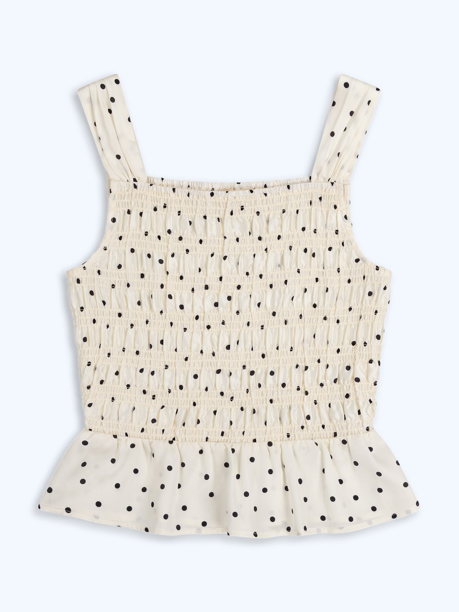 Romantic and refined, Rain is crafted from slinky white satin with a polka dot print for an elevated yet effortless look. Featuring an all-over shirred bodice for a flattering fit, this top is finished with soft ruffle detailing that adds movement and a hint of playful femininity. The sleeveless silhouette makes it perfect for layering or wearing solo.