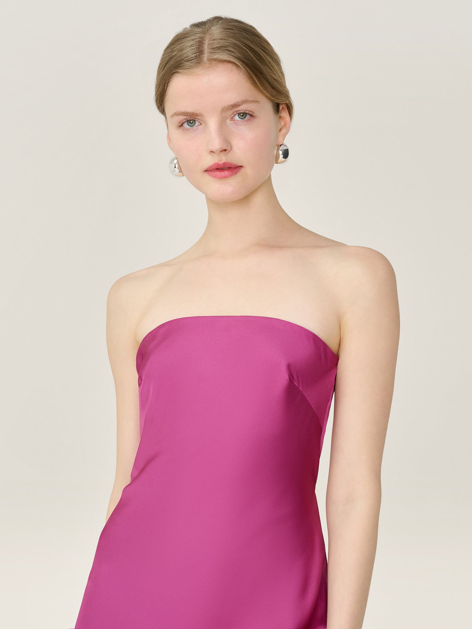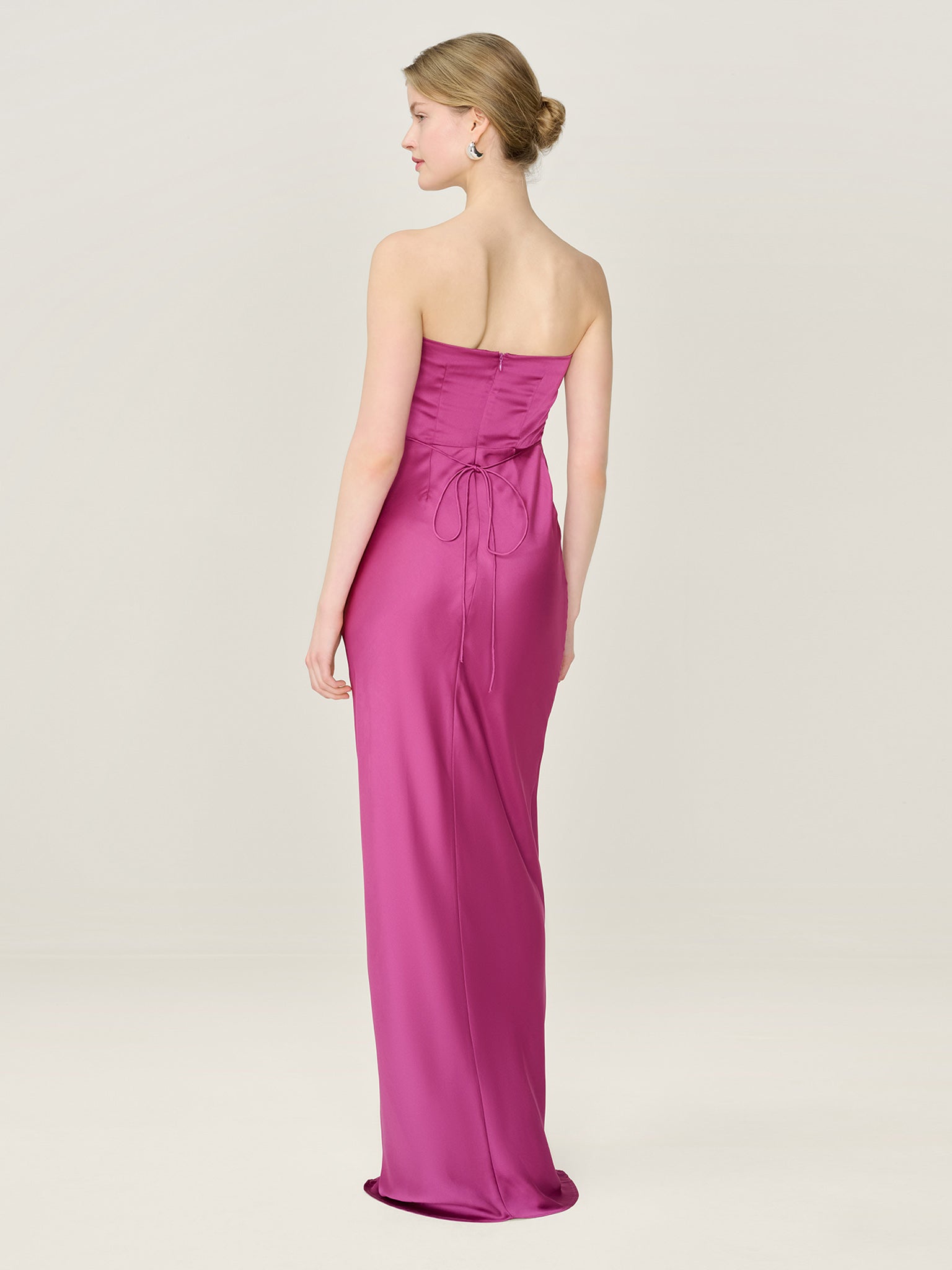 Simple, strapless, stunning; the Amdra is all that and more. Crafted from slinky satin in a our signature shade of magenta, she's fitted throughout to enhance the elegance of the silhouette.