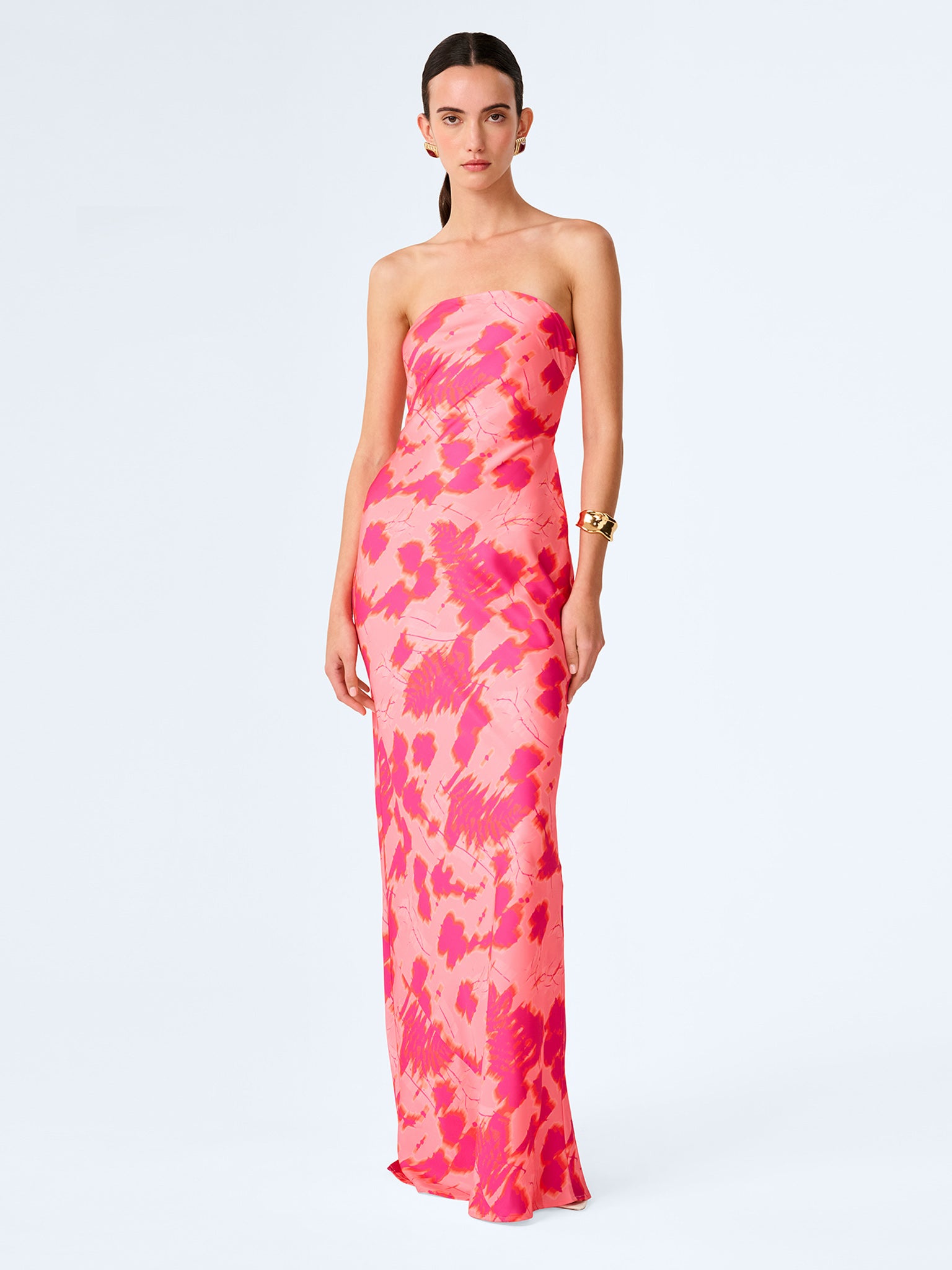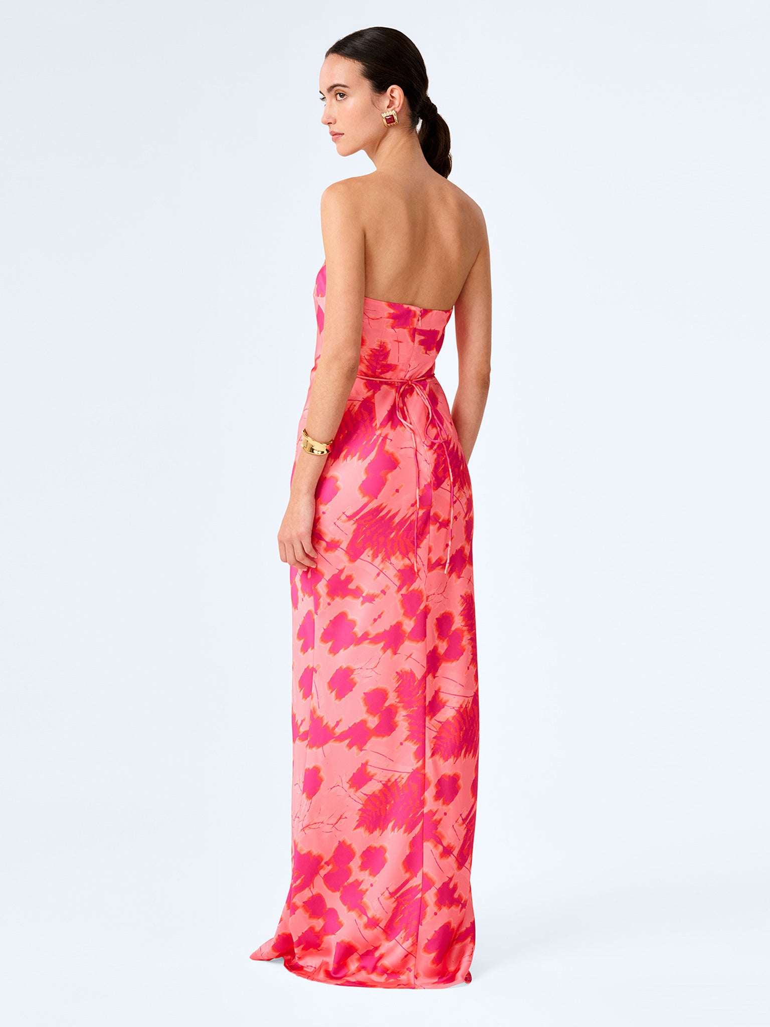 Simple, strapless, stunning; the Amdra is all that and more. Crafted from slinky satin in a gorgeous hot pink sunset blur print, she’s fitted throughout to enhance the elegance of the silhouette.