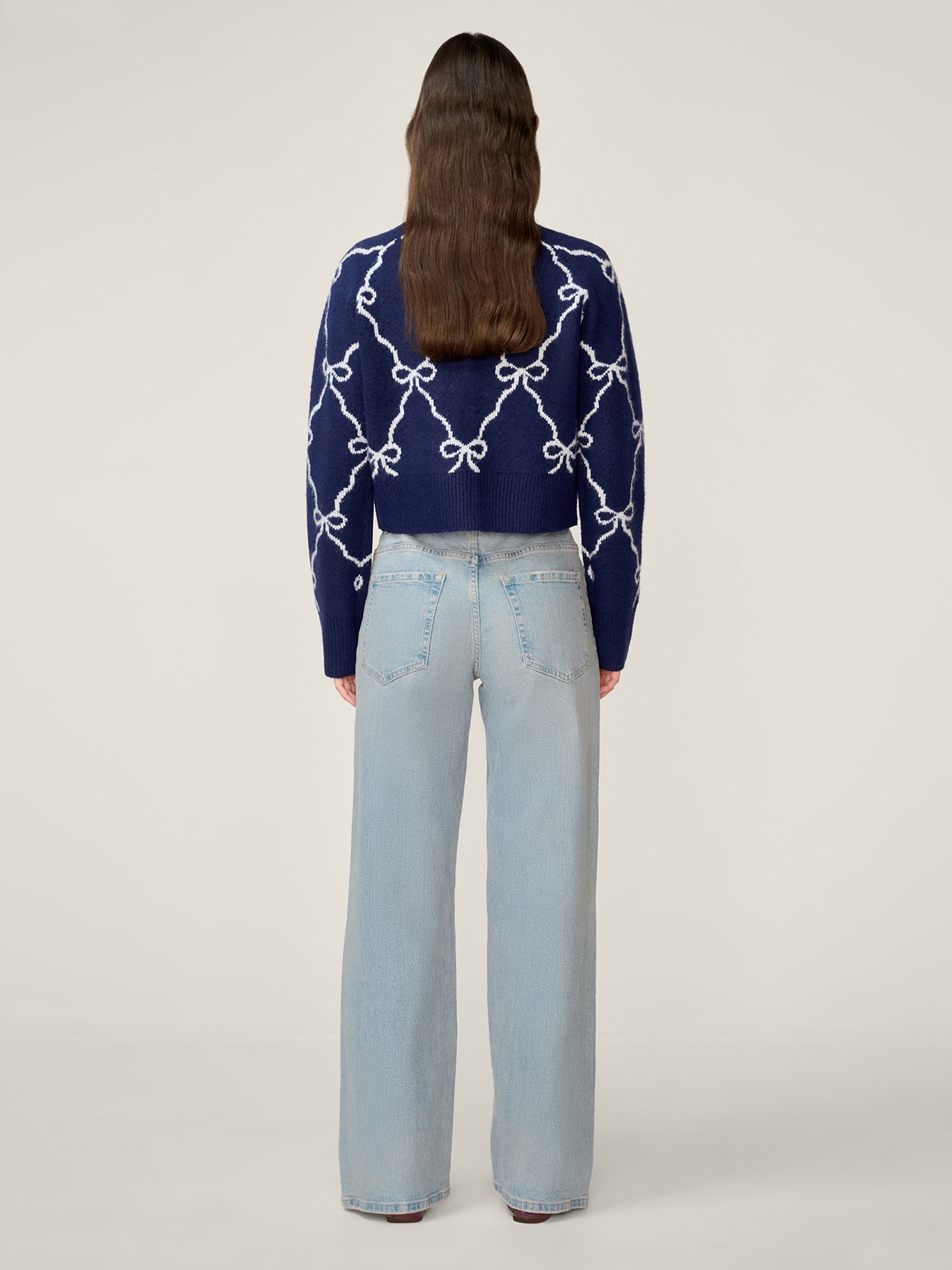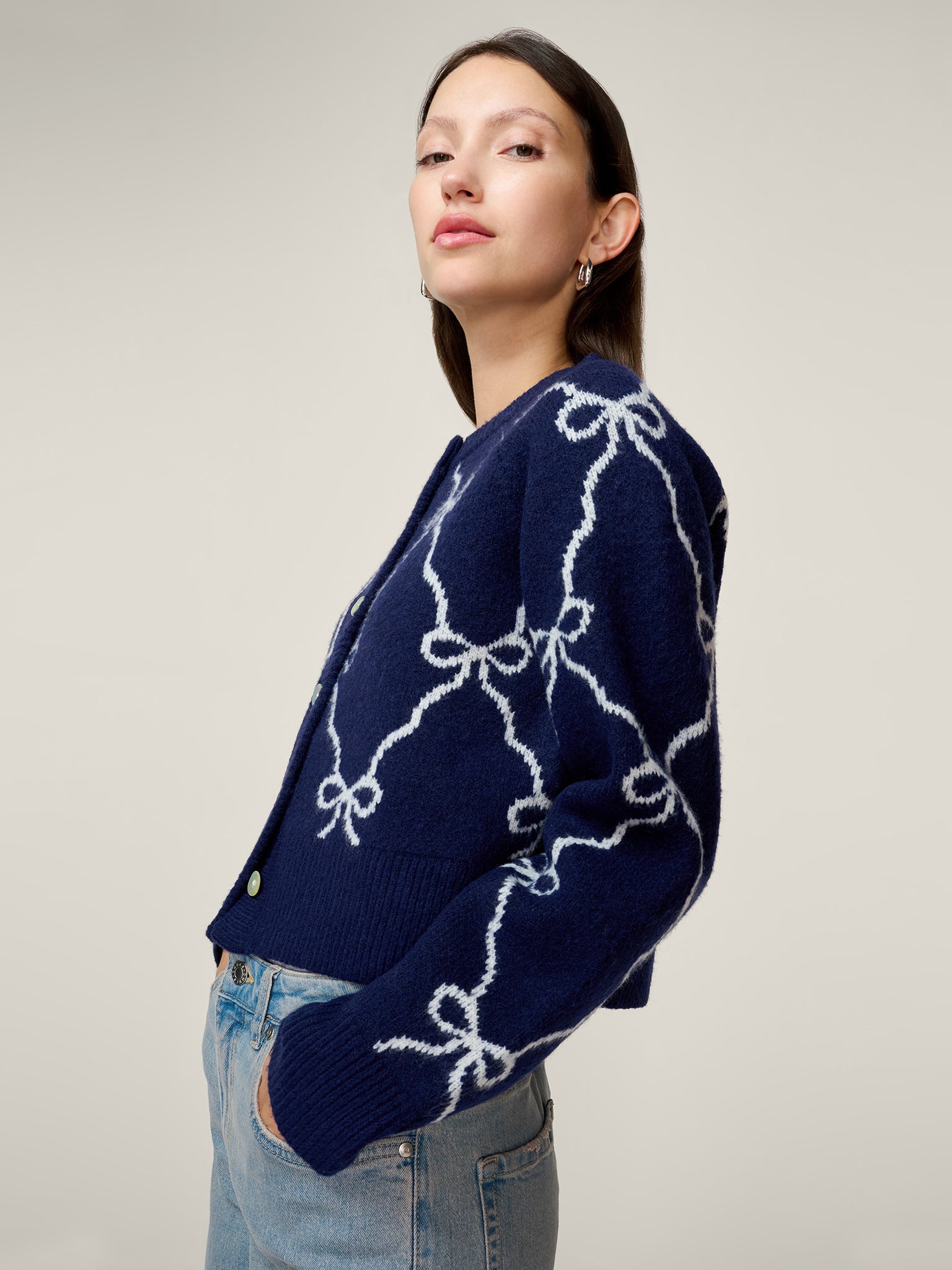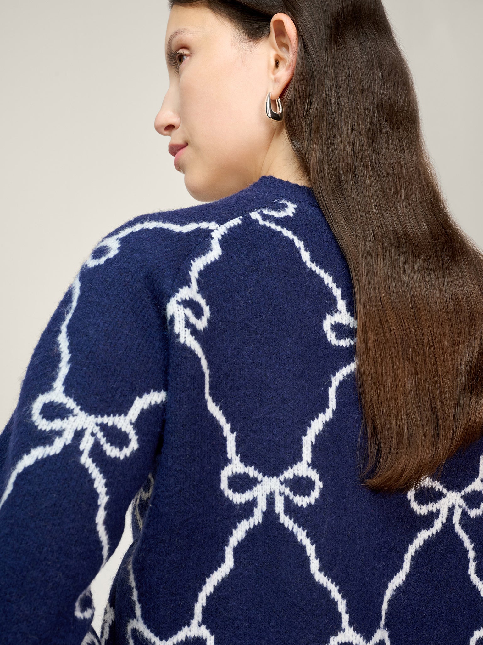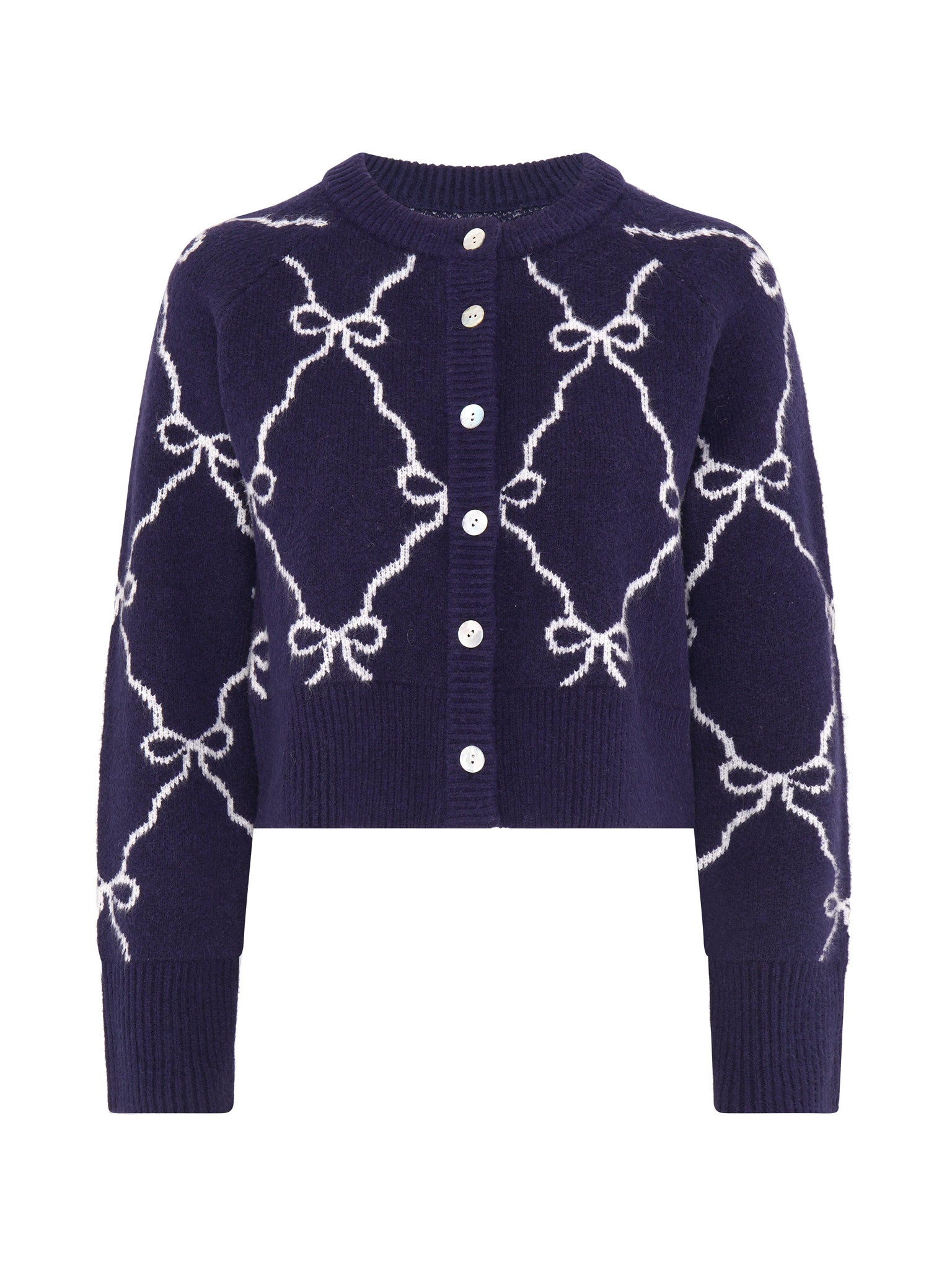August is our playful take on the classic cardigan, designed in navy with a repeated bow pattern that adds a touch of charm. Crafted from soft, recycled polyester, it features a high neck and button front for easy, everyday wear with a twist.