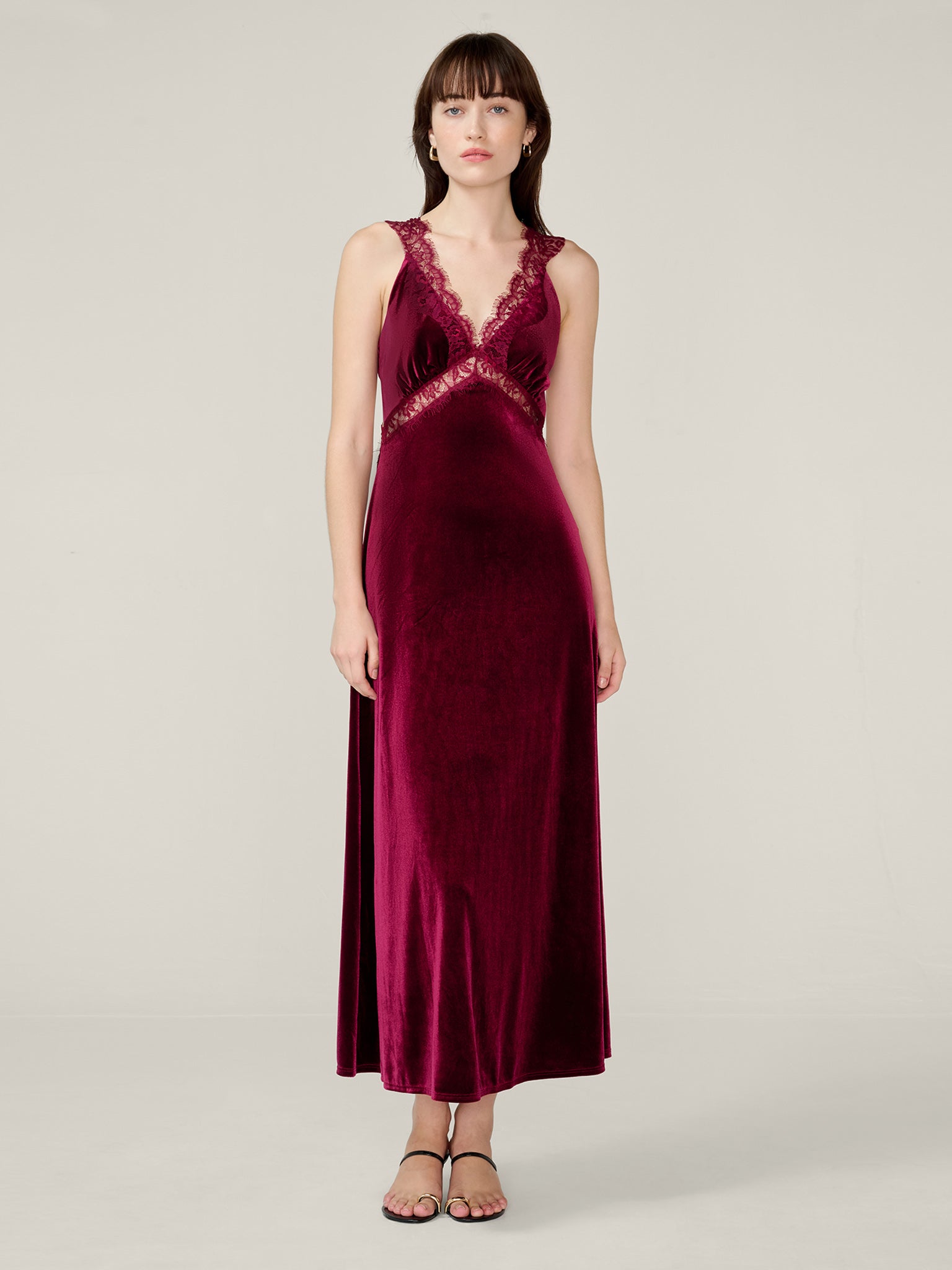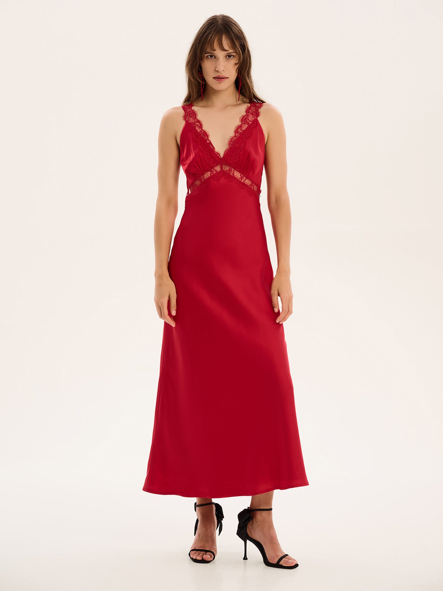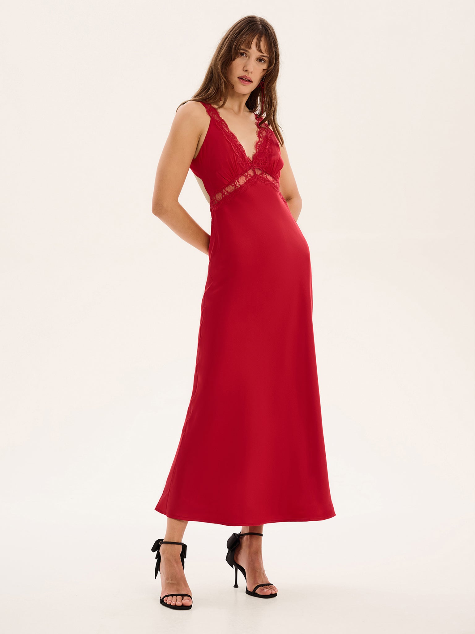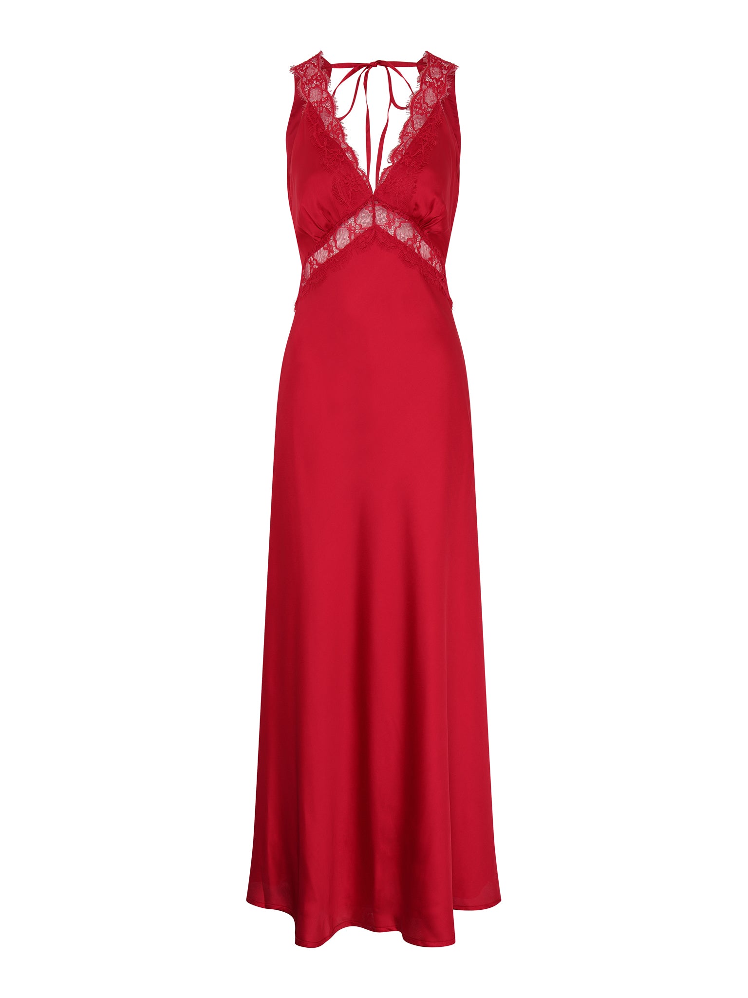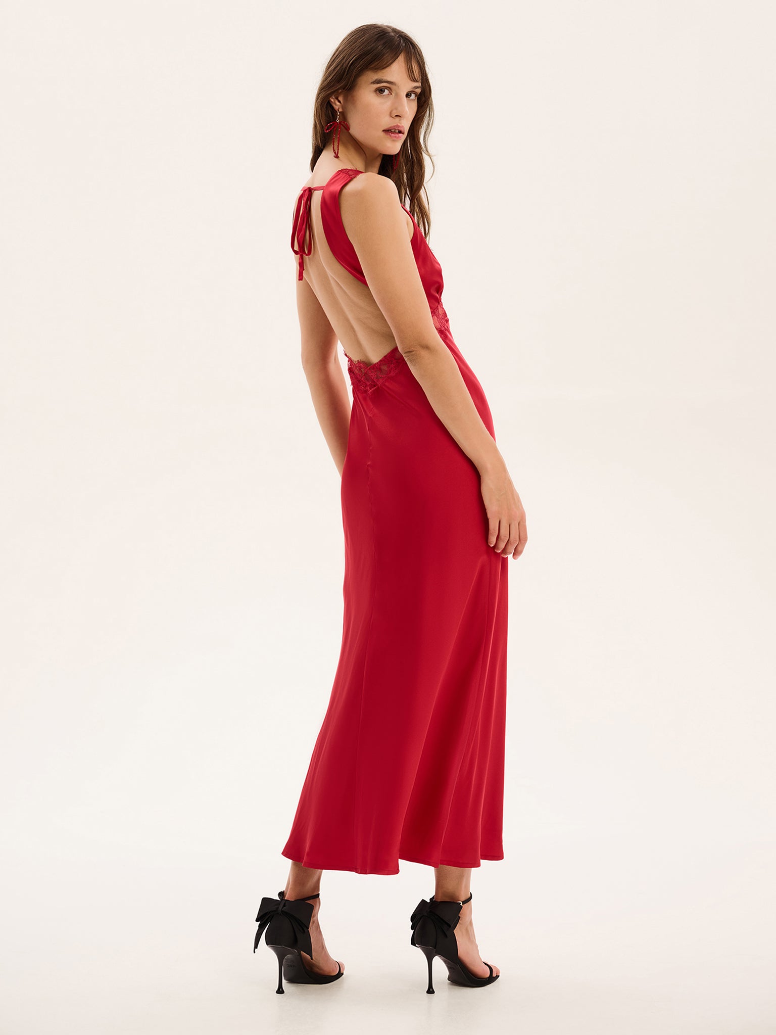 Aurelia features a plunging neckline and open back, artfully outlined by lace details. Crafted from recycled polyester satin in a cherry red, she's oozing with feminine details from the curved tie-back to the peek-a-boo lace under the bust.