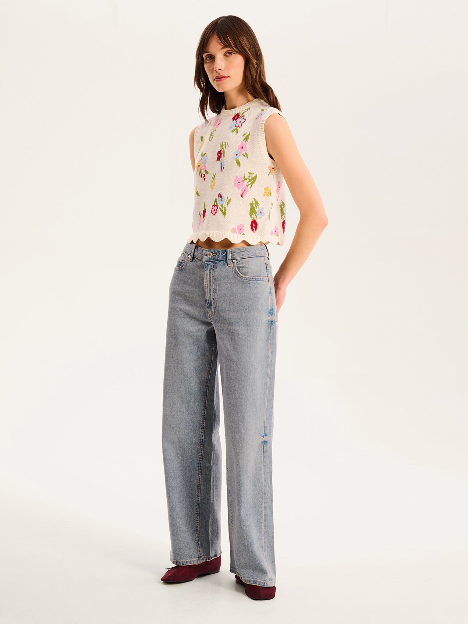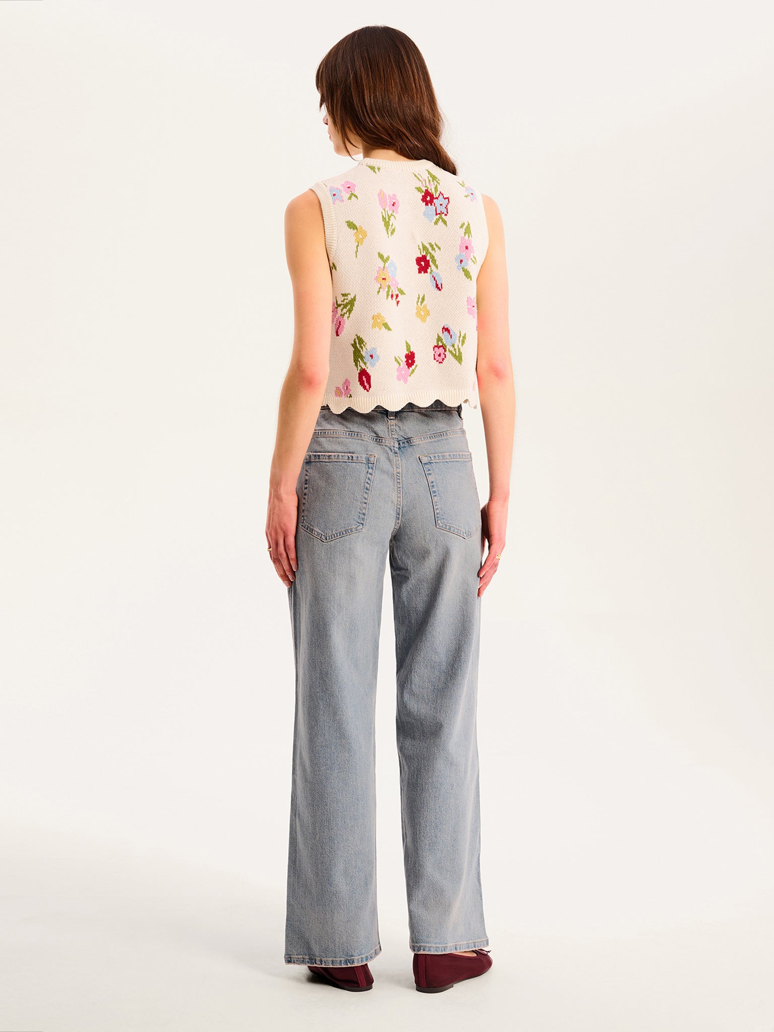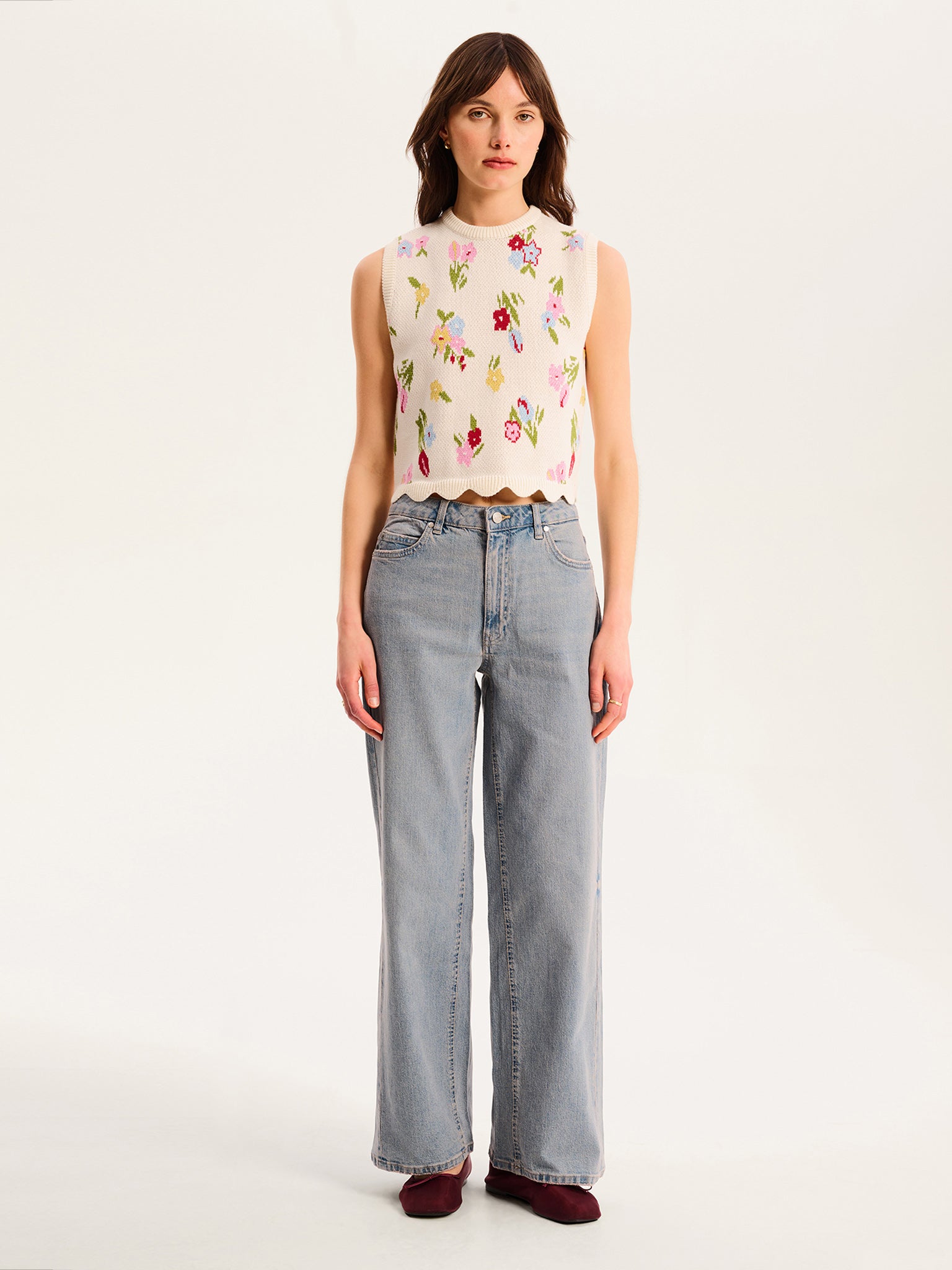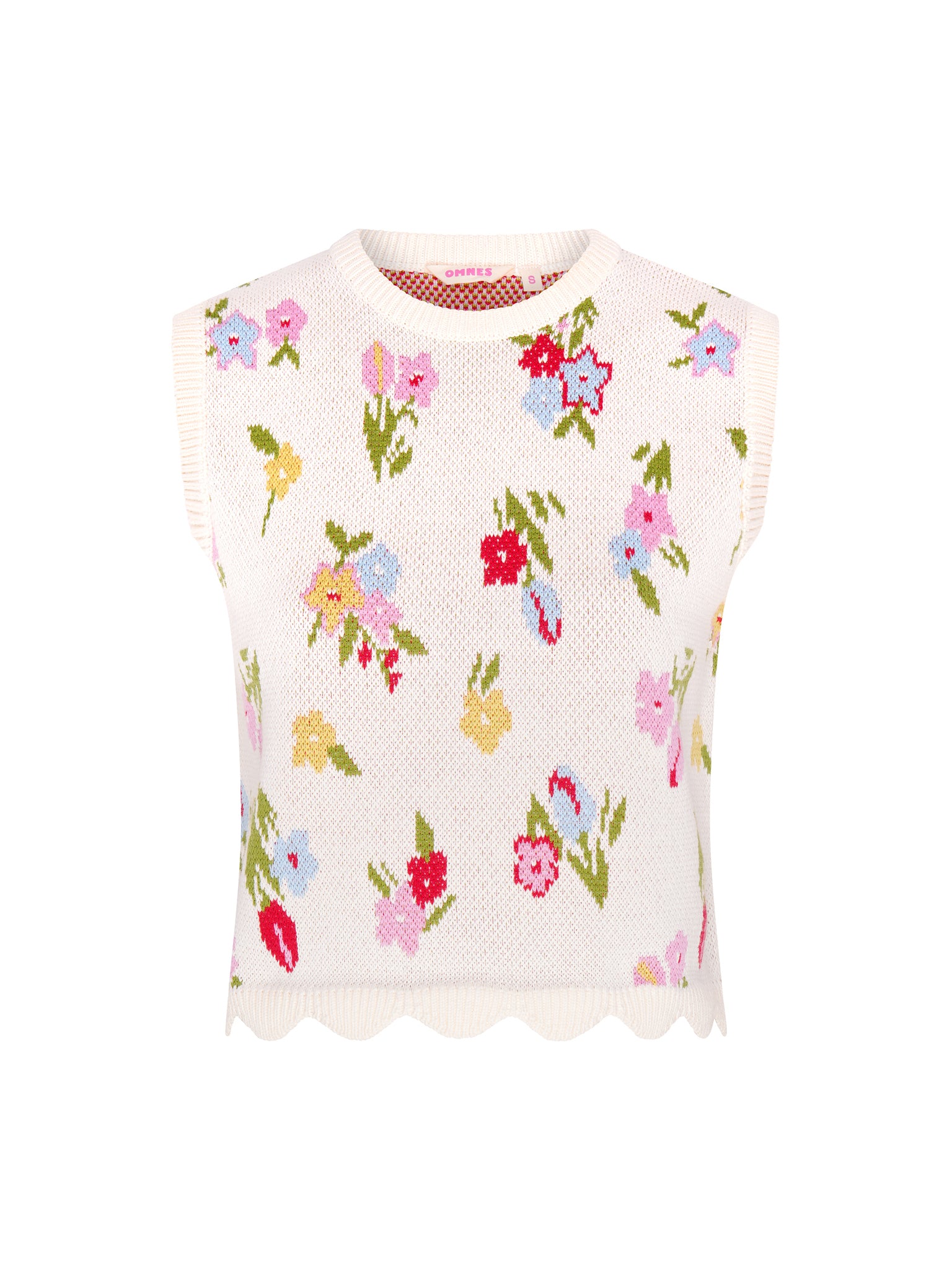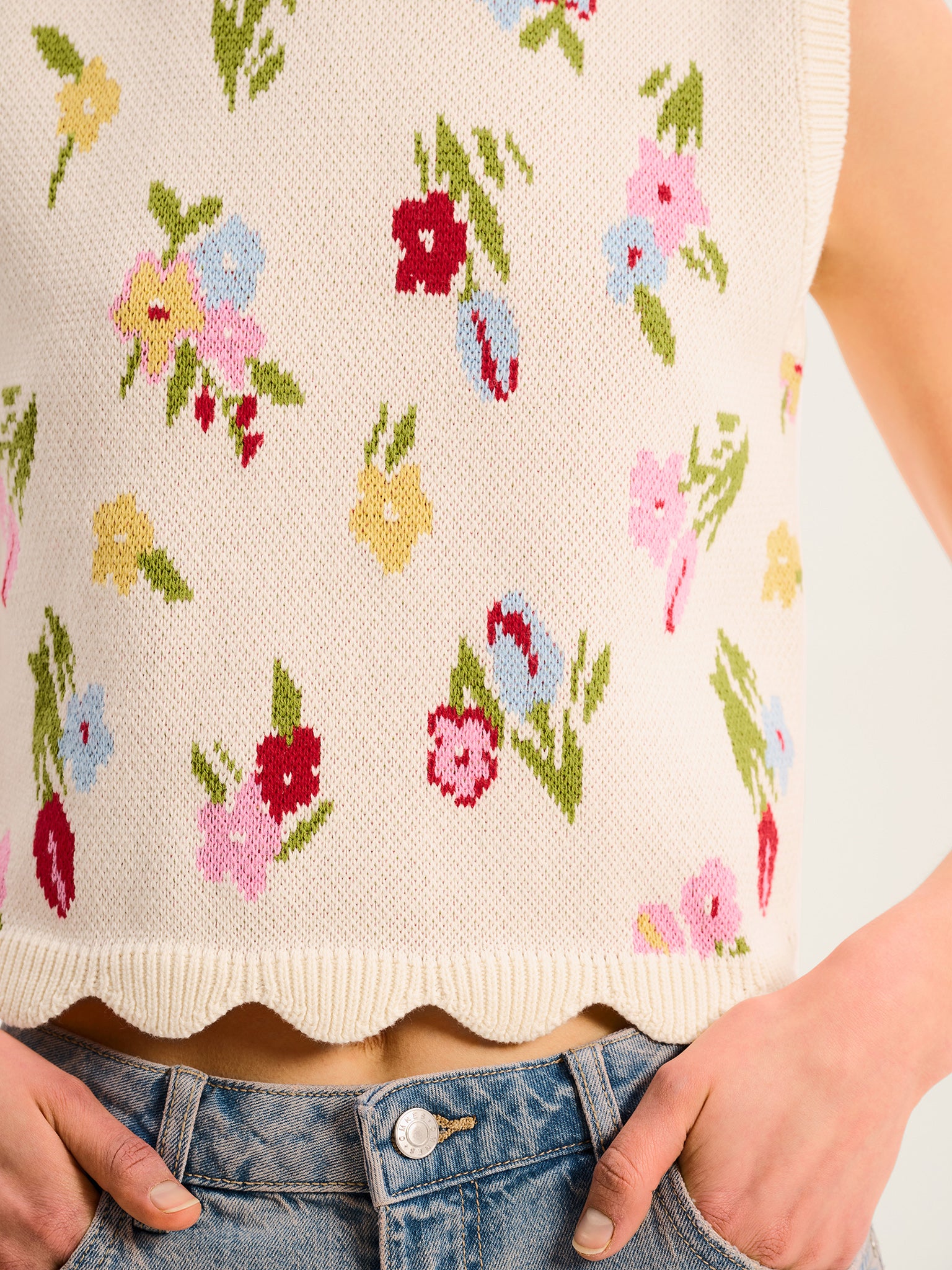 Bibi is the best of the vests. Designed for a snug fit, wear Bibi on its own or layer over one of our classic baby tees for effortless styling. Woven from soft cotton with a spring floral design and scalloped hem, you can’t go wrong with this cute new knitwear.