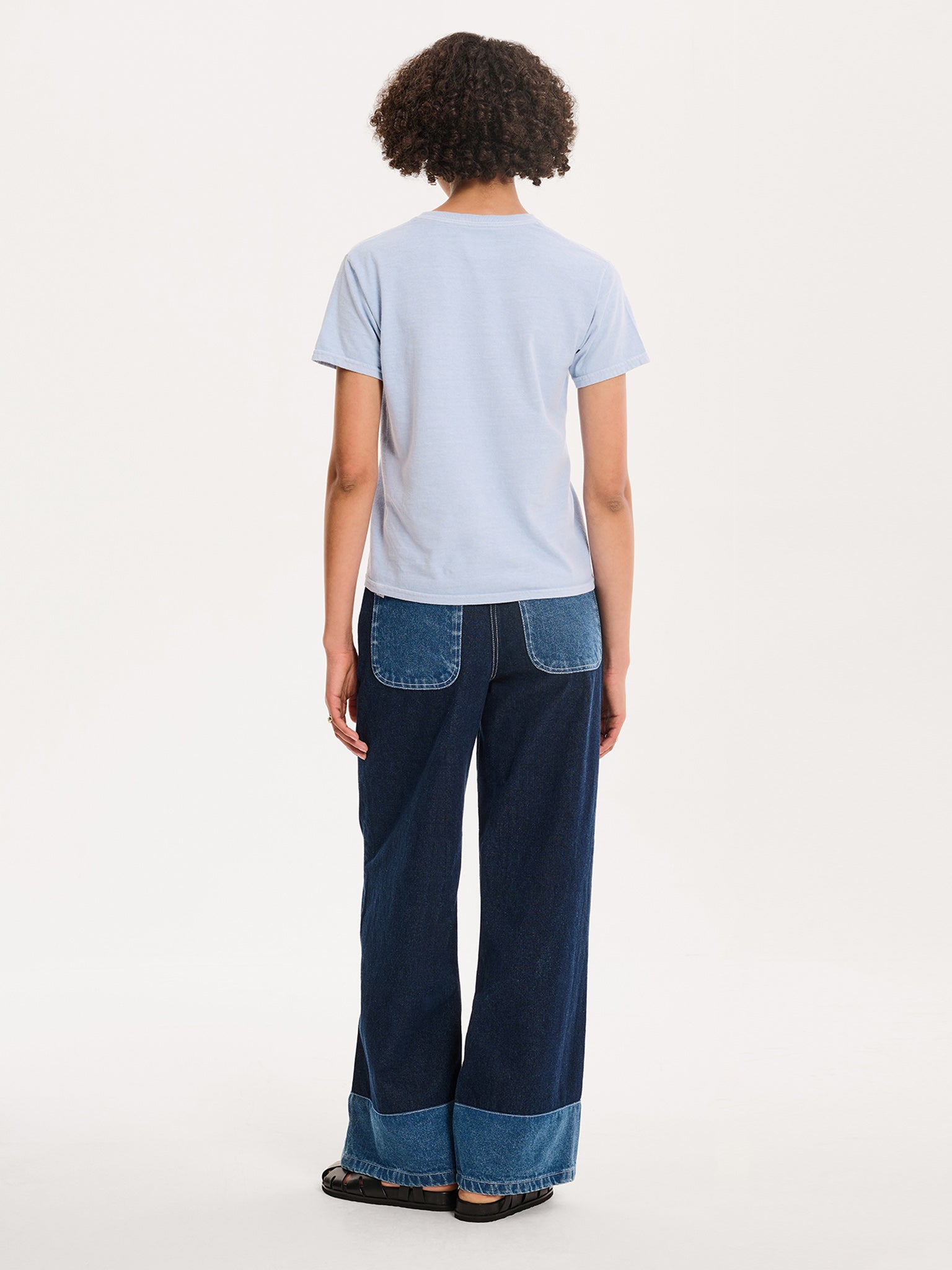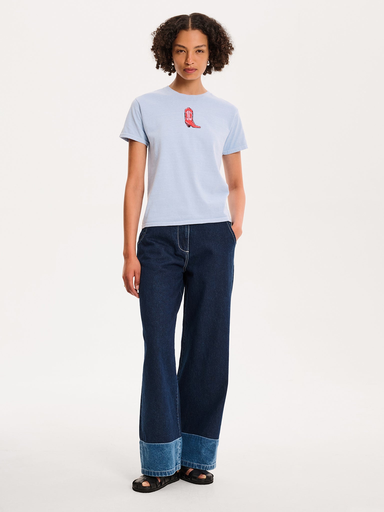 In a cornflower blue with a hand-drawn illustrated cowboy boot design, our baby tees are made with a slightly boxy fit and perfectly cropped. Simply throw over your favourite slip skirt or responsible denim.