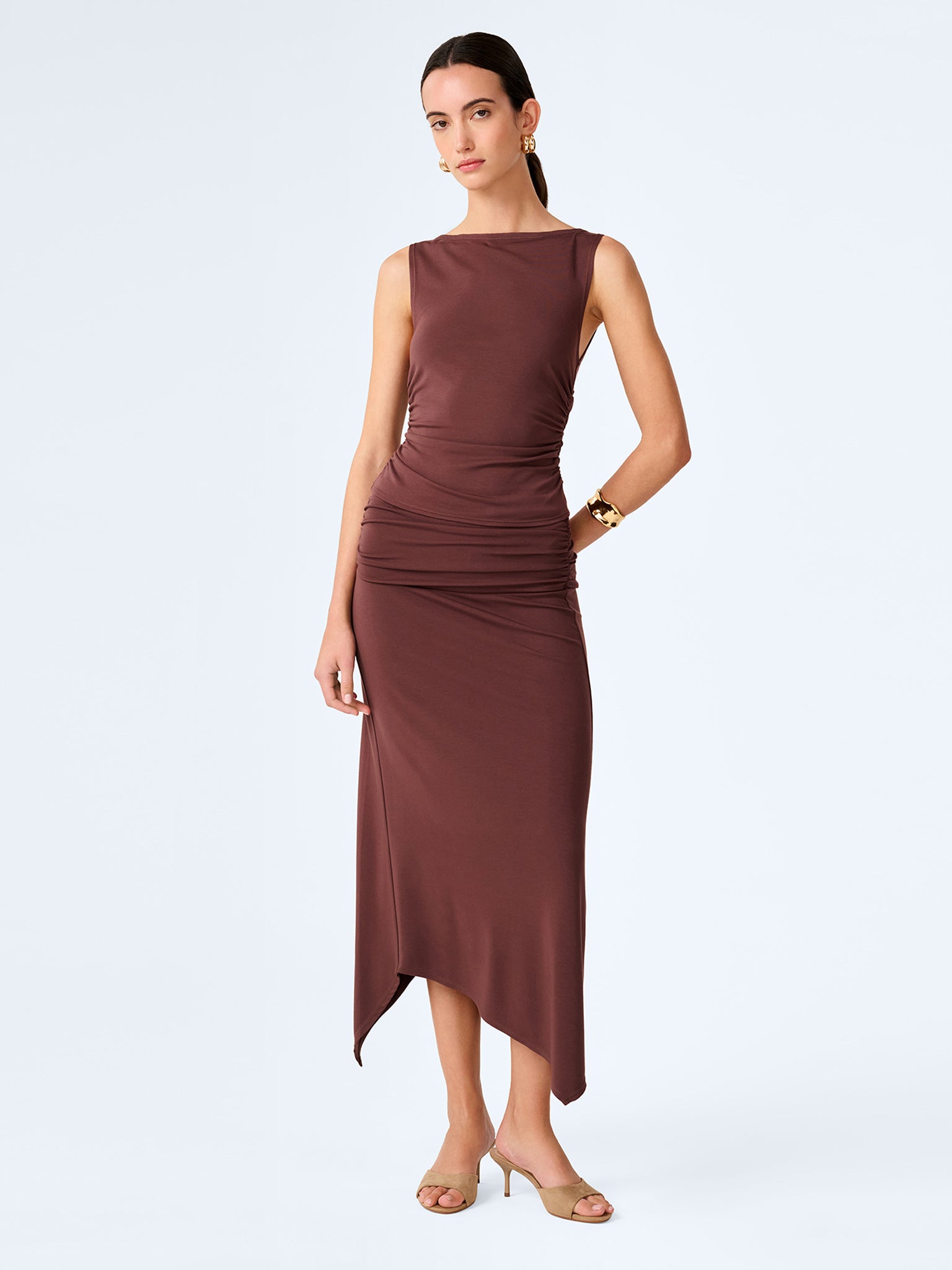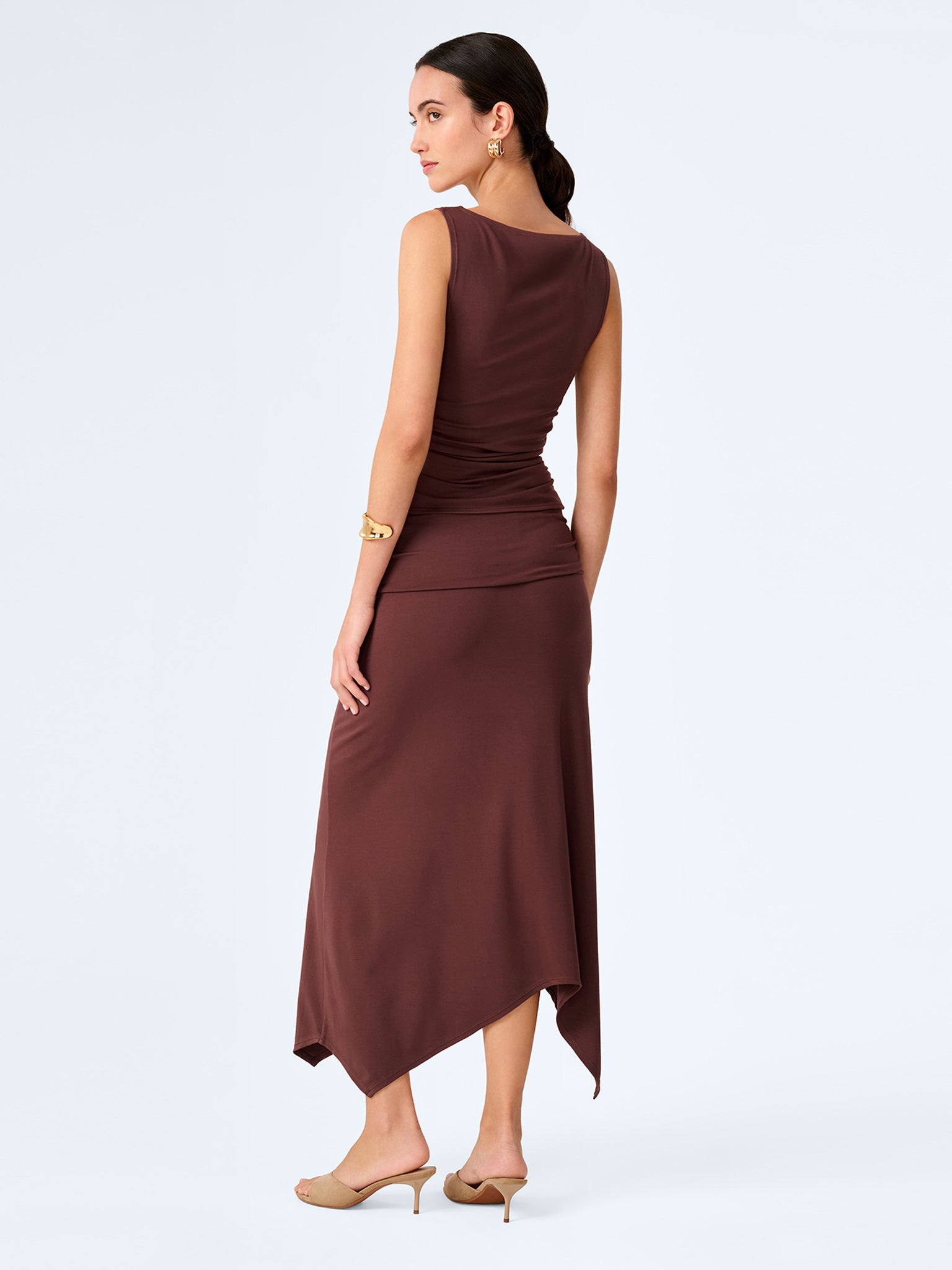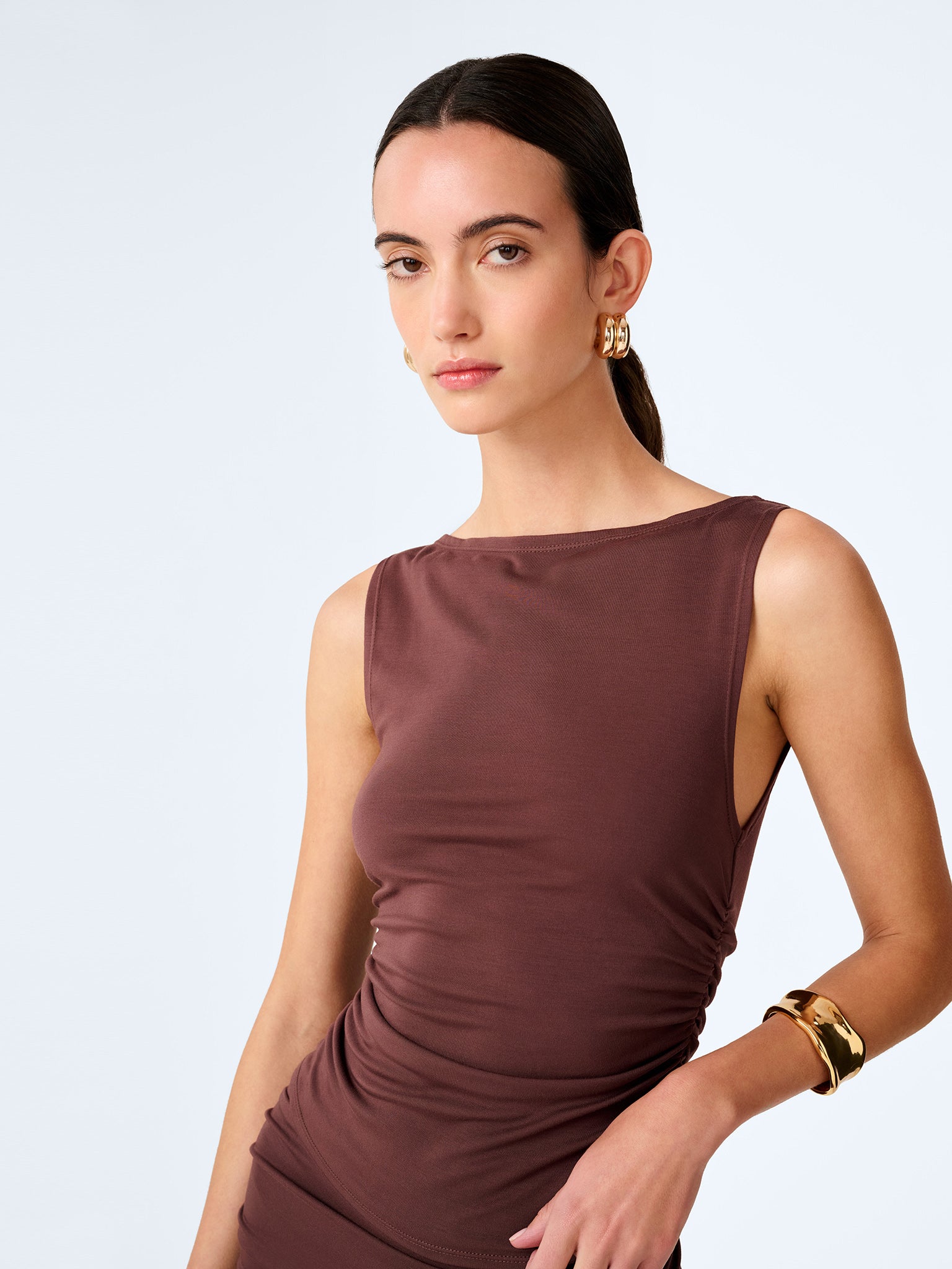 Delia is crafted from a soft chocolate modal jersey for a sleek, comfortable feel. This sleeveless top features delicate side ruching that enhances the silhouette and creates a flattering, body-skimming fit. Easy to wear on its own or layered under jackets, Delia is an effortless staple that feels both modern and timeless. Pair with the matching Cancun skirt for the cutest of co-ords.