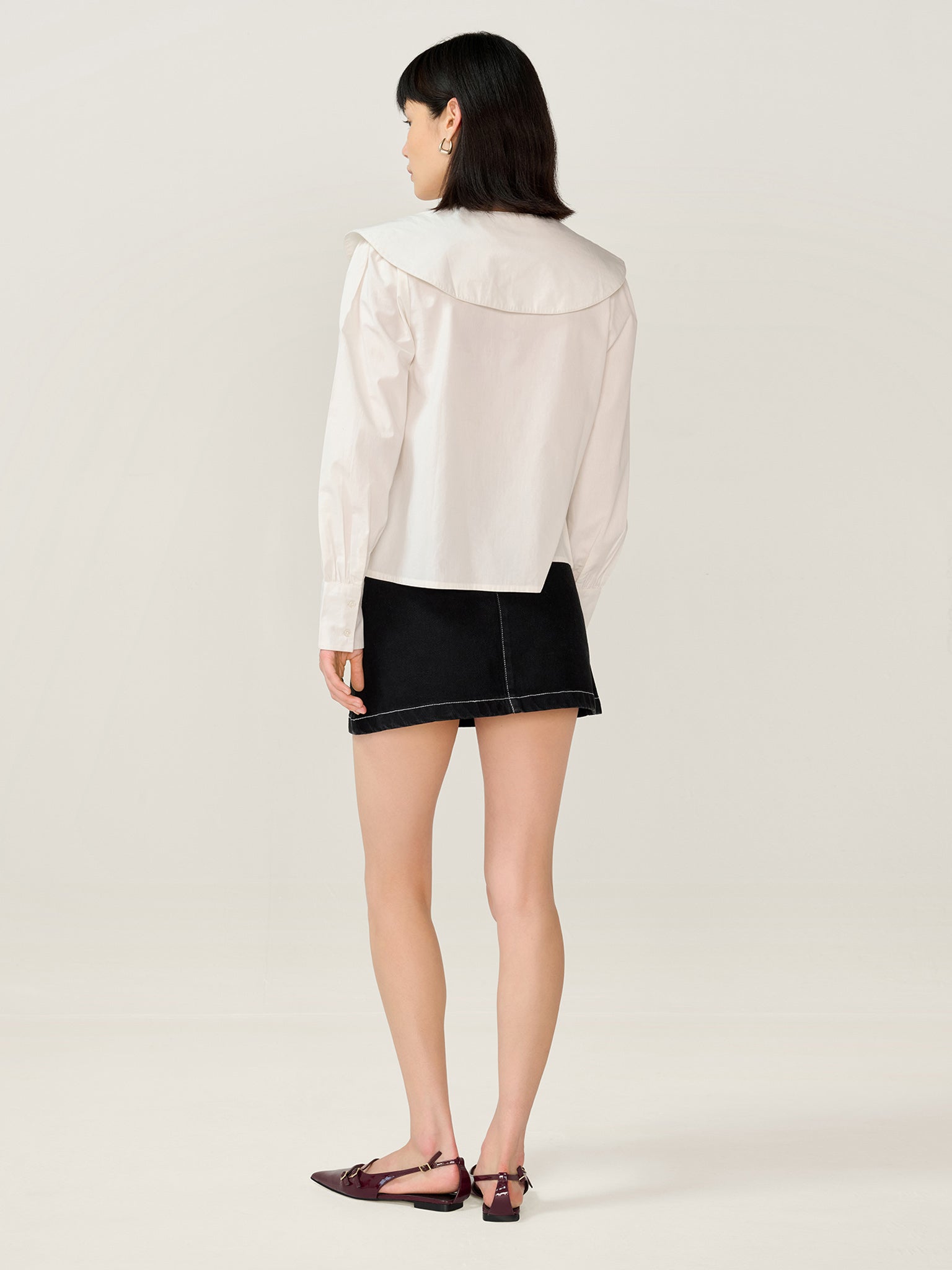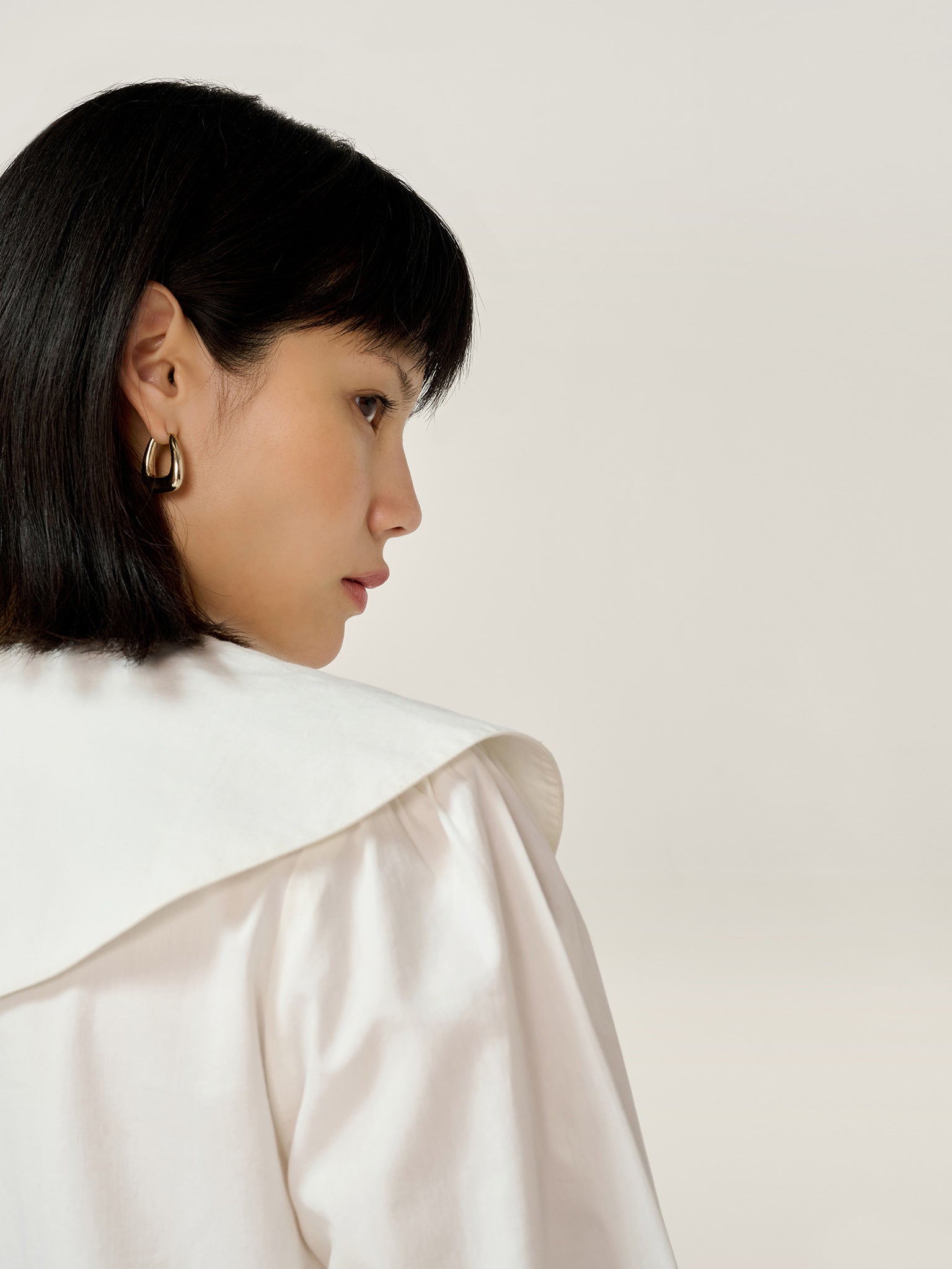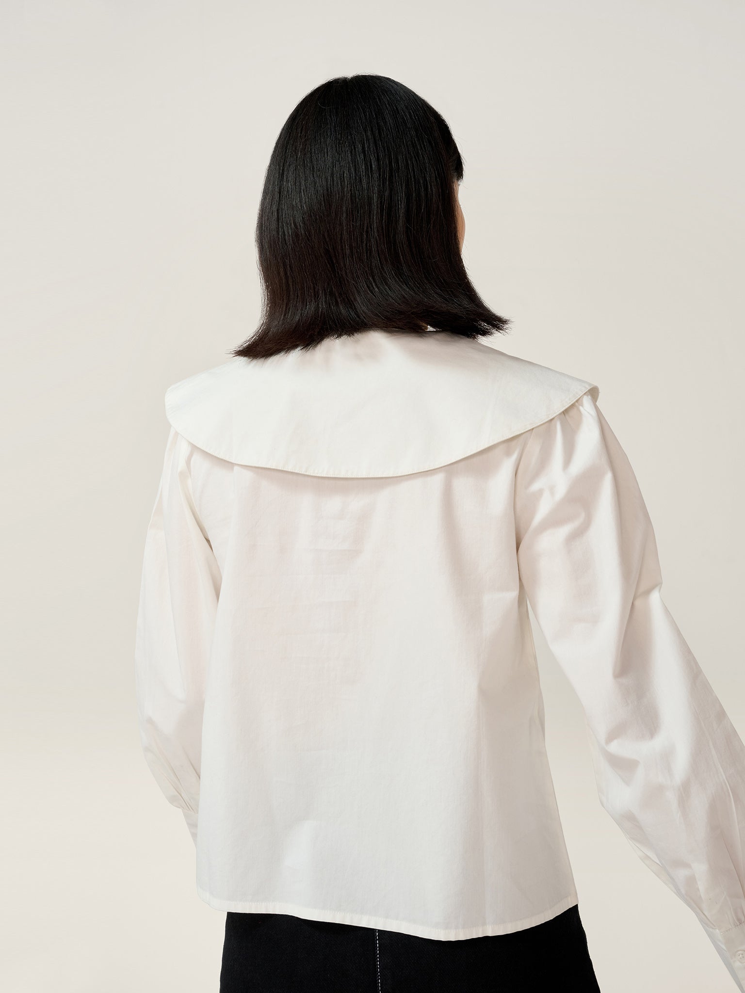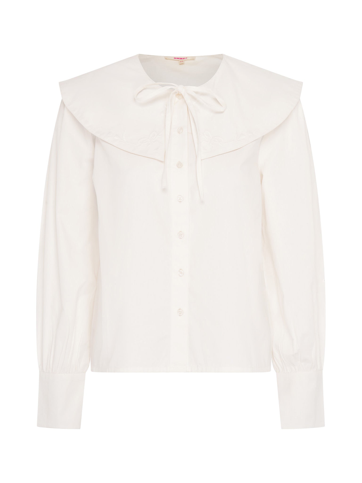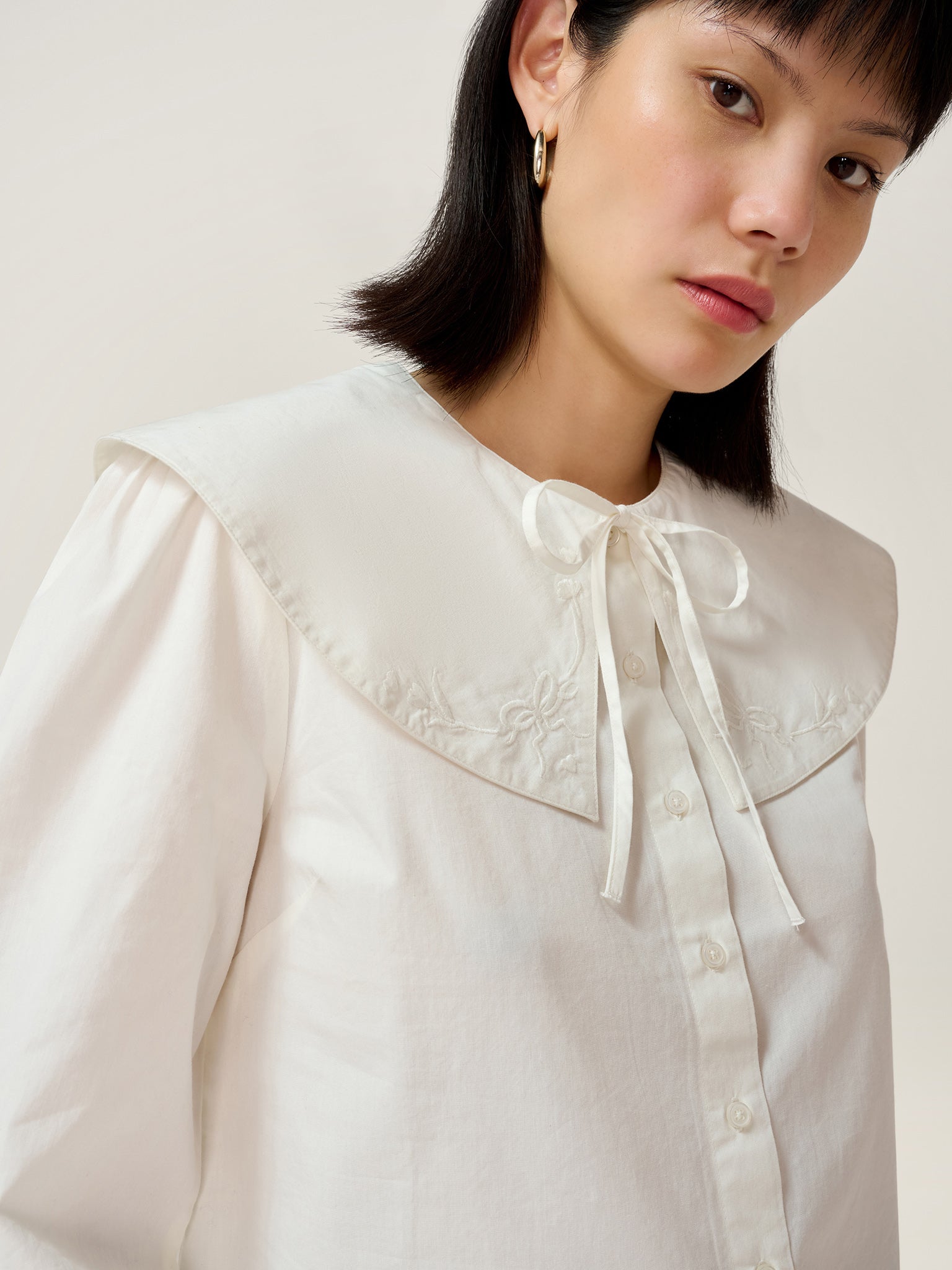 Helena is all about charming details. Made from crisp cotton, this blouse features a statement collar adorned with delicate bow embroidery and a sweet tie bow at the neck. Finished with gently cuffed sleeves for a soft structure, it’s perfect for dressing up denim or layering under your favourite knits.