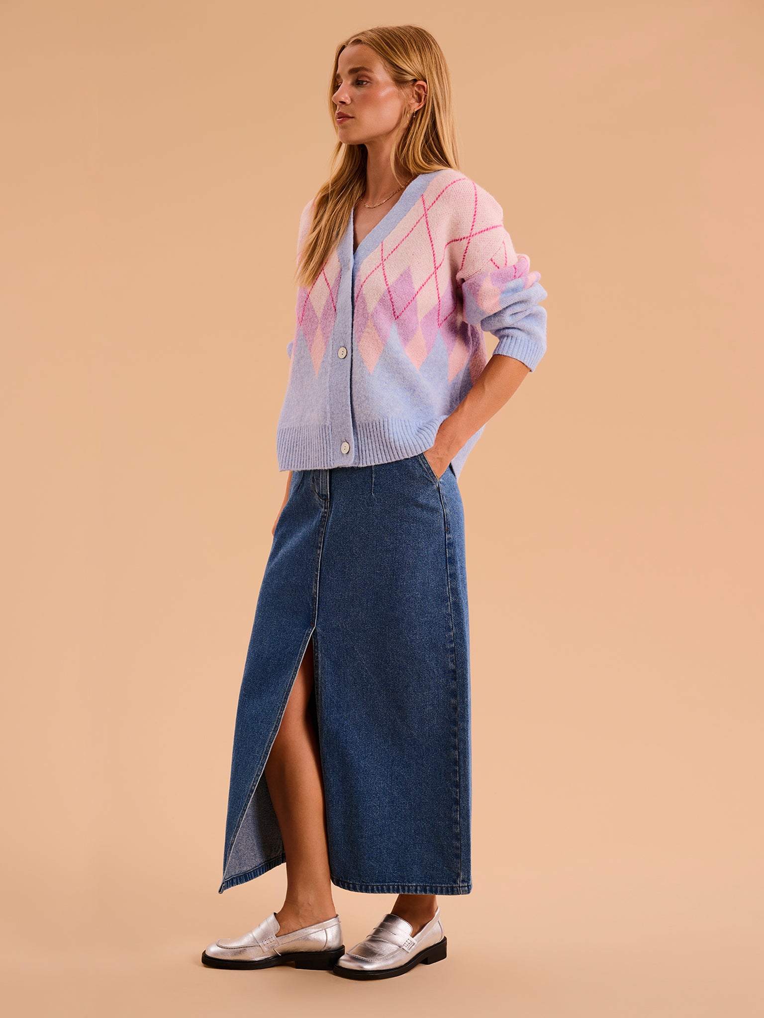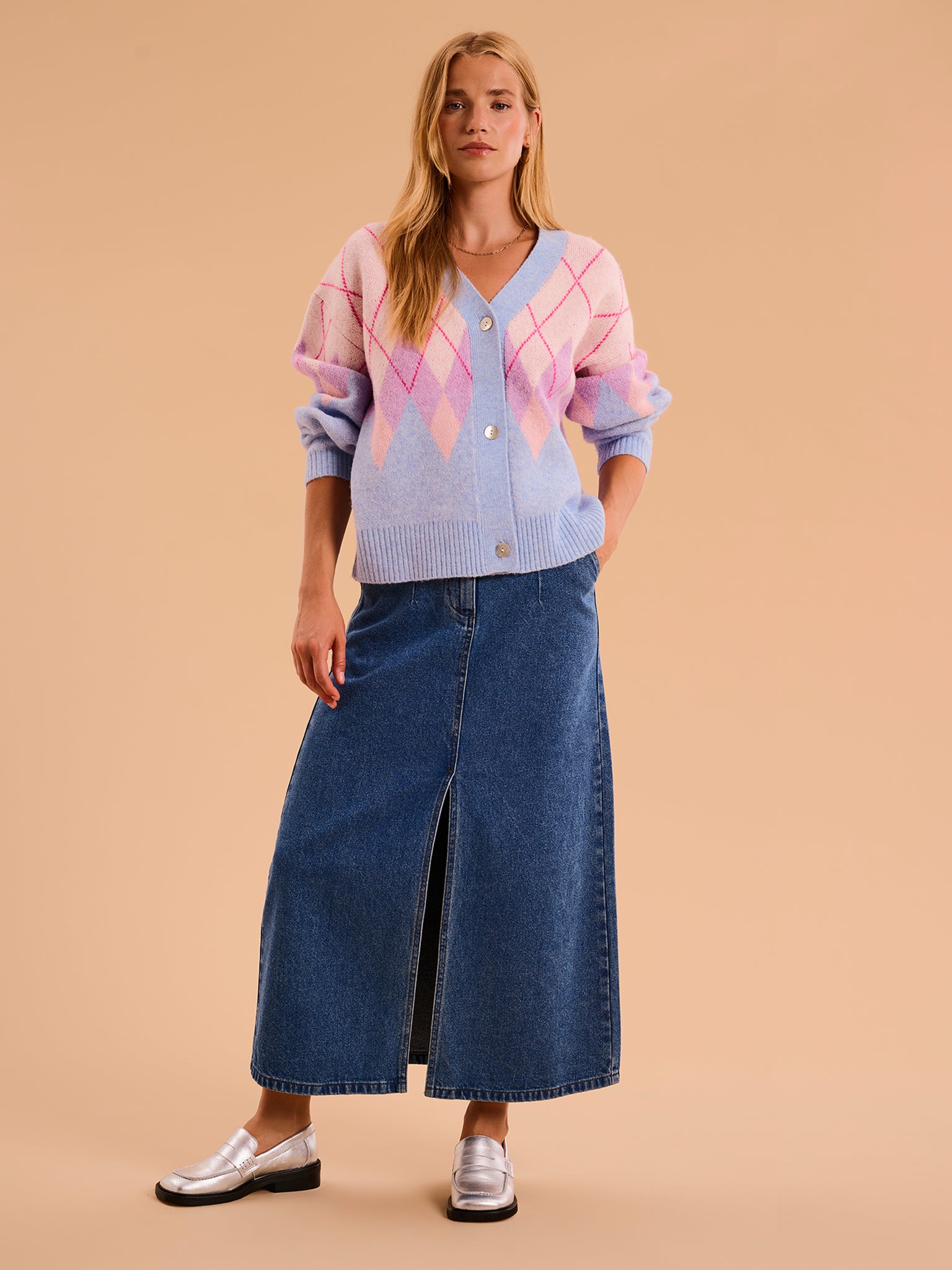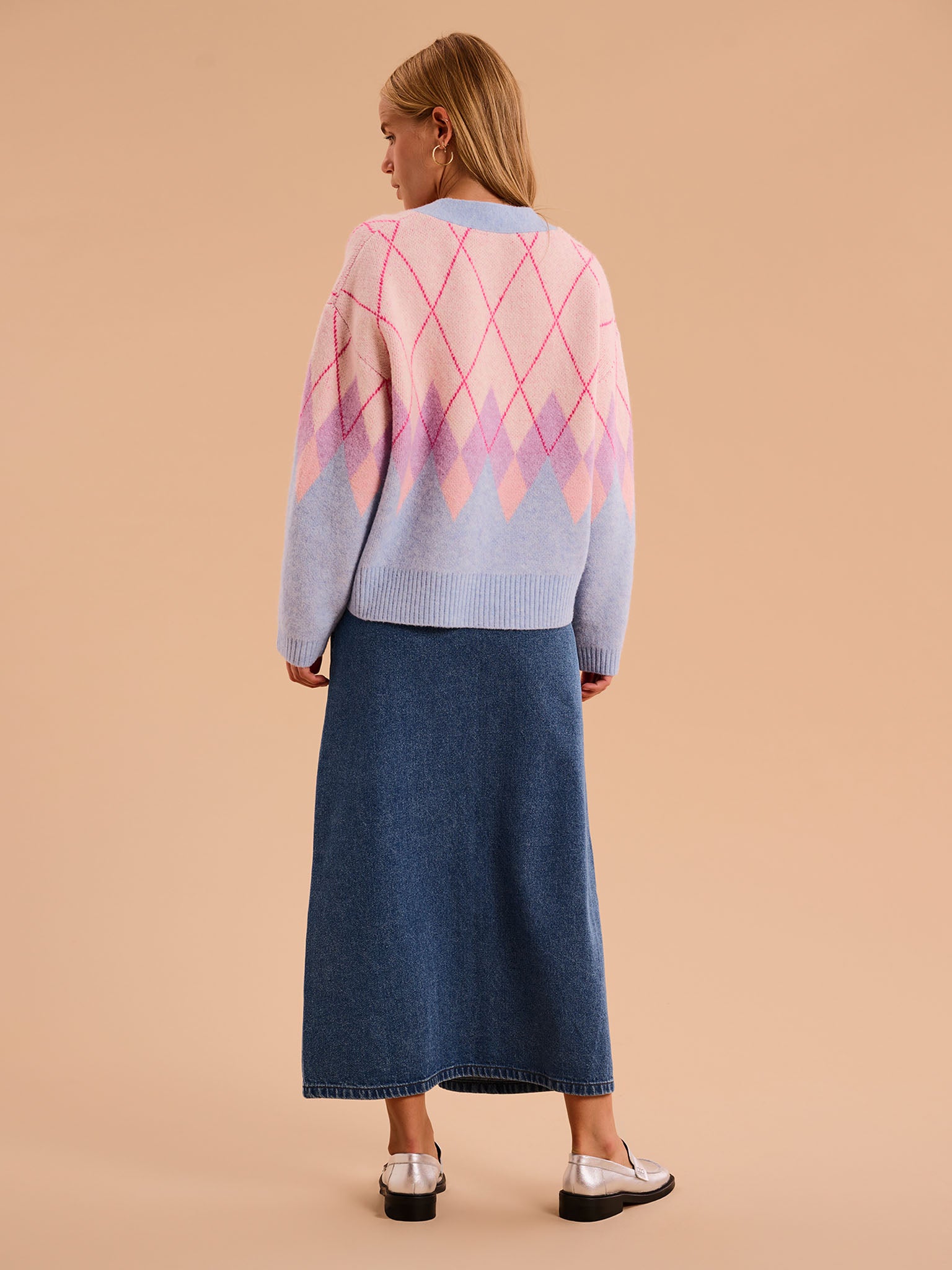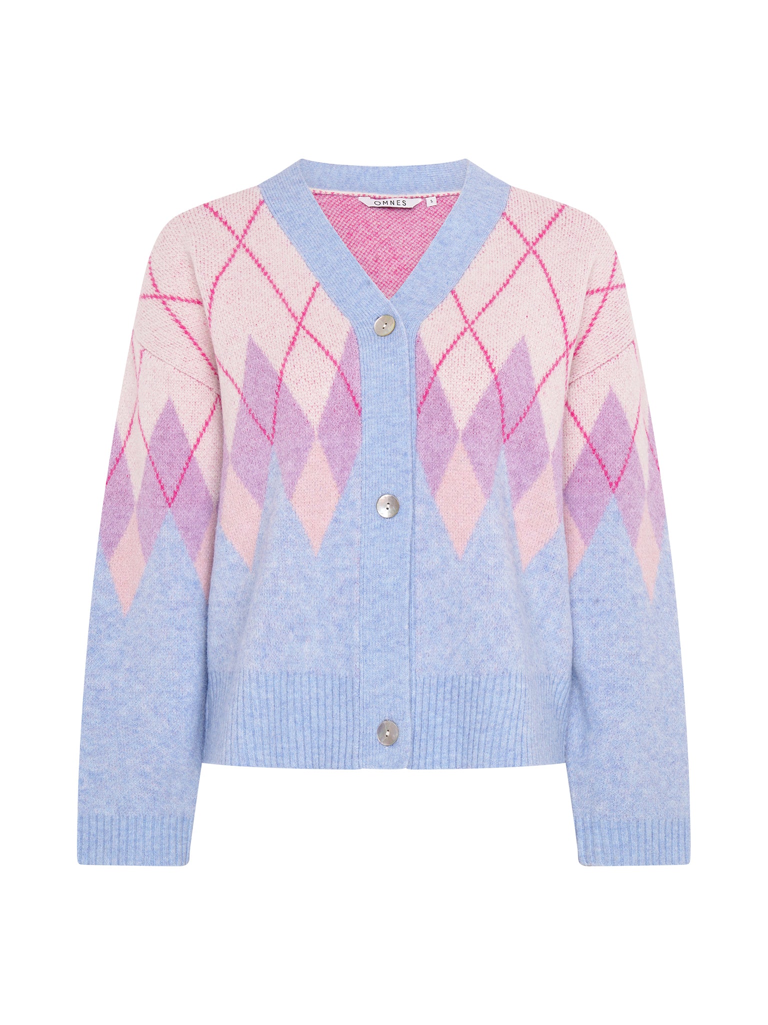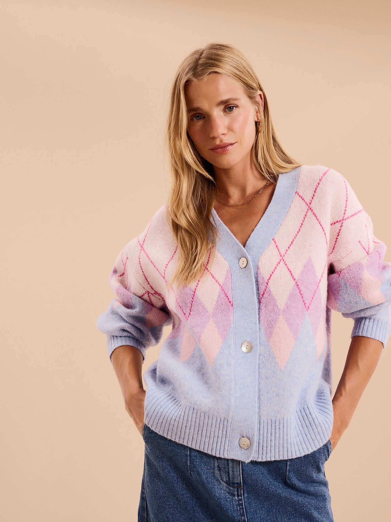 Soft yarns and a slouchy silhouette, Henni is your quintessential cardigan. A statement argyle in tonal shades of purple brings bags of personality to this timeless cardigan.