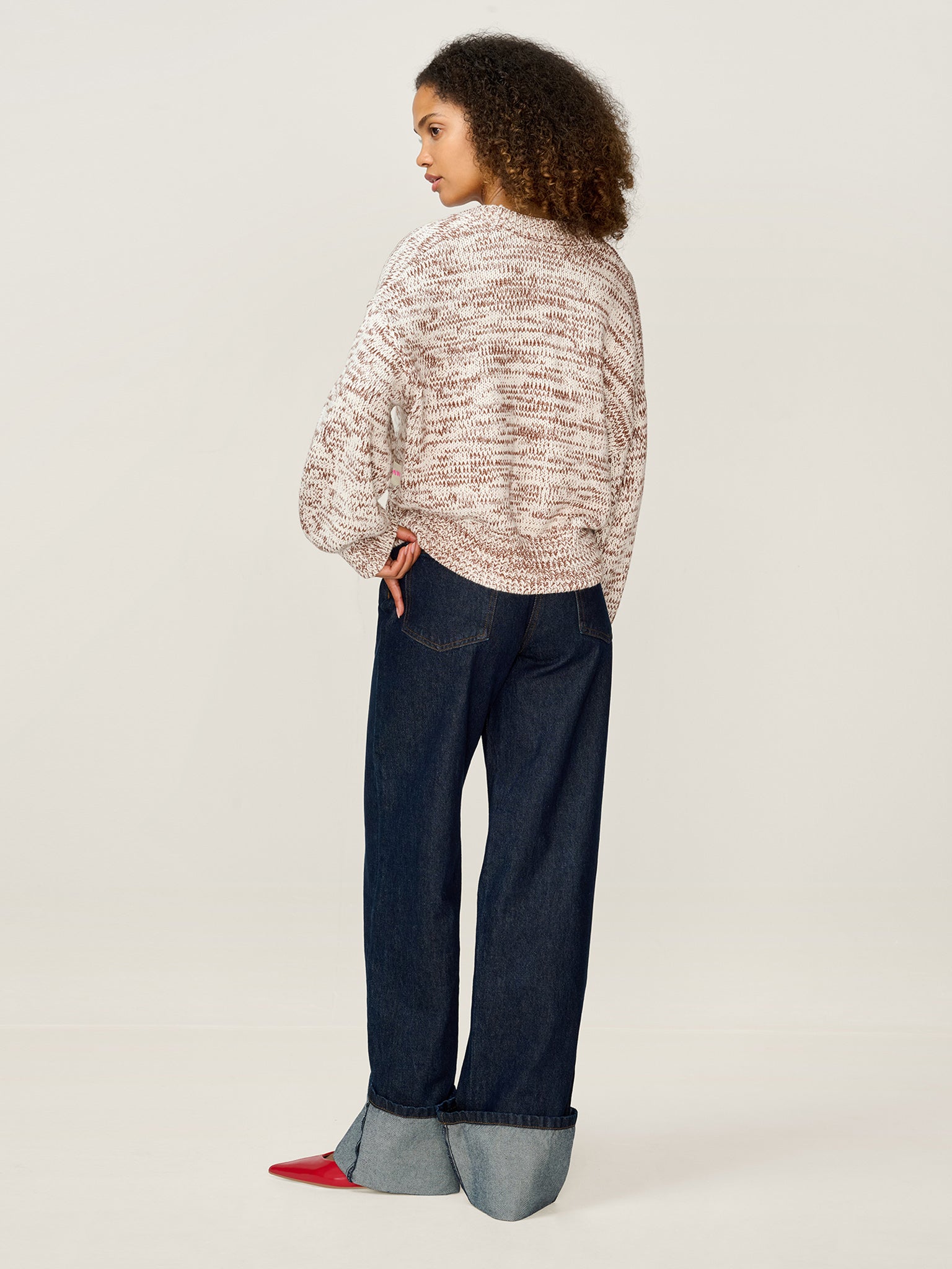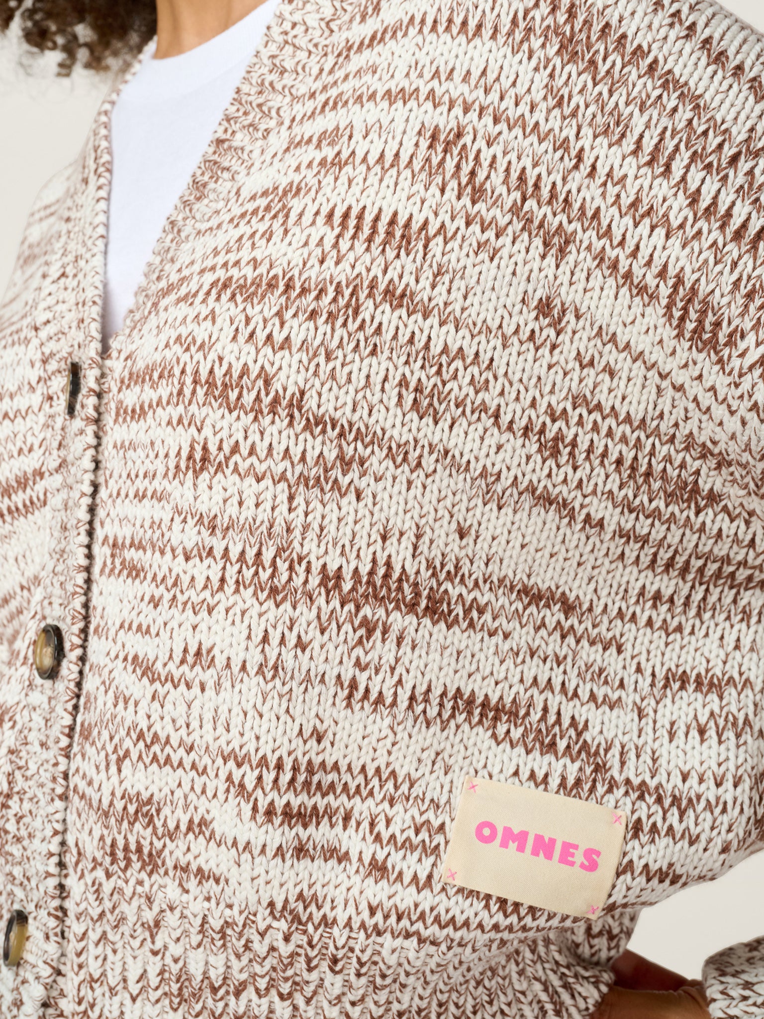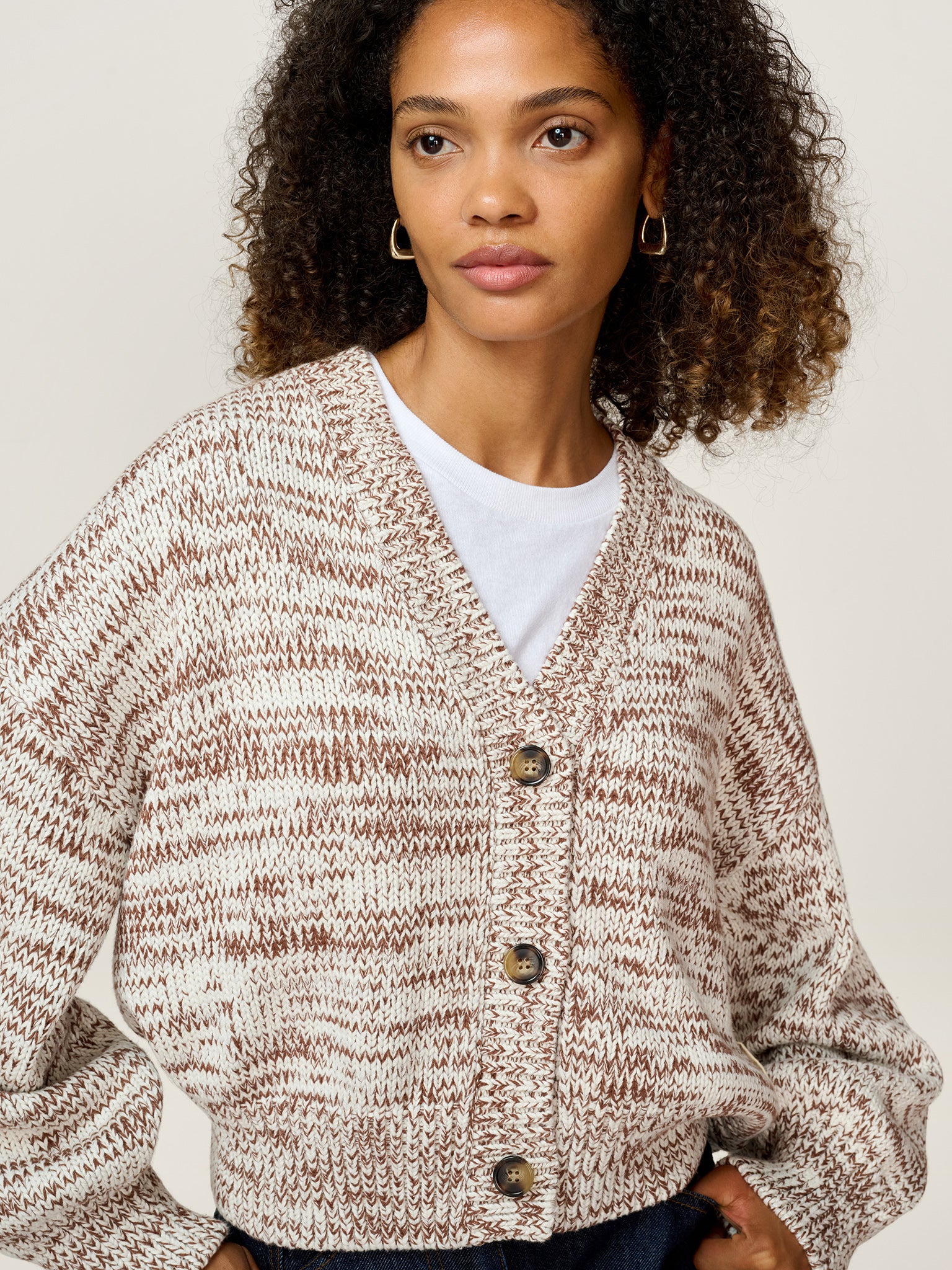 Knitted in a thick-weight cotton for structure and softness, the Hopper cardigan features a slouchy fit, voluminous sleeves, and a cropped hem. Reimagined in a chocolate and cream mixed cotton yarn, this easy wearing cardigan is a refined take on a wardrobe staple. Part of our Studio OMNES collection, this piece is designed with a removable brand patch.