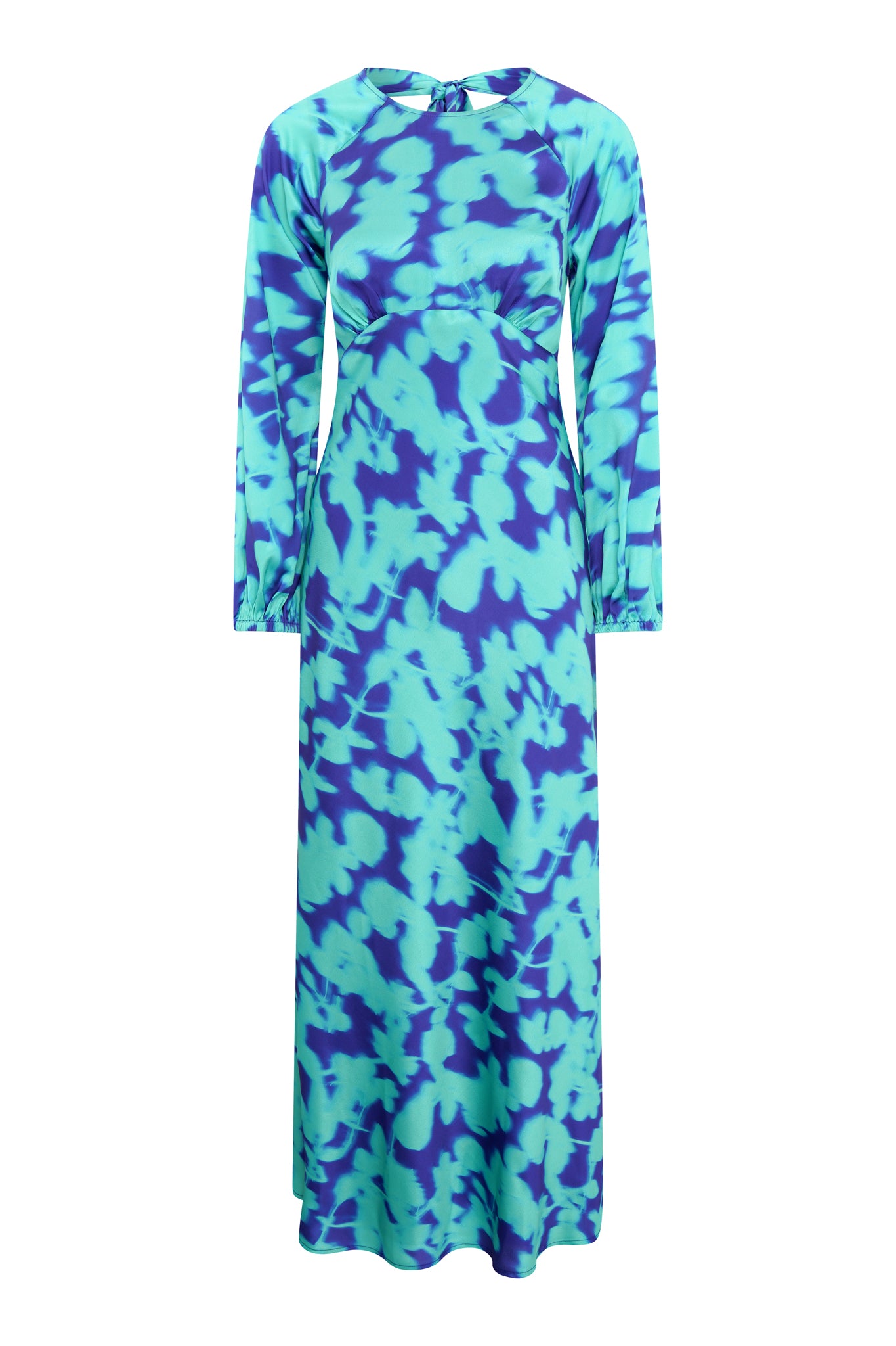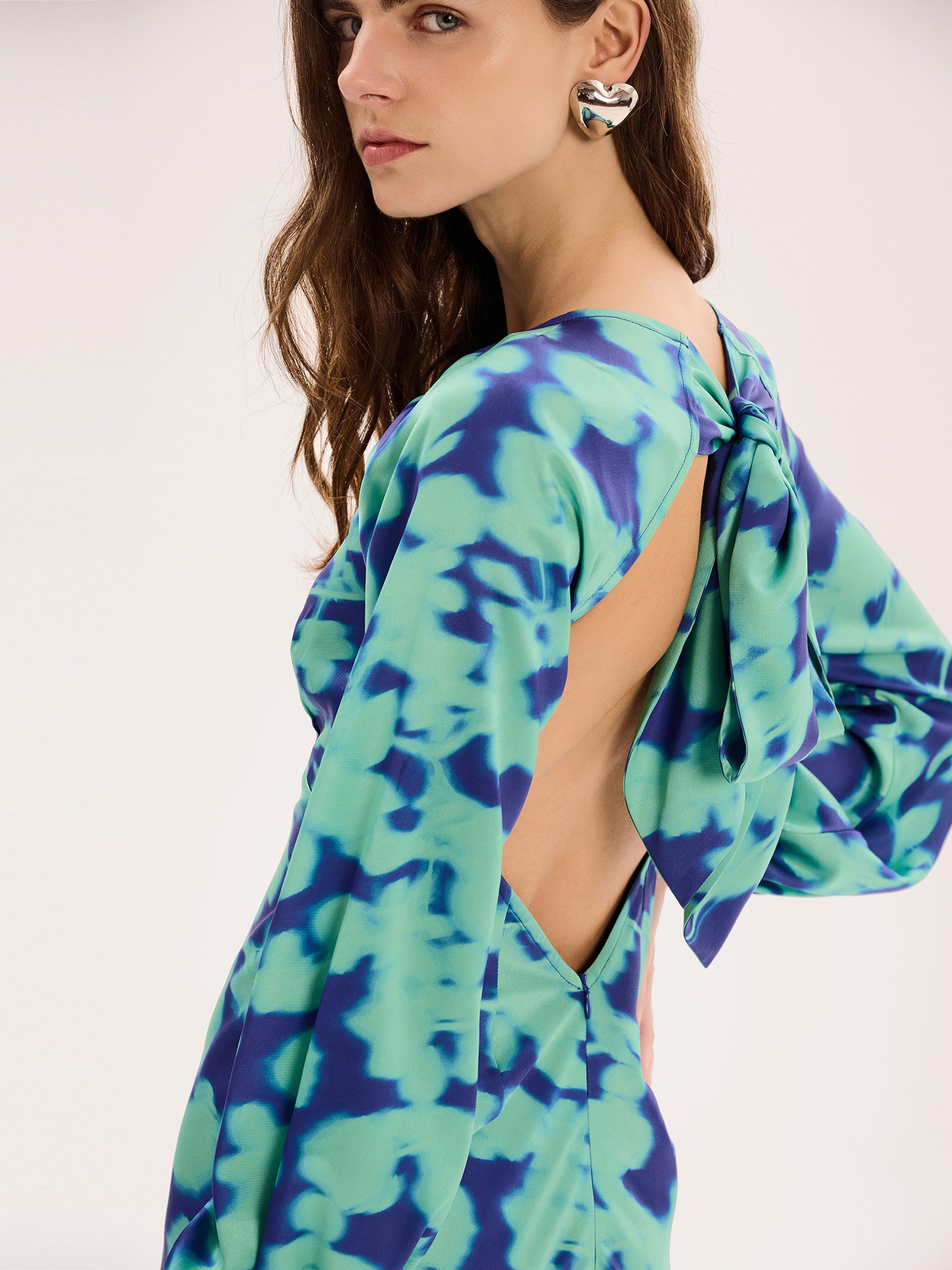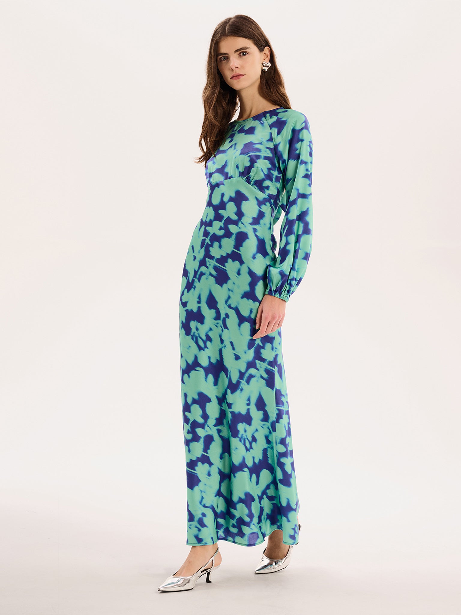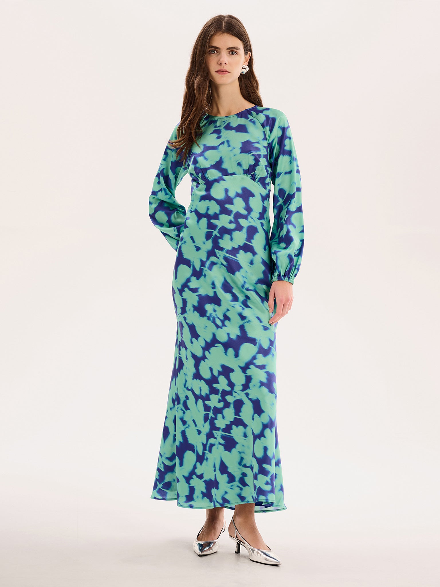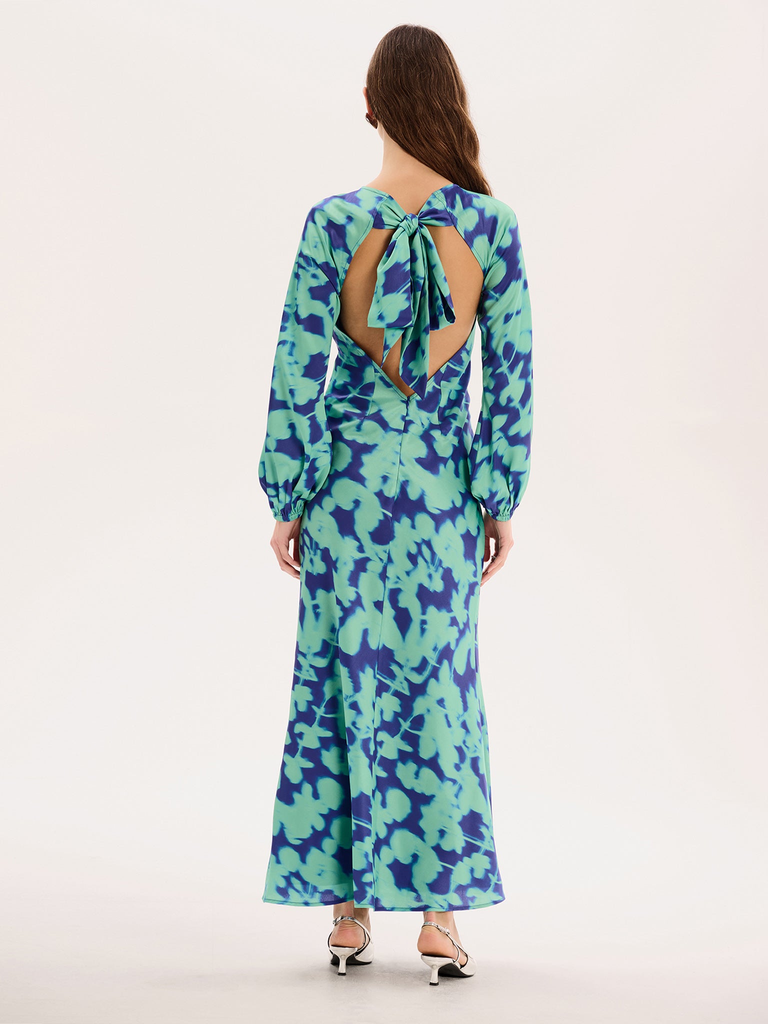 Joelle is all elegance from the front with a reveal at the back. Designed with long balloon sleeves and a button fastening at the back of the neck, her true beauty comes from the open back with sash detail. This recycled satin number features a blurred floral print in cool tones of cobalt and green.