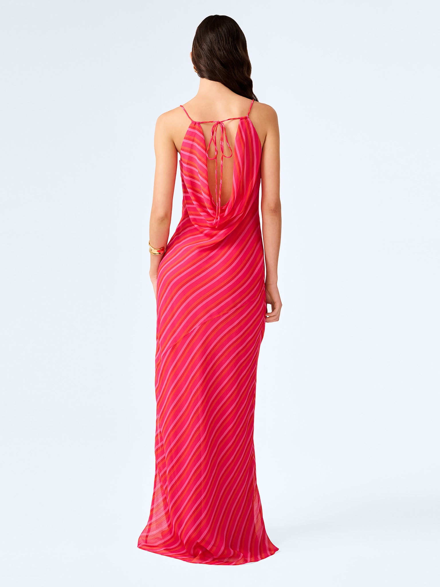 Koko is a slinky slip maxi dress in a floaty recycled polyester chiffon. She’s designed with a deep cowl back with tie detail adding just a touch of drama to the otherwise simple silhouette. In a vibrant orange, Koko is the kind of dress that makes a room take notice.