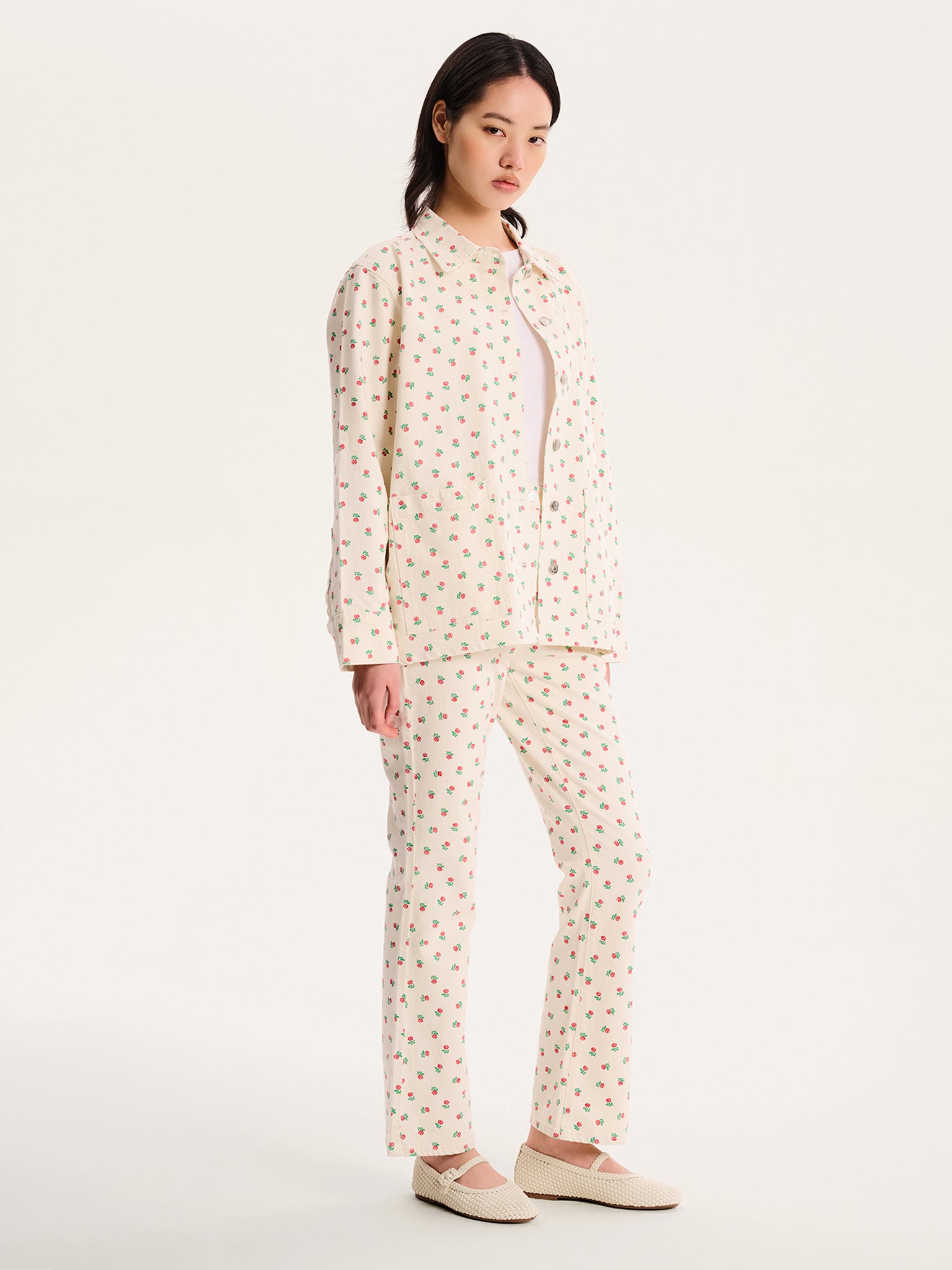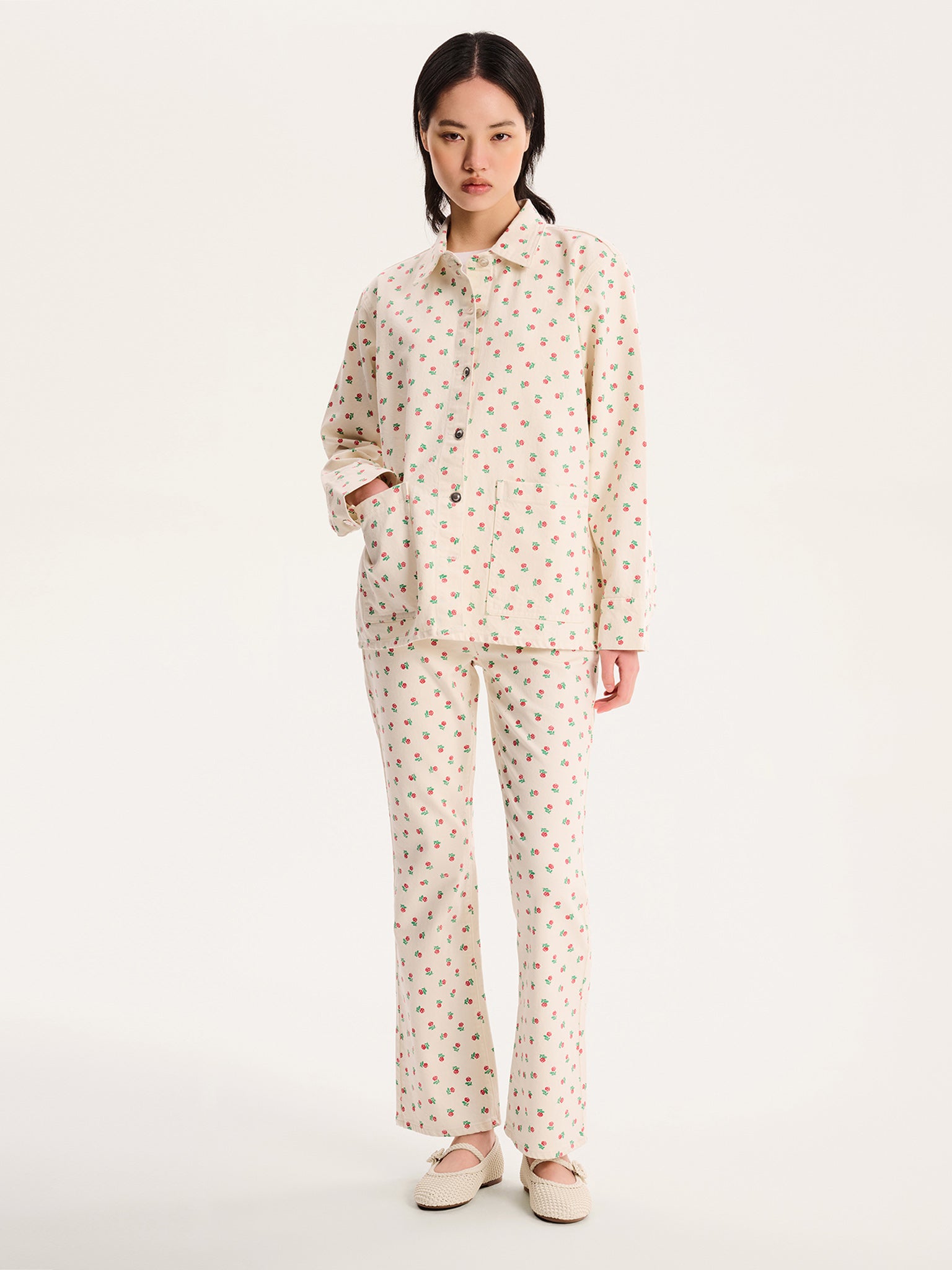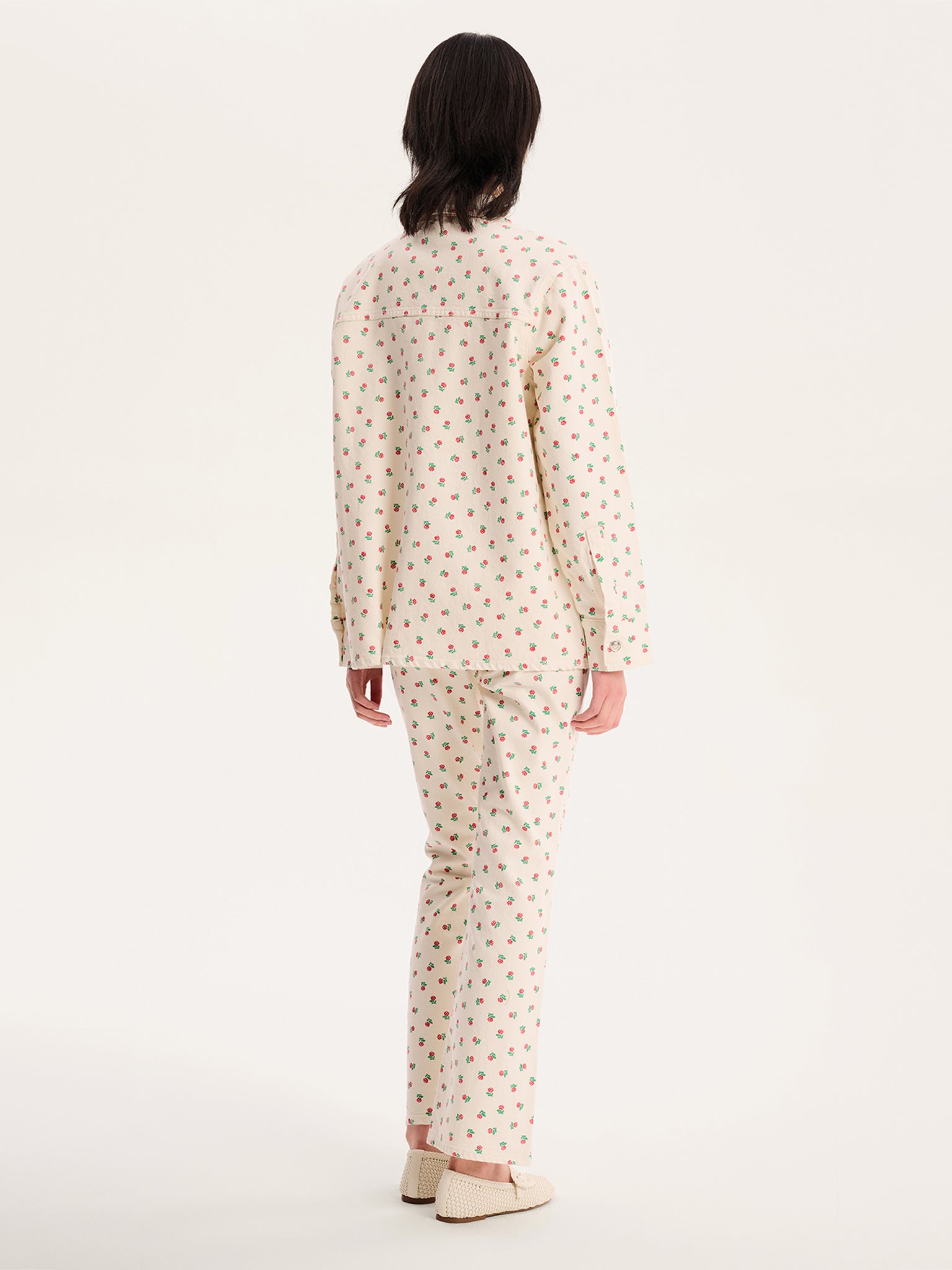 Denim oversized shirt jacket with rose print