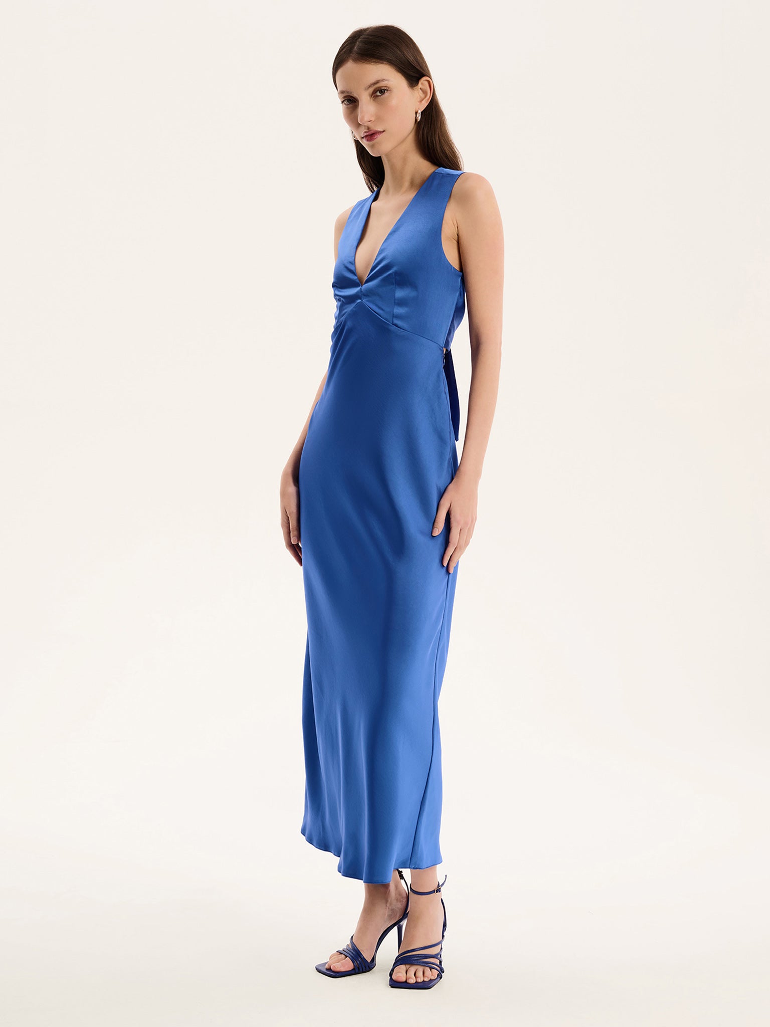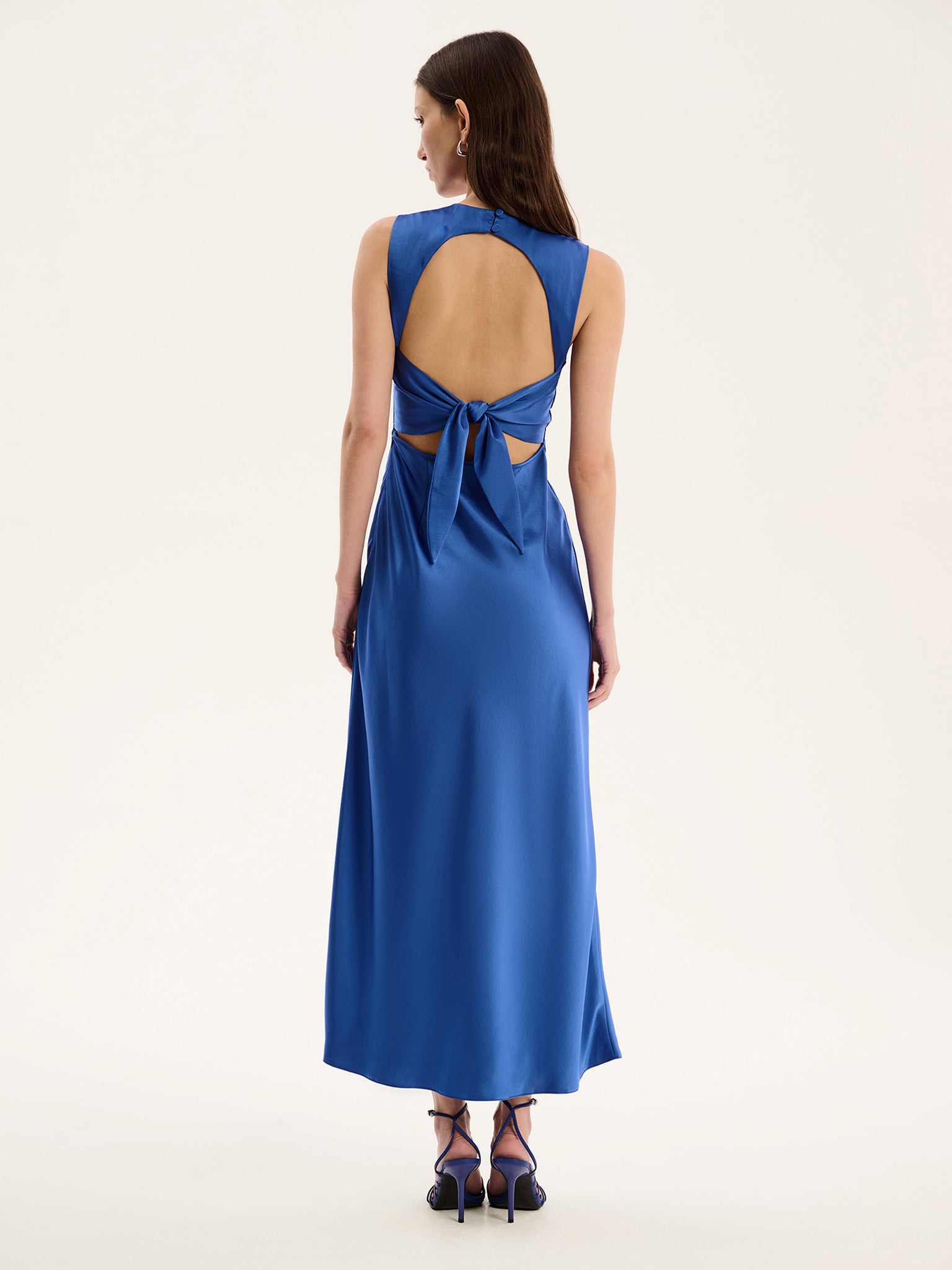 Model is 5' 8'' and wears size 8 Sleeveless tie back dress that hugs at the waist Maxi length dress that skims the hips and floats out at the hem Fit: Regular
