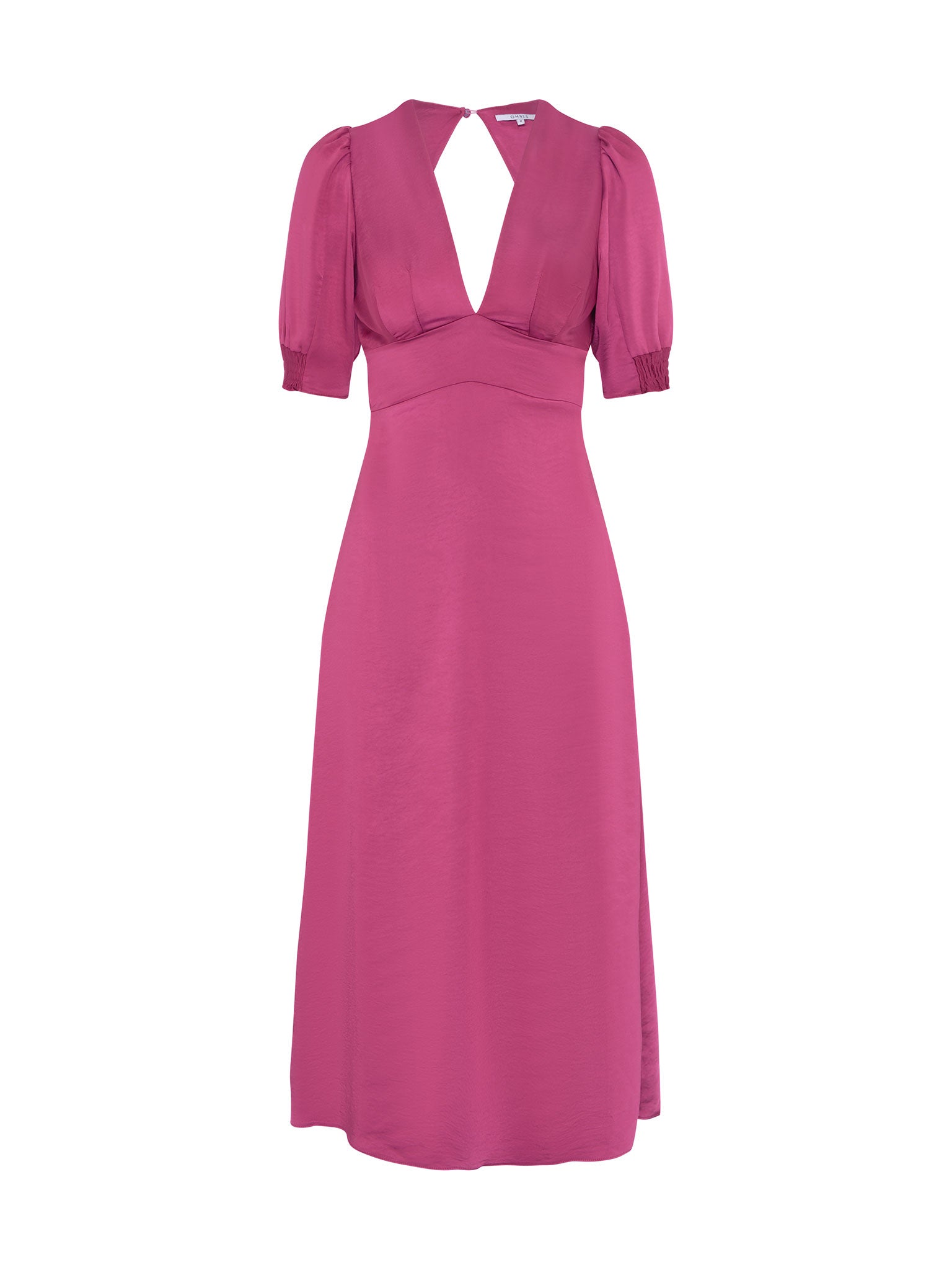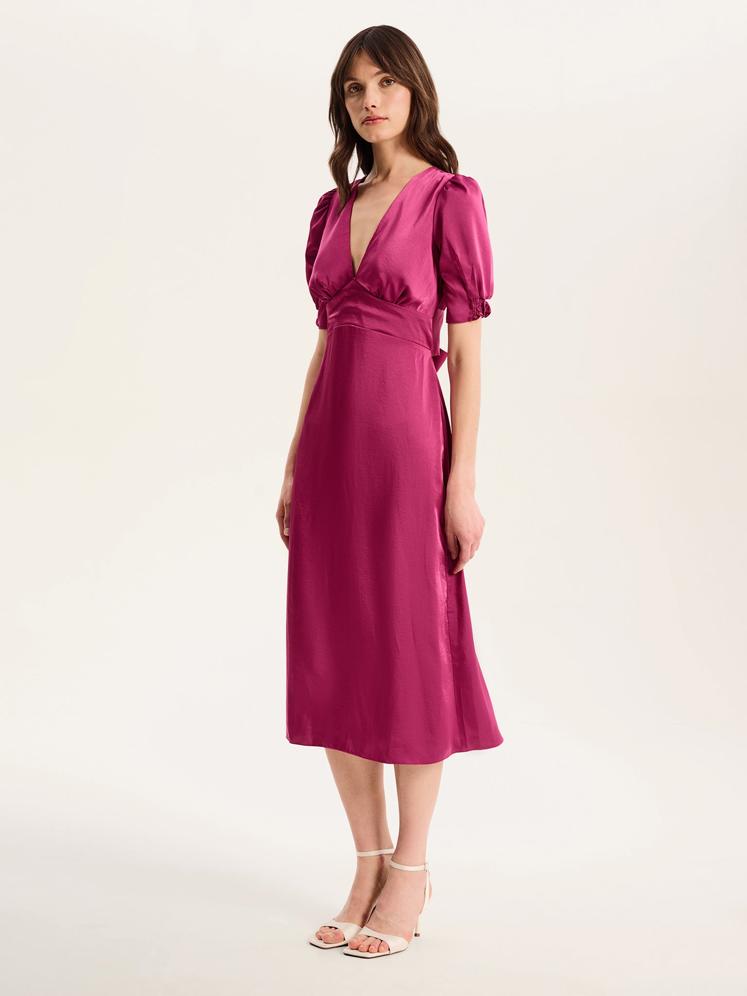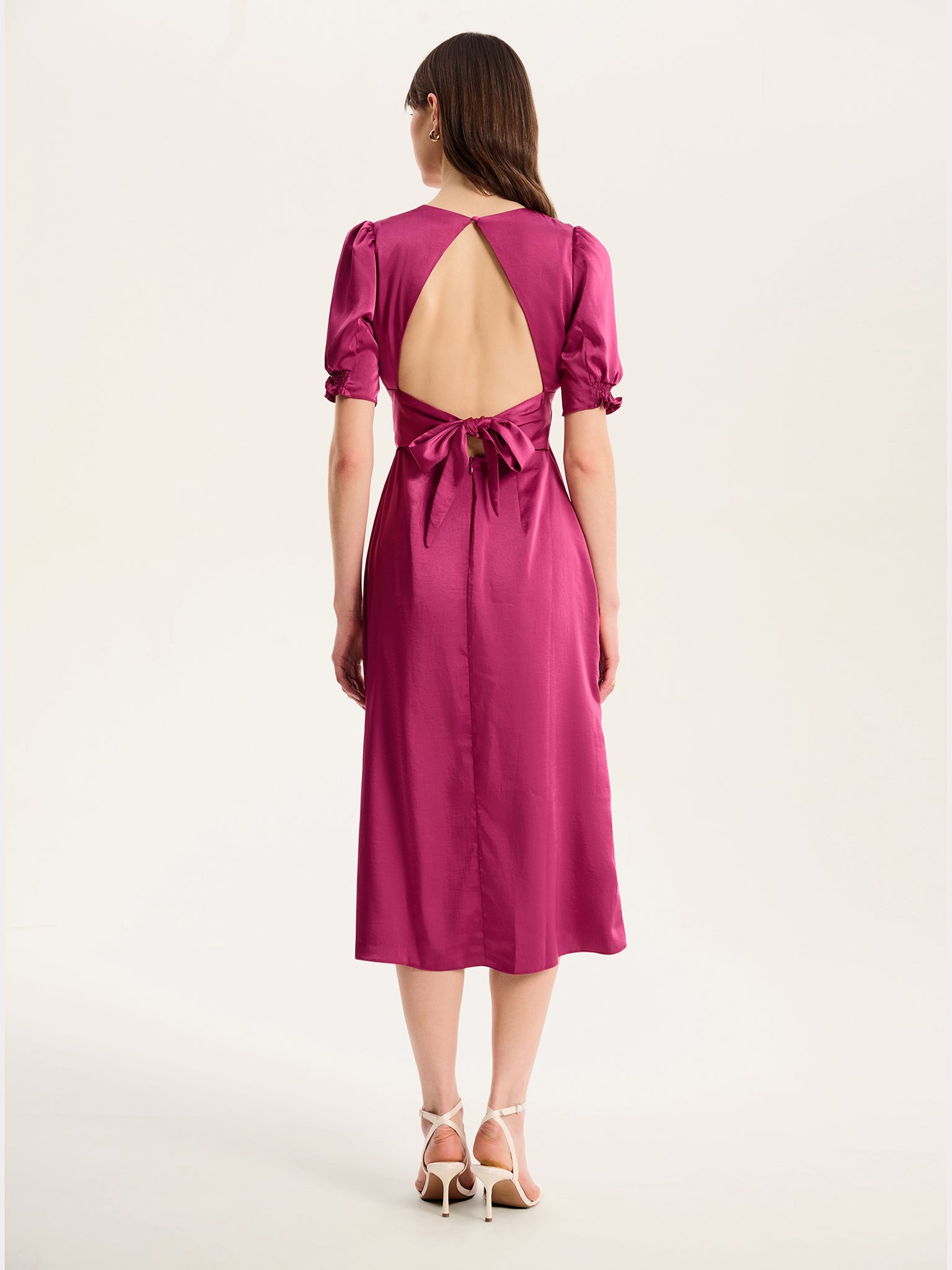 Odette is elegance with an edge. The 3/4 length sleeves are gathered at the bottom to create a feminine silhouette offset with a deep v-neckline. With an open back with sash detail, this dress in deep magenta recycled satin is a date night dream.