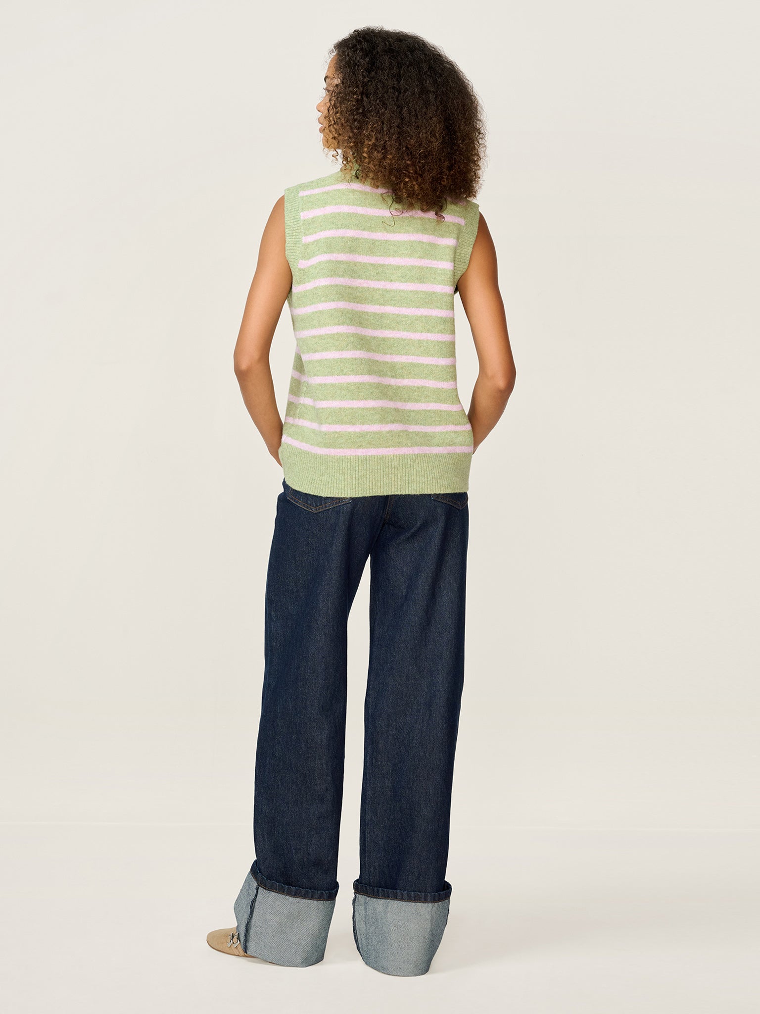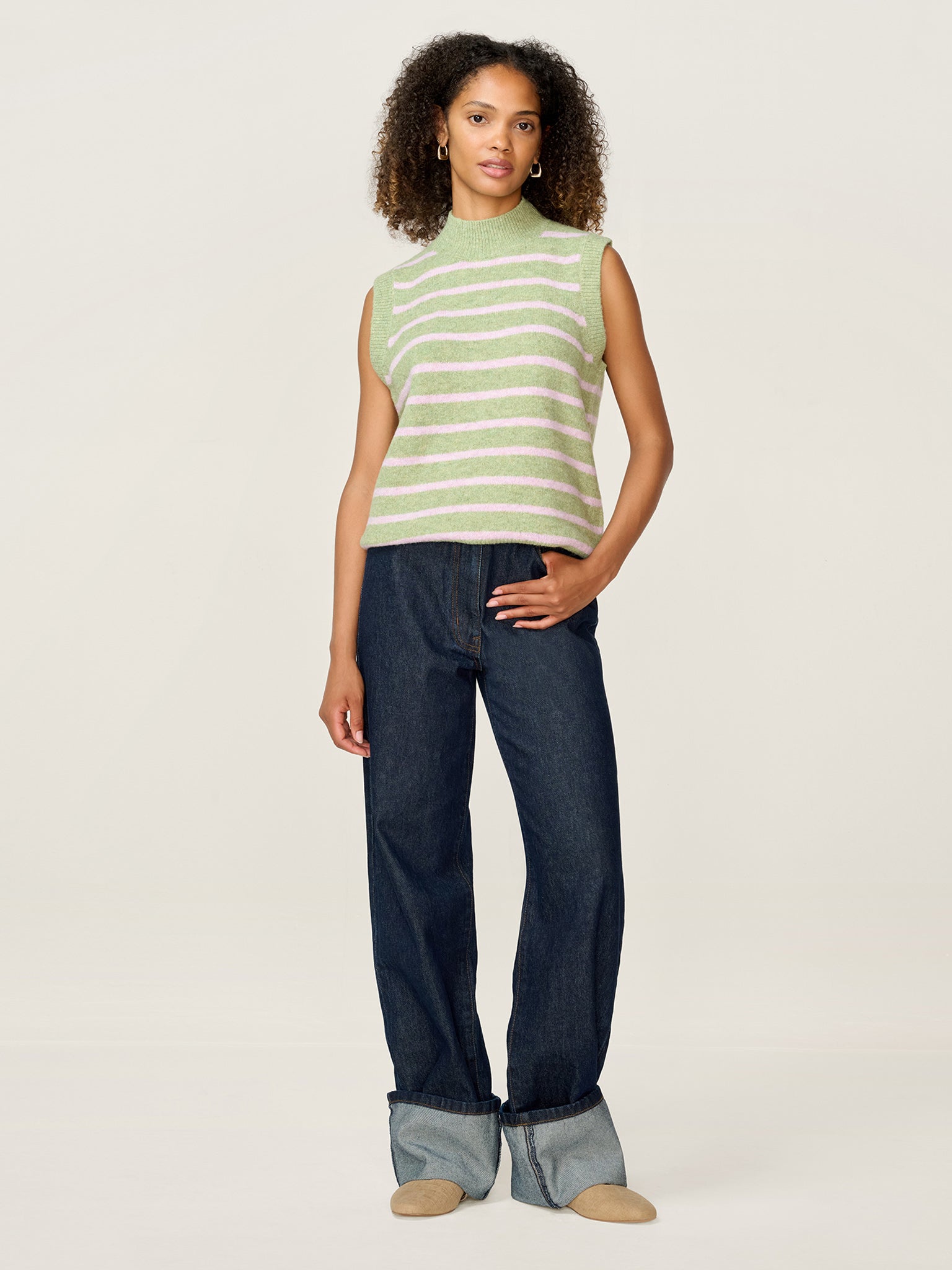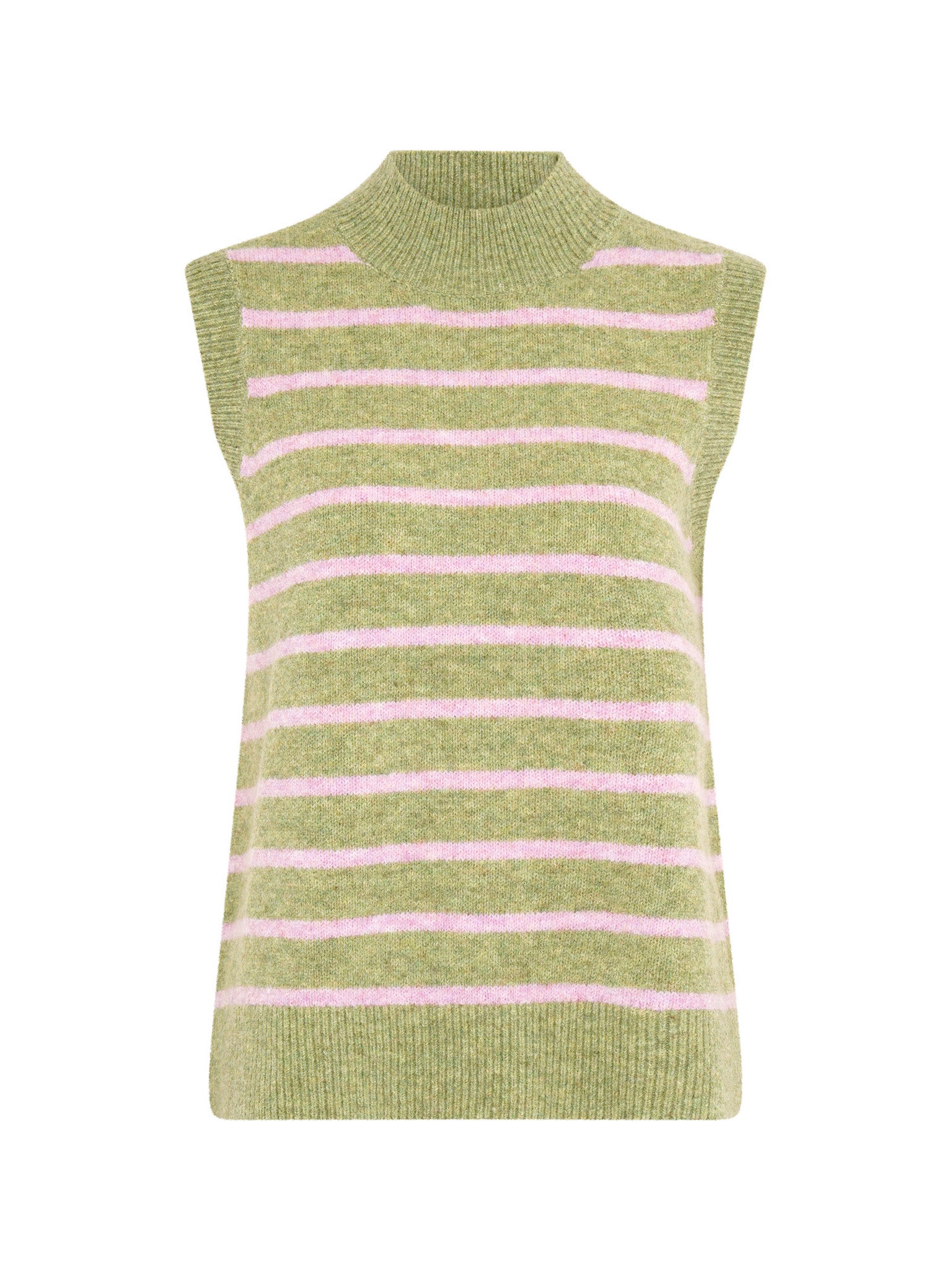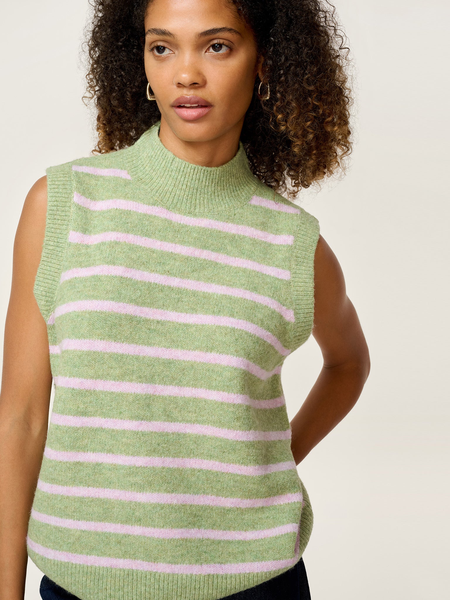The Paulie vest is all about fluffy comfort and simple colour, with a funnel neck and relaxed fit that layers effortlessly. A playful pink stripe set against a warm green base creates just the right amount of personality in this everyday knitted vest.