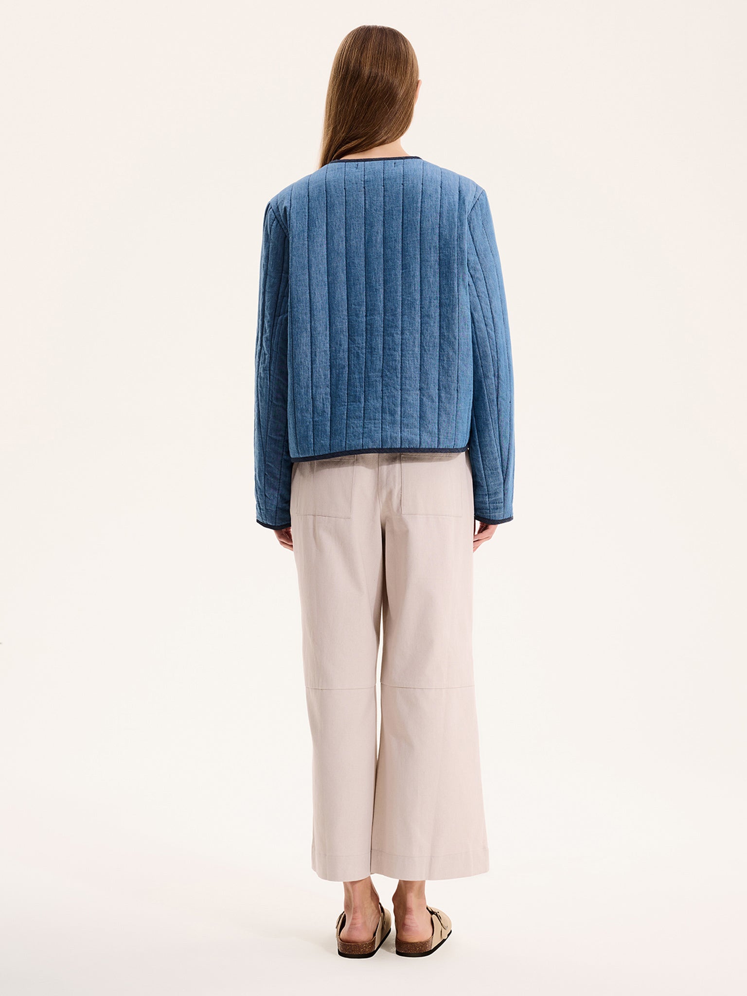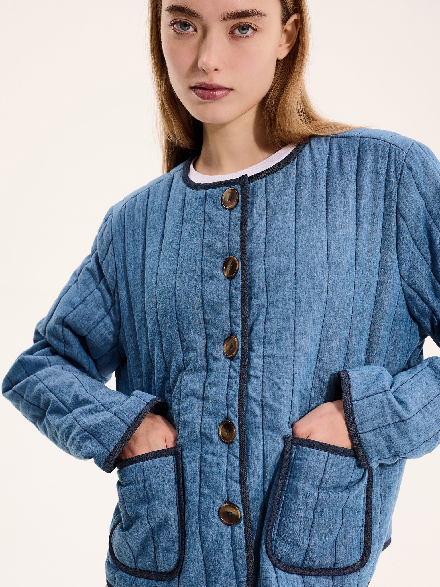 The Piper jacket is lightly quilted for all year layering with a button closure and patch pockets. Designed in a cool denim blue with a boat neck, it will add a touch of fun to any fit. This chambray jacket is crafted from BCI cotton with recycled polyester wadding for a relaxed fit.