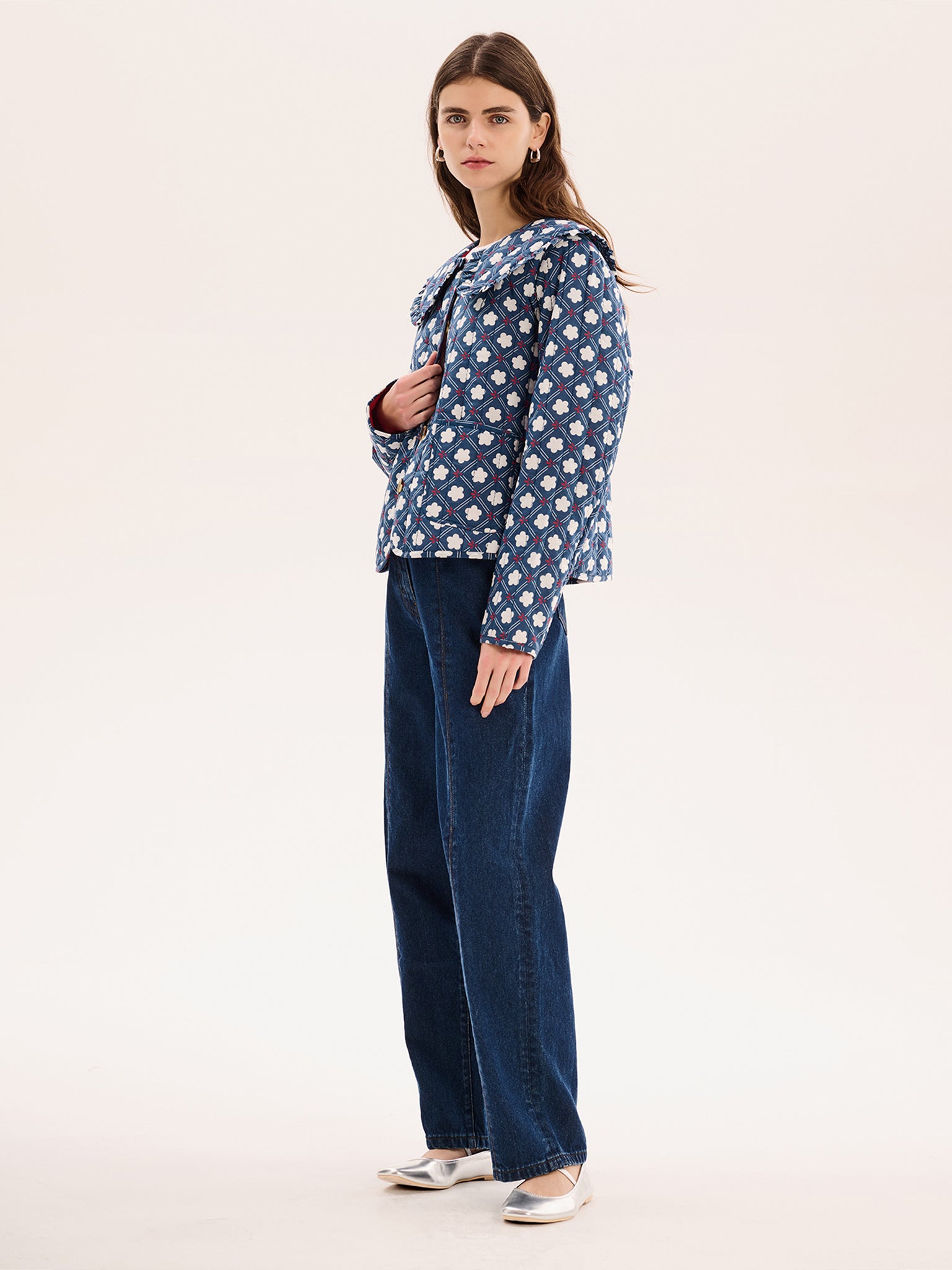 The Peggy jacket is lightly quilted for all year layering with a button closure and patch pockets. Designed with a large frill collar, the navy floral check pattern will add a touch of fun to any fit. Crafted from BCI cotton with recycled polyester wadding for a relaxed fit.