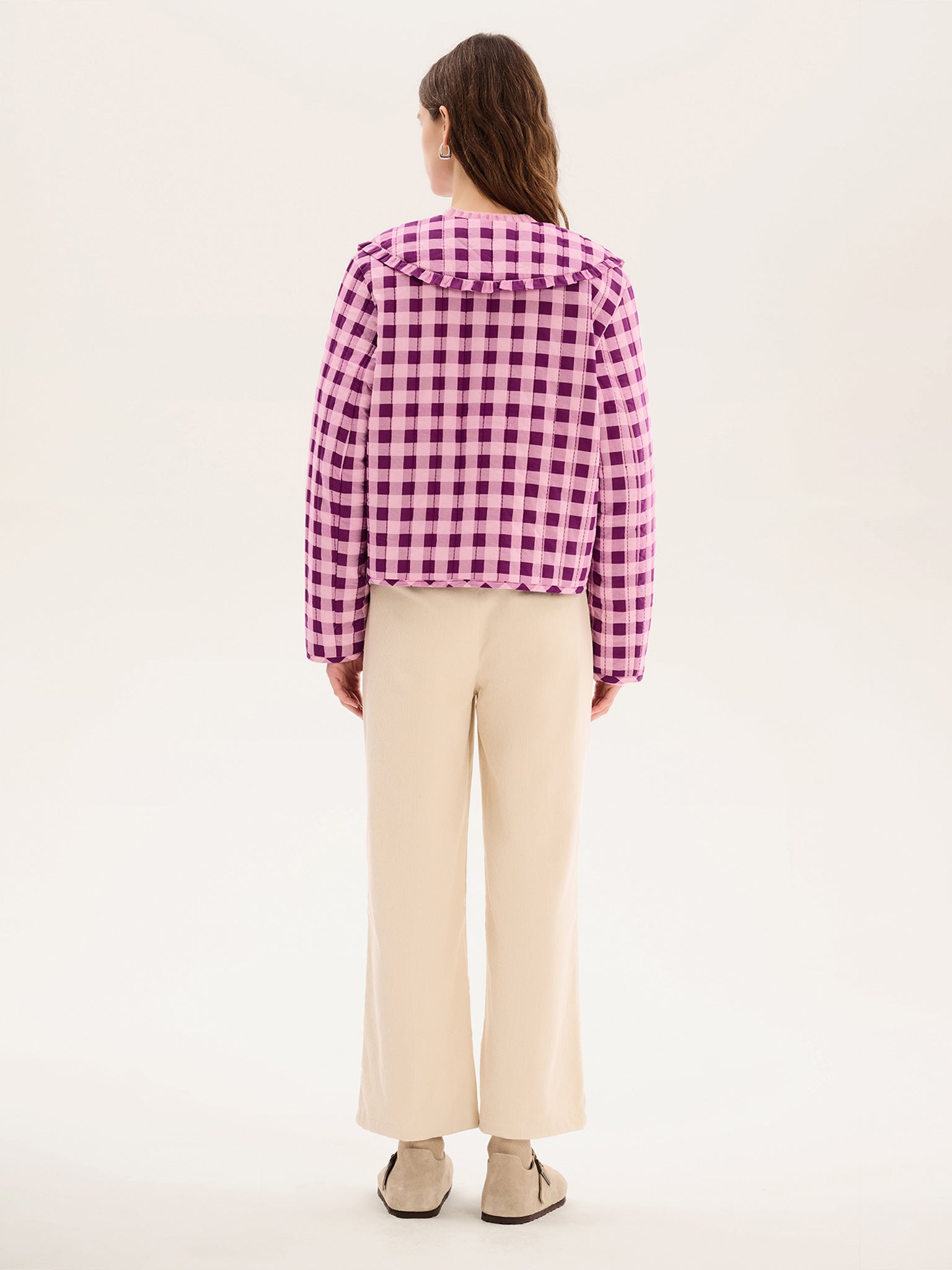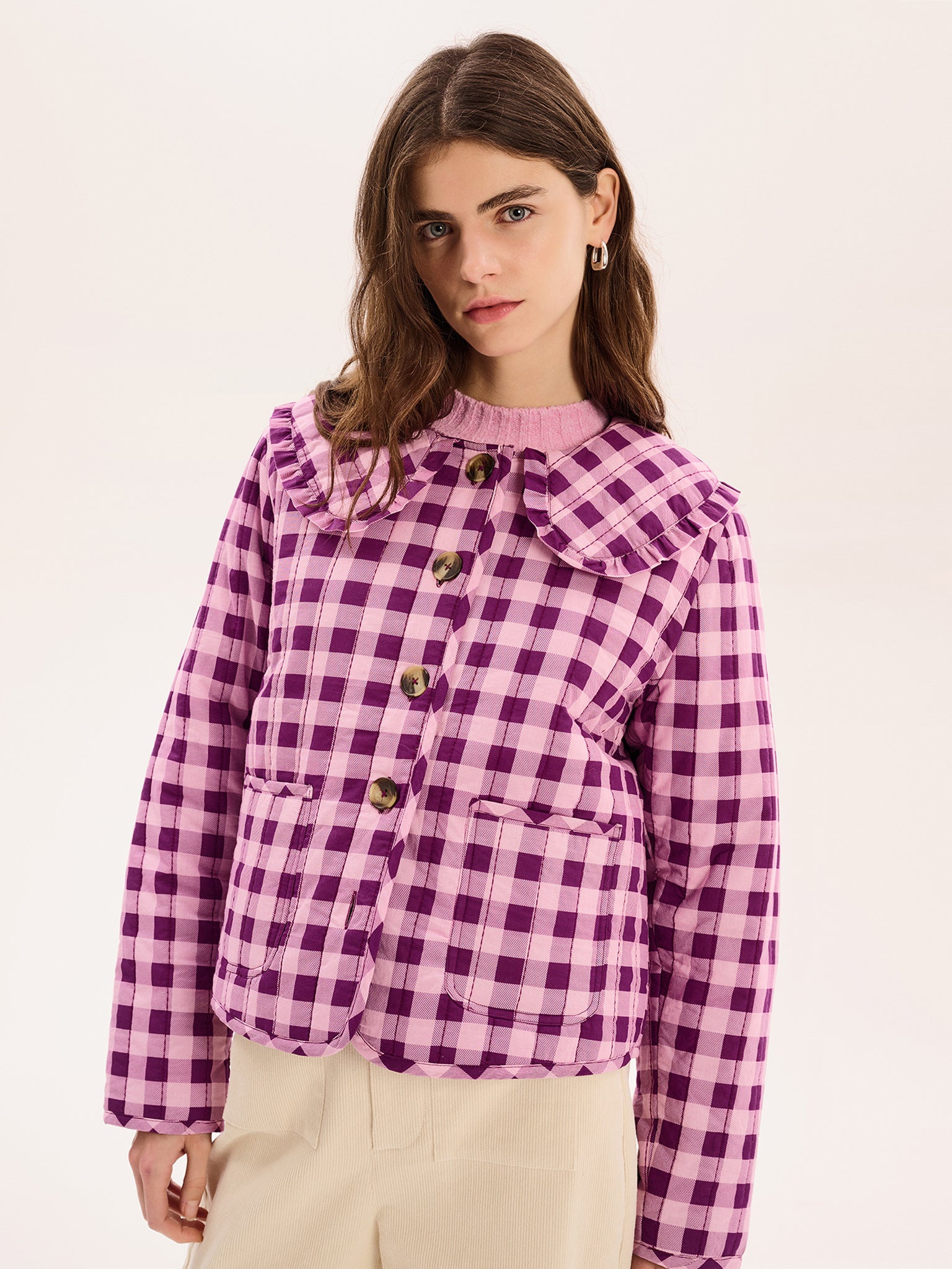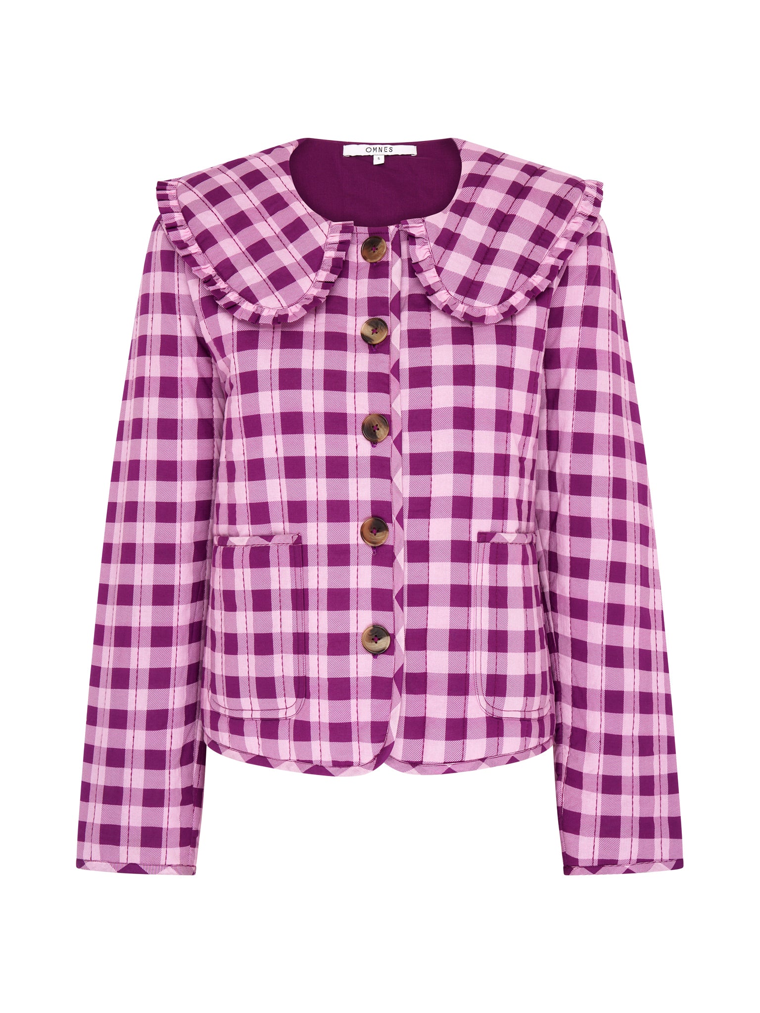 The Peggy jacket is lightly quilted for all year layering with a button closure and patch pockets. Designed with a large frill collar, the tonal burgundy gingham print will add a touch of fun to any fit. Crafted from BCI cotton with recycled polyester wadding for a relaxed fit.