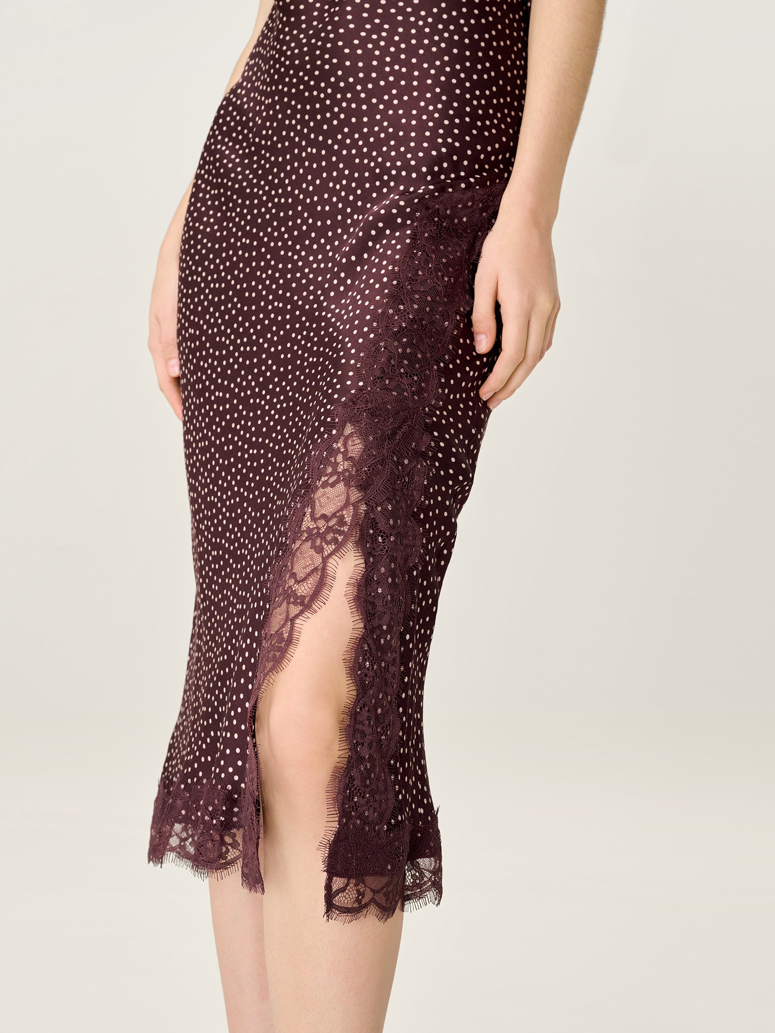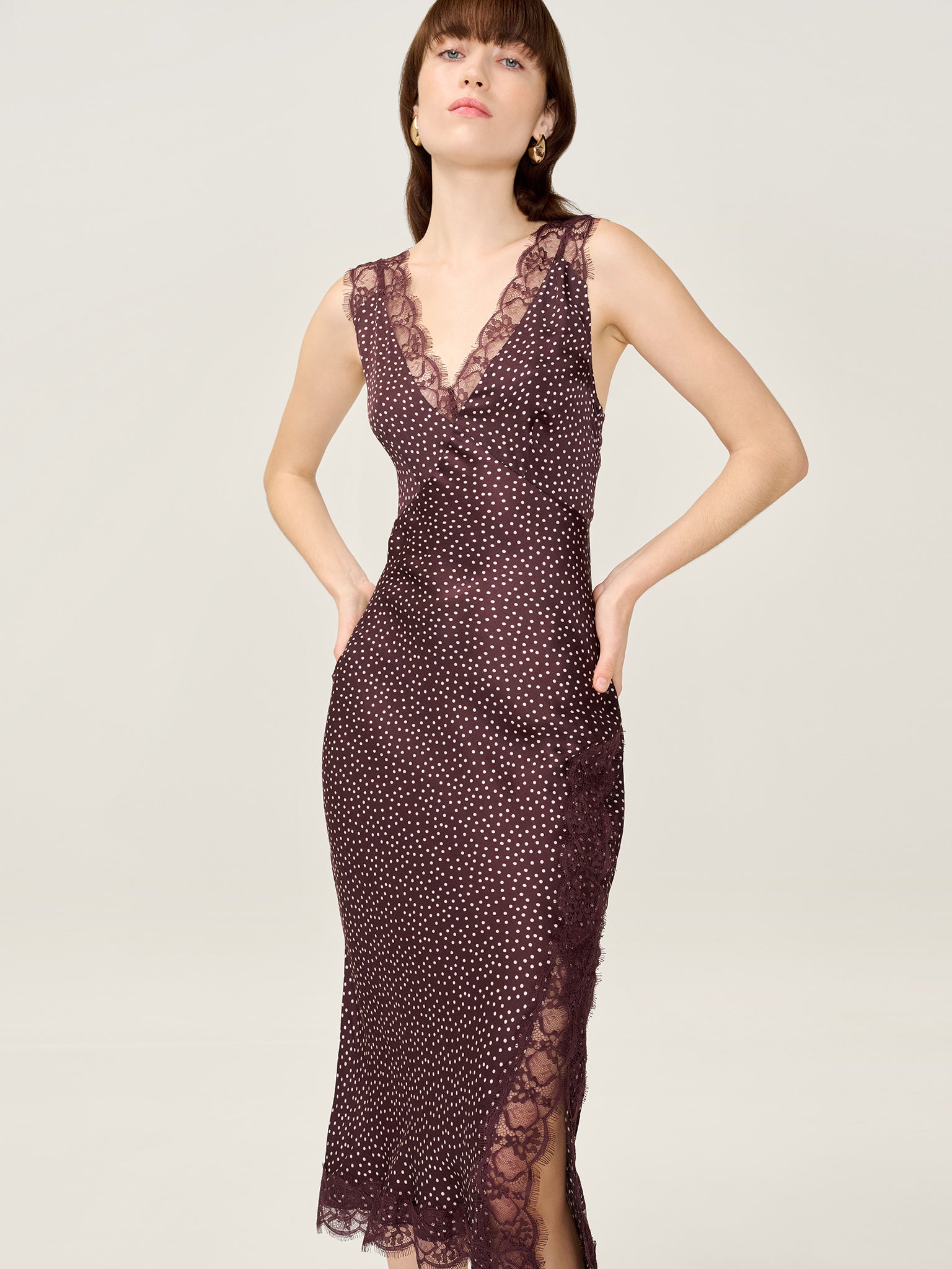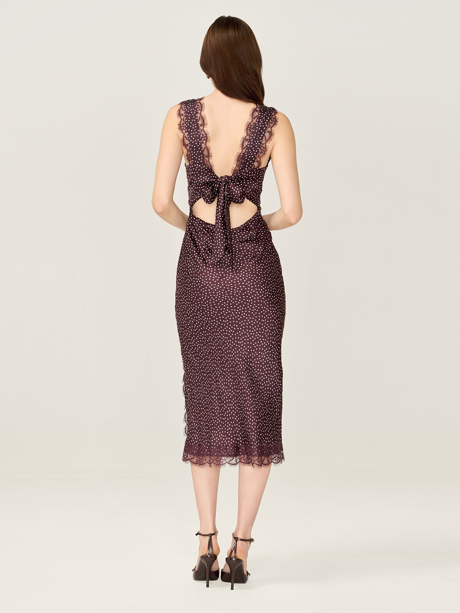 Modern meets romantic in the Penny dress, crafted from soft viscose in a rich chocolate brown polka dot print. Designed to flatter, this knee-length silhouette features delicate lace trim with a leg slit for a little flirty detail. The open back with sash tie creates a statement silhouette, perfect for date nights or layering knitwear for effortless day-to-evening dressing.