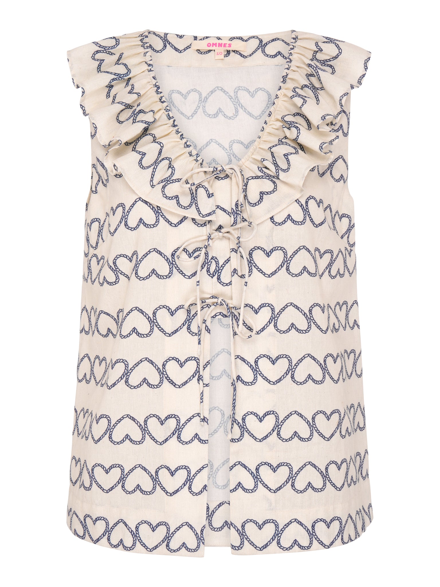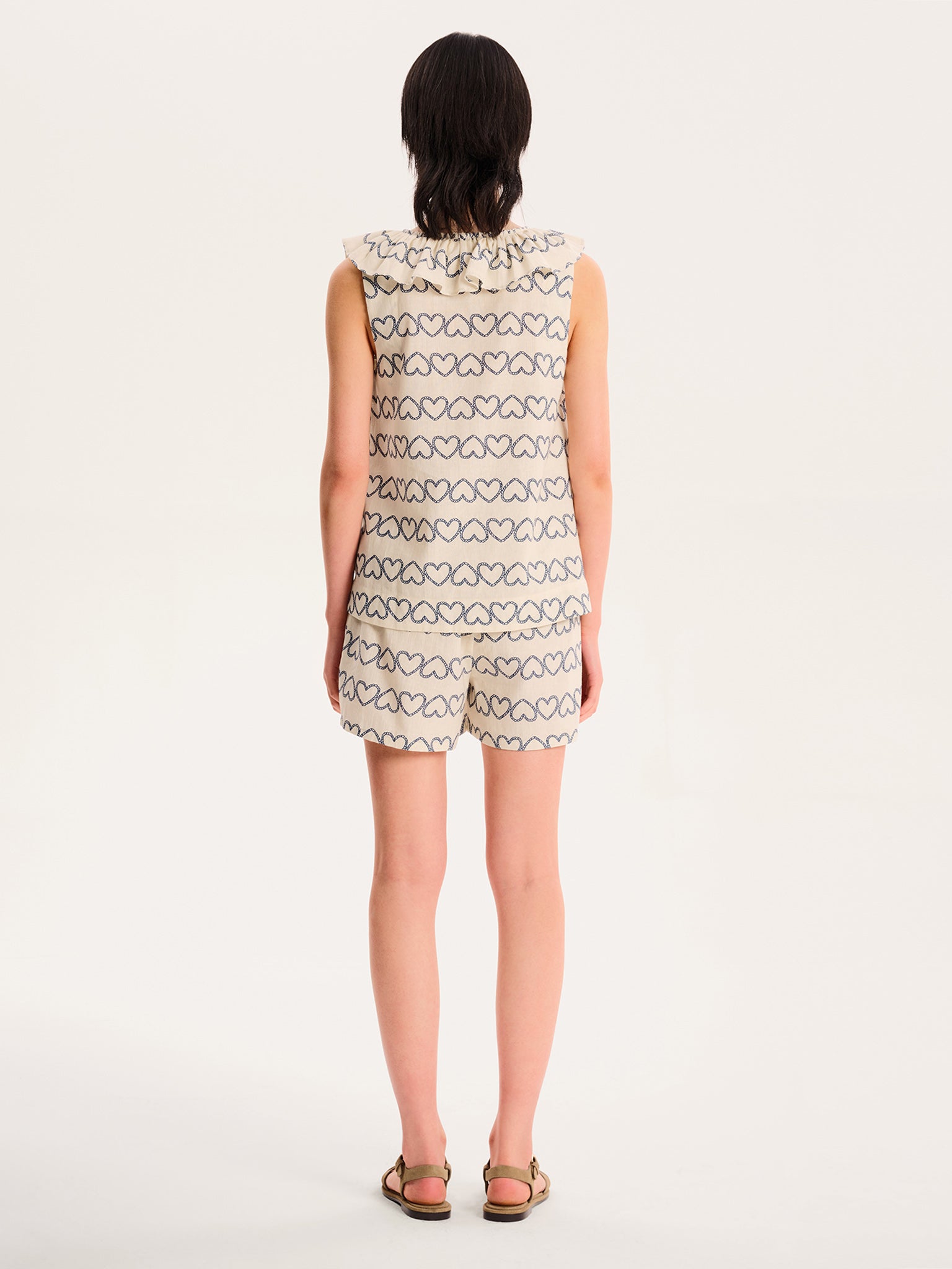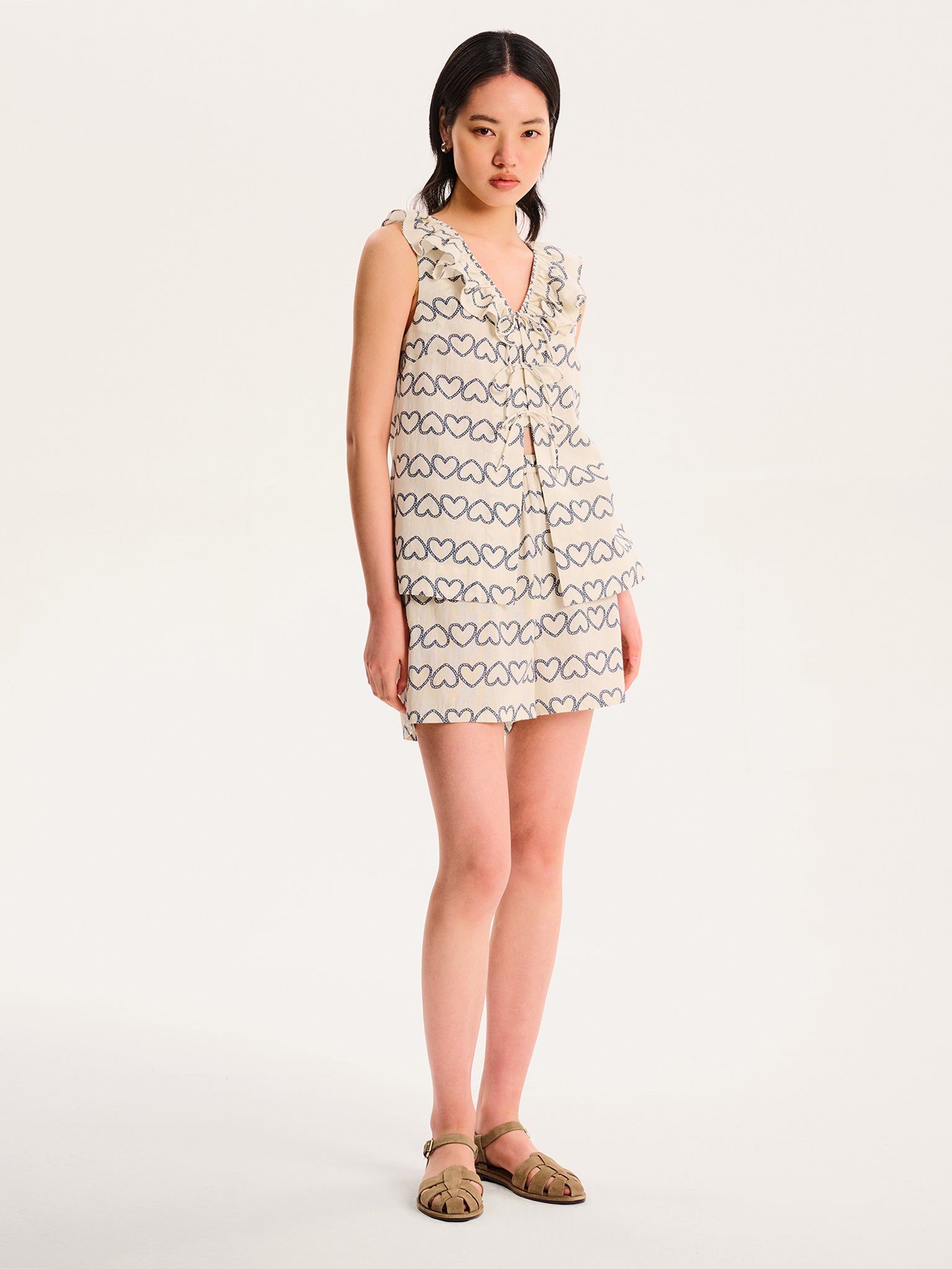 Crafted from responsibly sourced cotton-linen mix, Rachael is the kind of top you can dress up, layer with or simply thrown on for an effortless look. Featuring a frill collar and tie-up front, she’s designed in timeless white with a heart rope print. Pair with matching Joshua shorts for the ultimate summer co-ord.