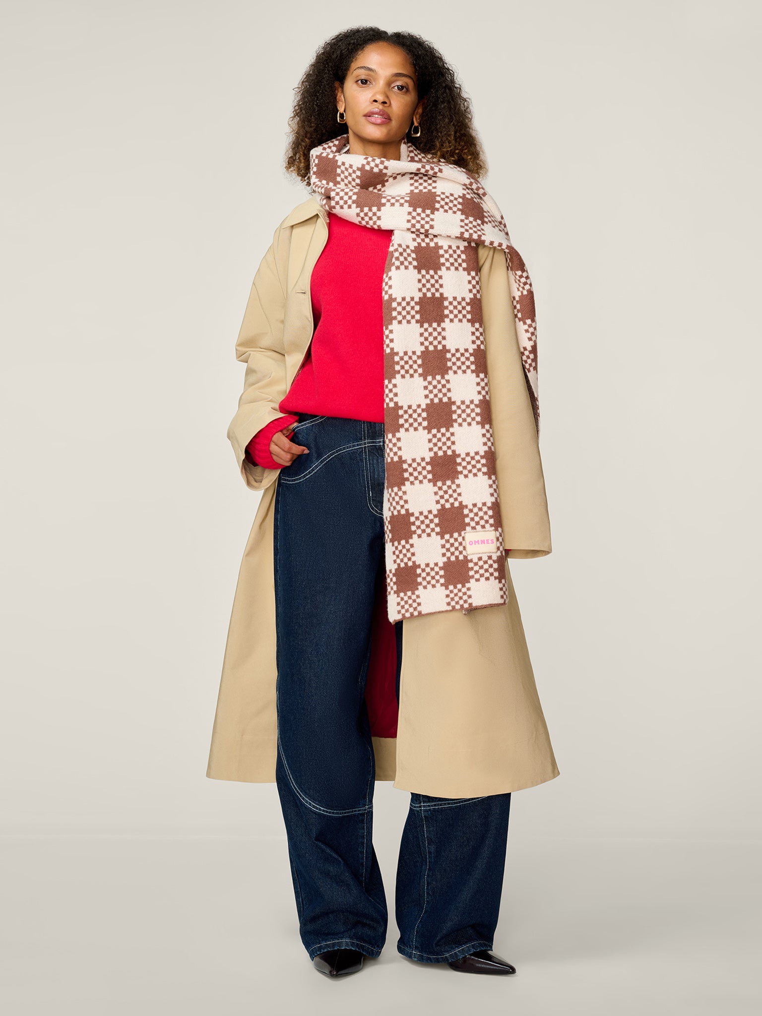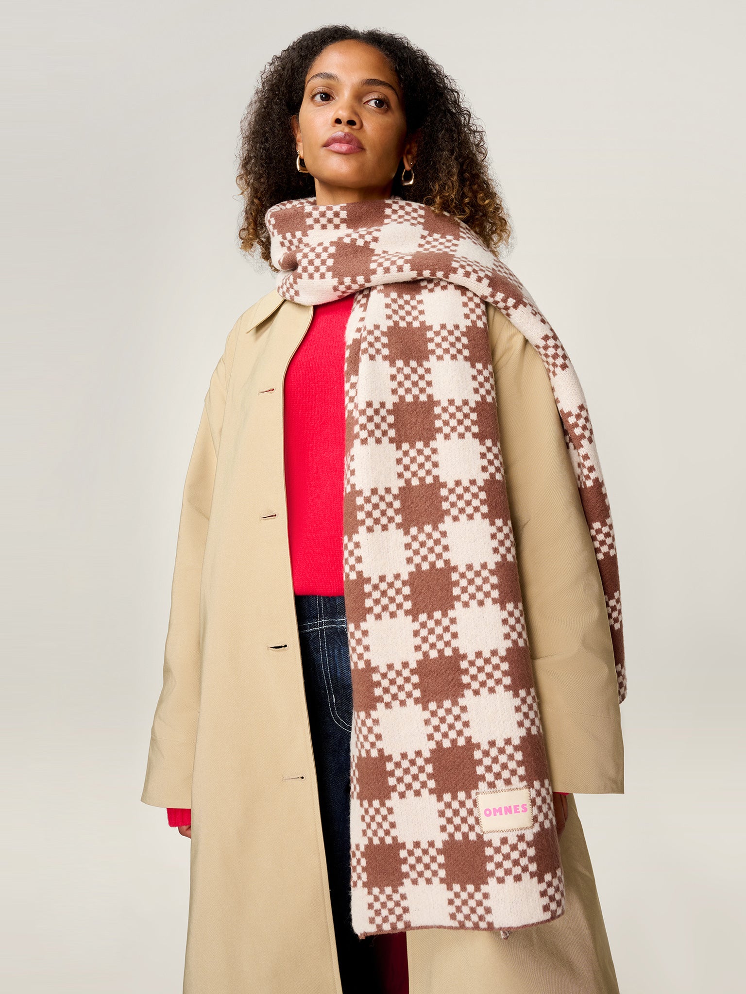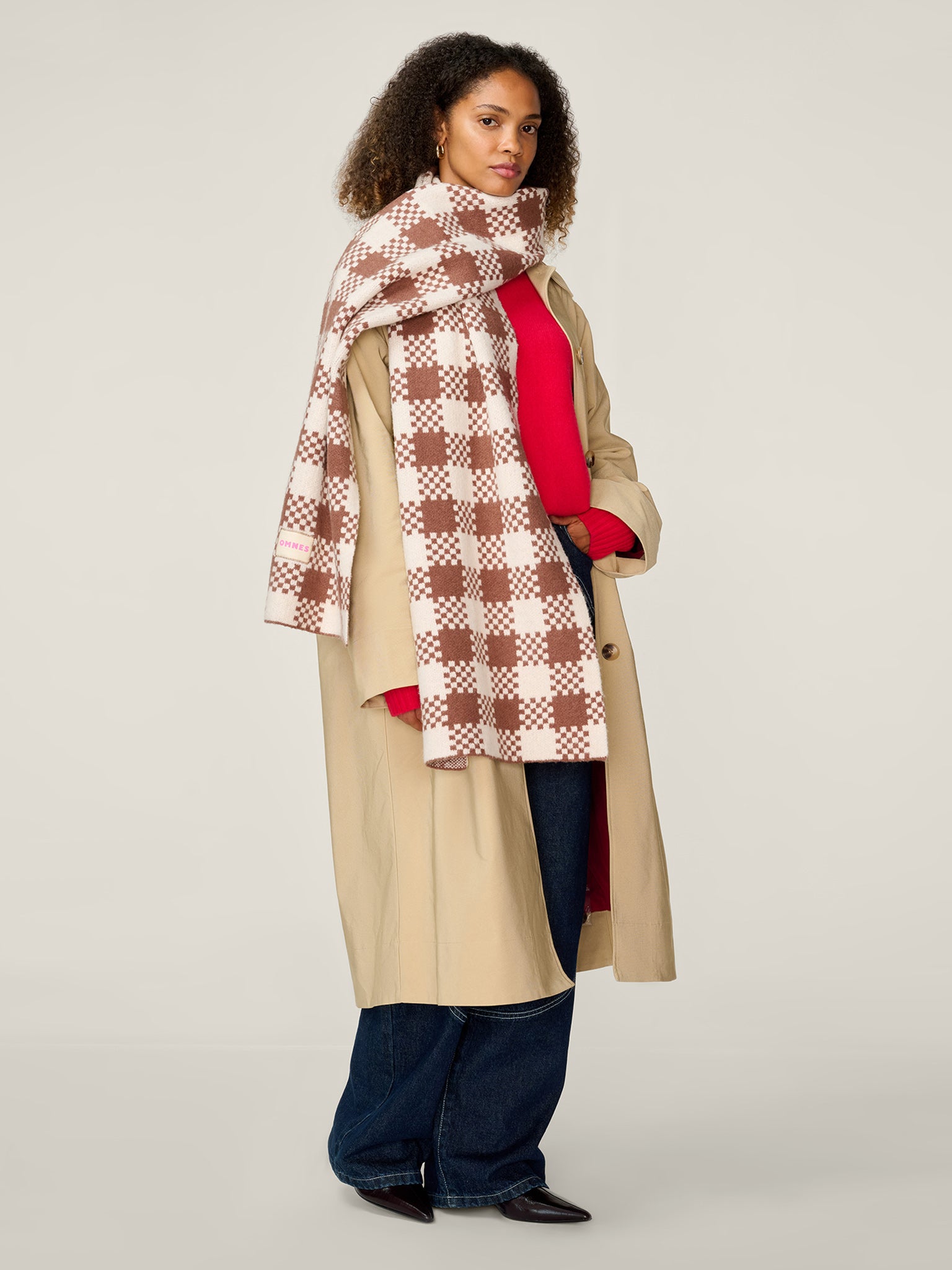 Rejina is made for wrapping up well. Woven in a soft, brushed finish with a rich chocolate and cream check design, this wide scarf brings warmth and personality in equal measure.