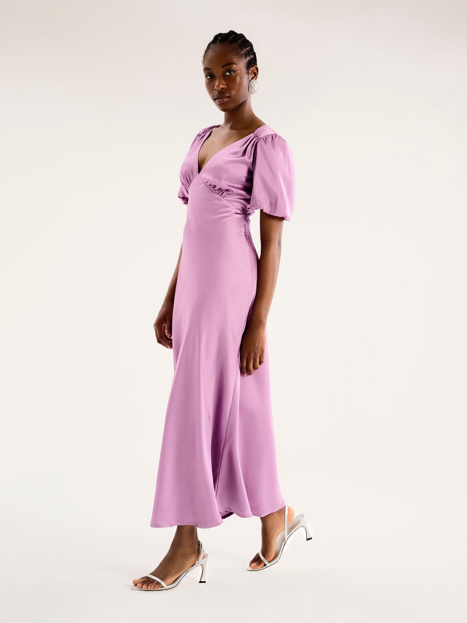 In a soft lavender tone, Rosie is as effortless as she is elegant. Short balloon sleeves playfully draped in our signature recycled satin add a twist of texture to this classic neckline. Maxi in length and bra-friendly, she’s the perfect bridesmaid, wedding guest or date night dress. Rosie is the dress that does it all.