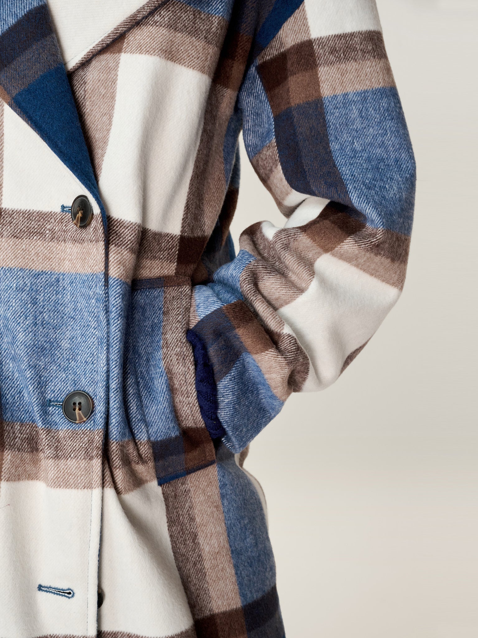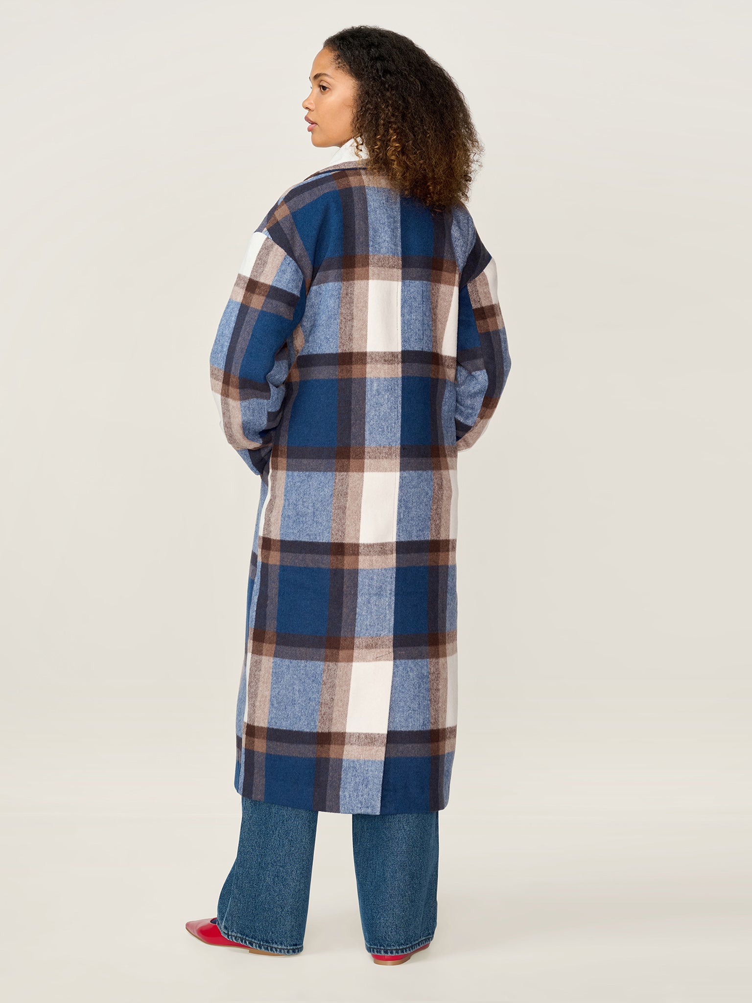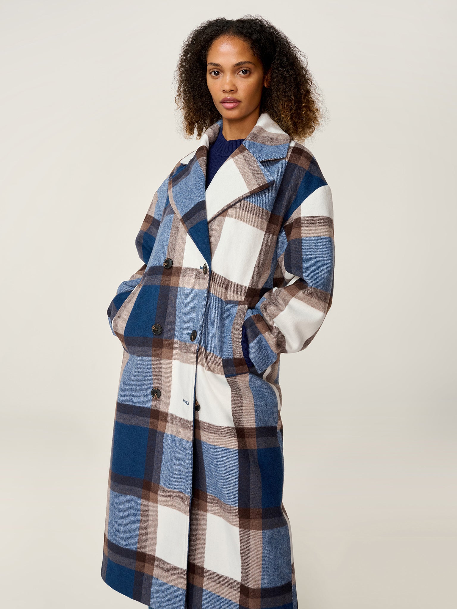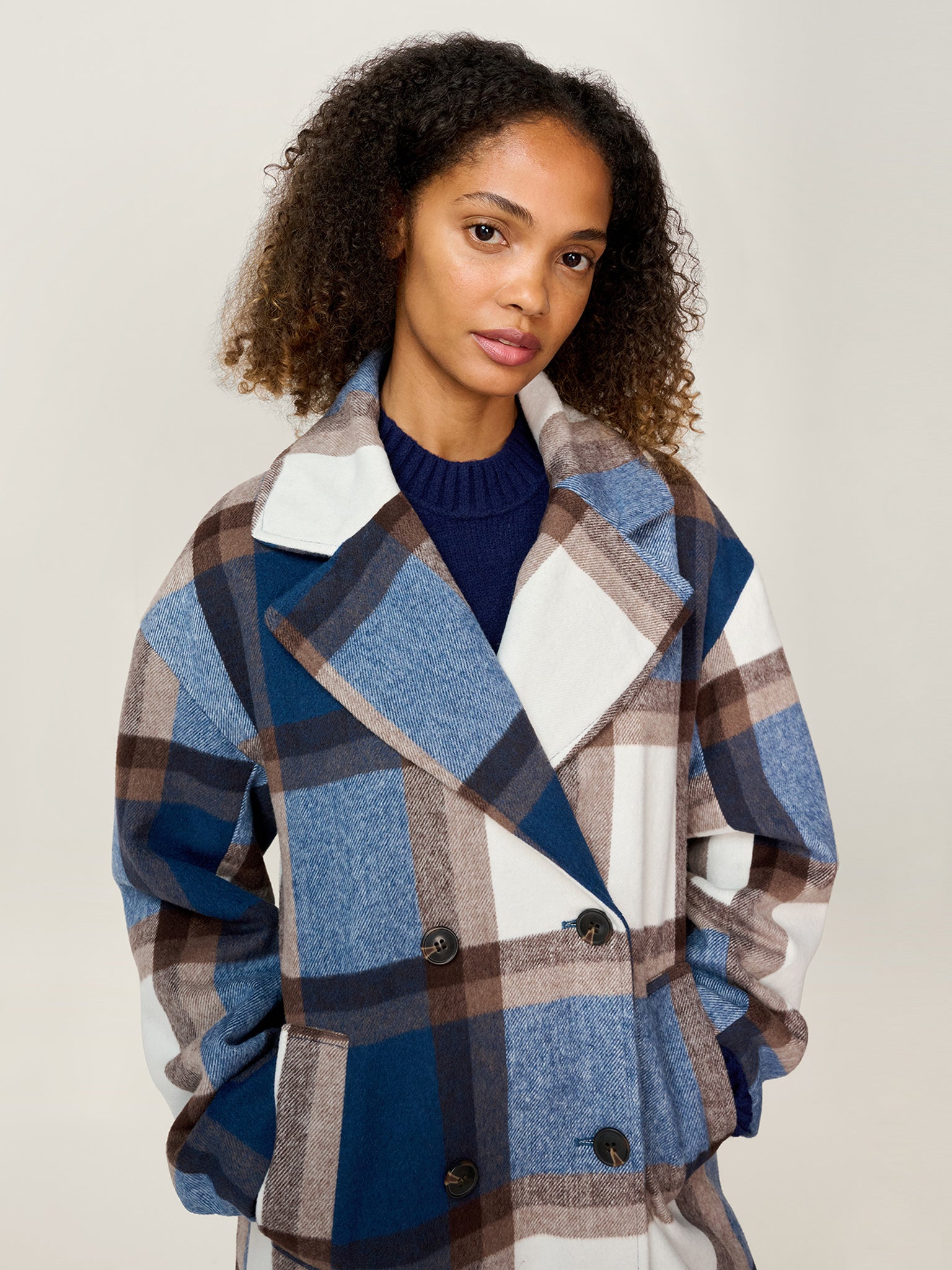 Tina is your go-to for layering with ease. Crafted from a warm wool blend in a blue and brown check print, this long, oversized coat features classic lapels and a relaxed silhouette for a look that’s effortlessly put-together. Whether thrown over casual denim or styled with tailoring, Tina adds instant polish and warmth to your winter wardrobe.