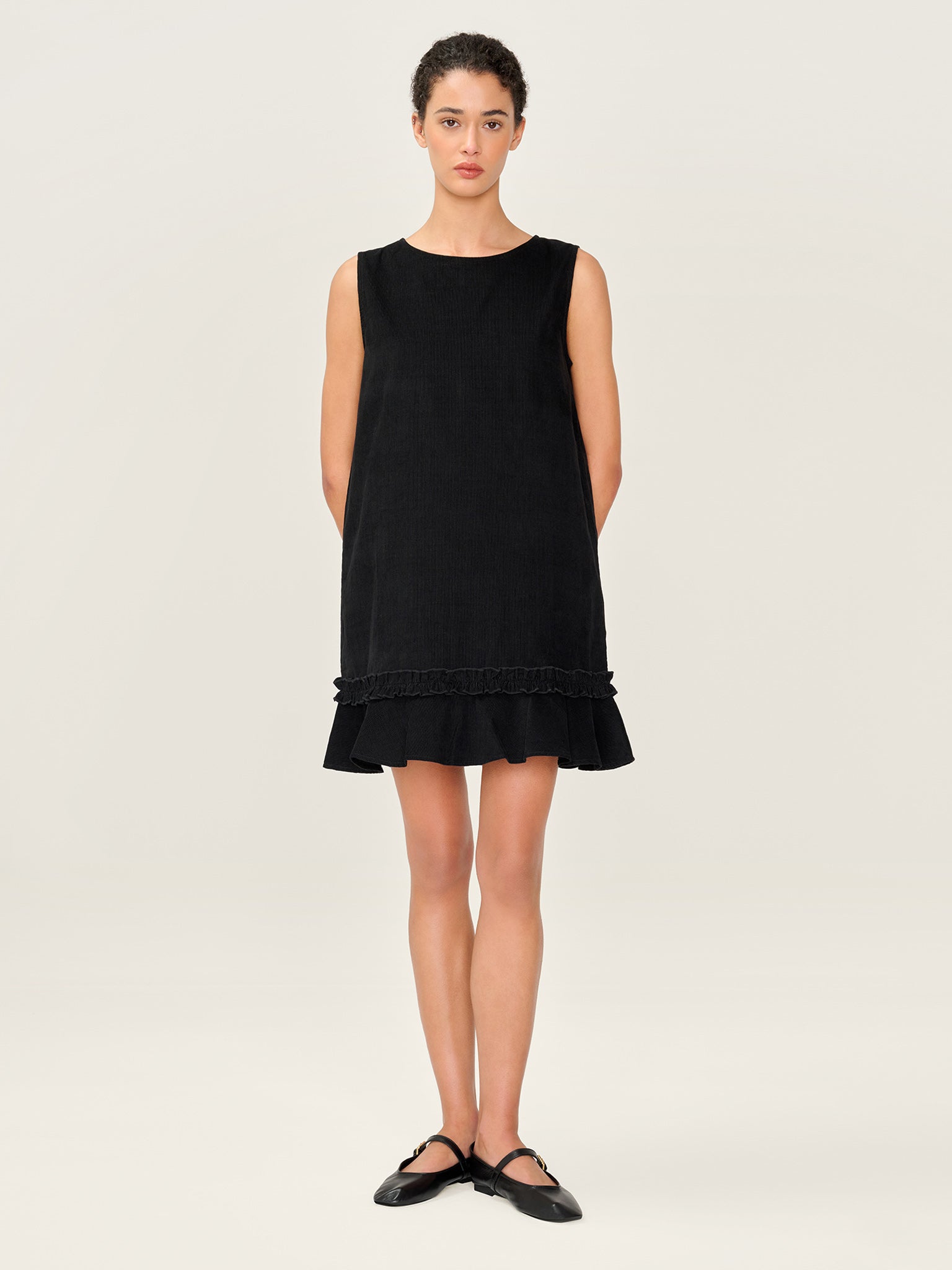 The Adora dress brings texture and polish to your everyday wardrobe. Crafted from soft black corduroy, this mini dress features a sleeveless A-line silhouette that’s as flattering as it is easy to wear. A subtle ruffle hem adds a feminine finish whether styled solo or layered over a shirt or knit, Adora does it all.