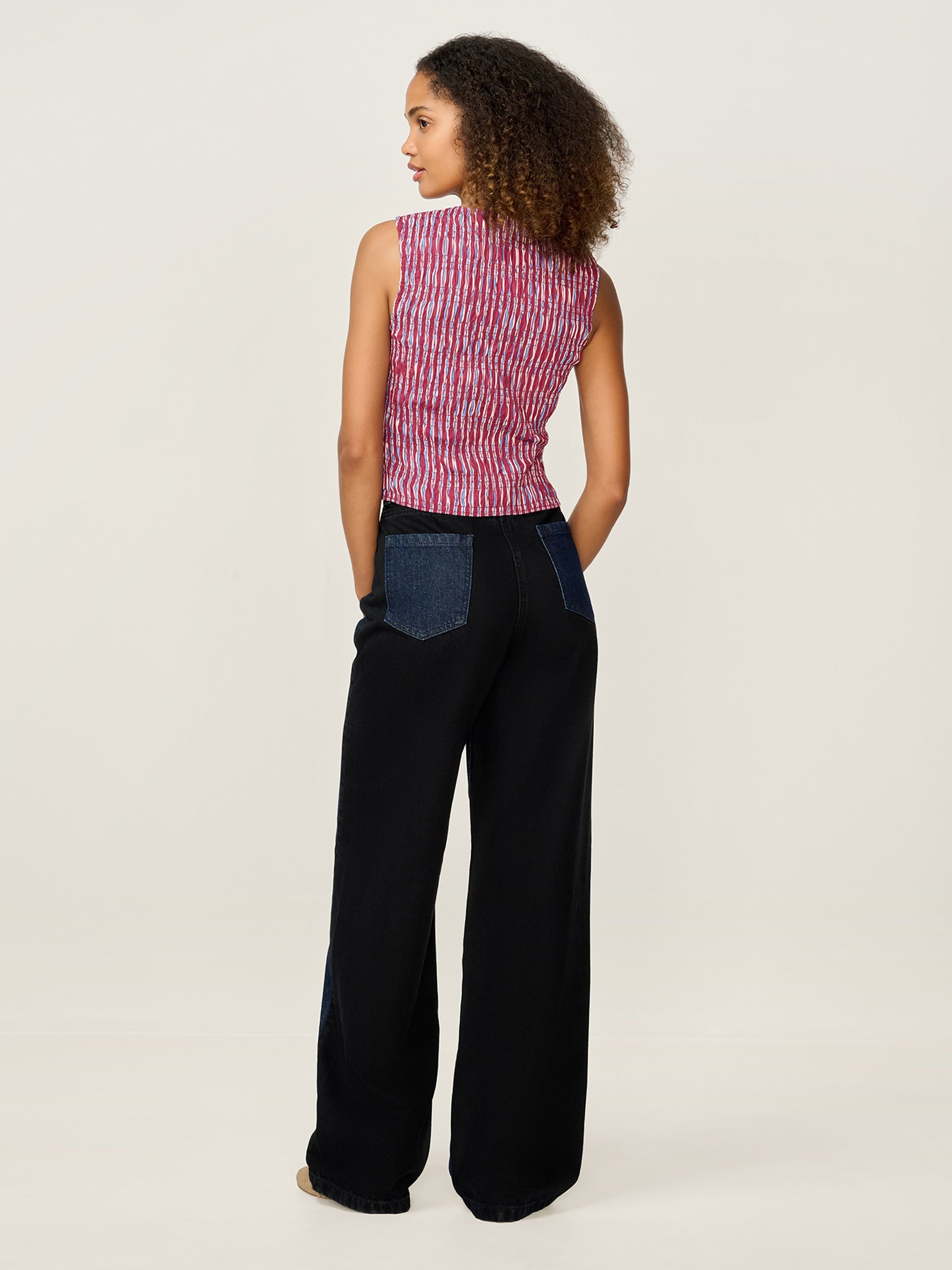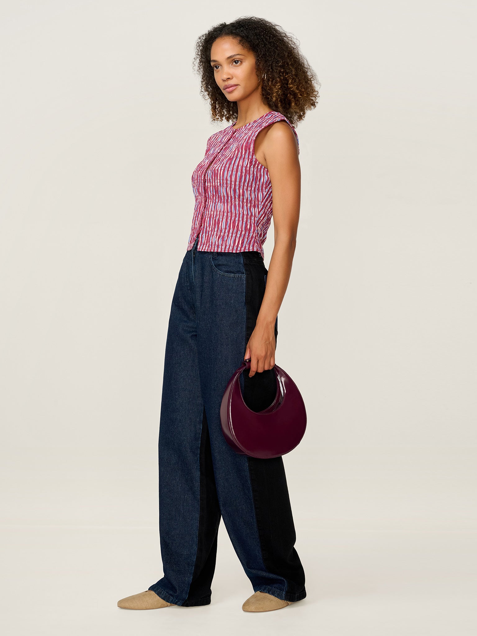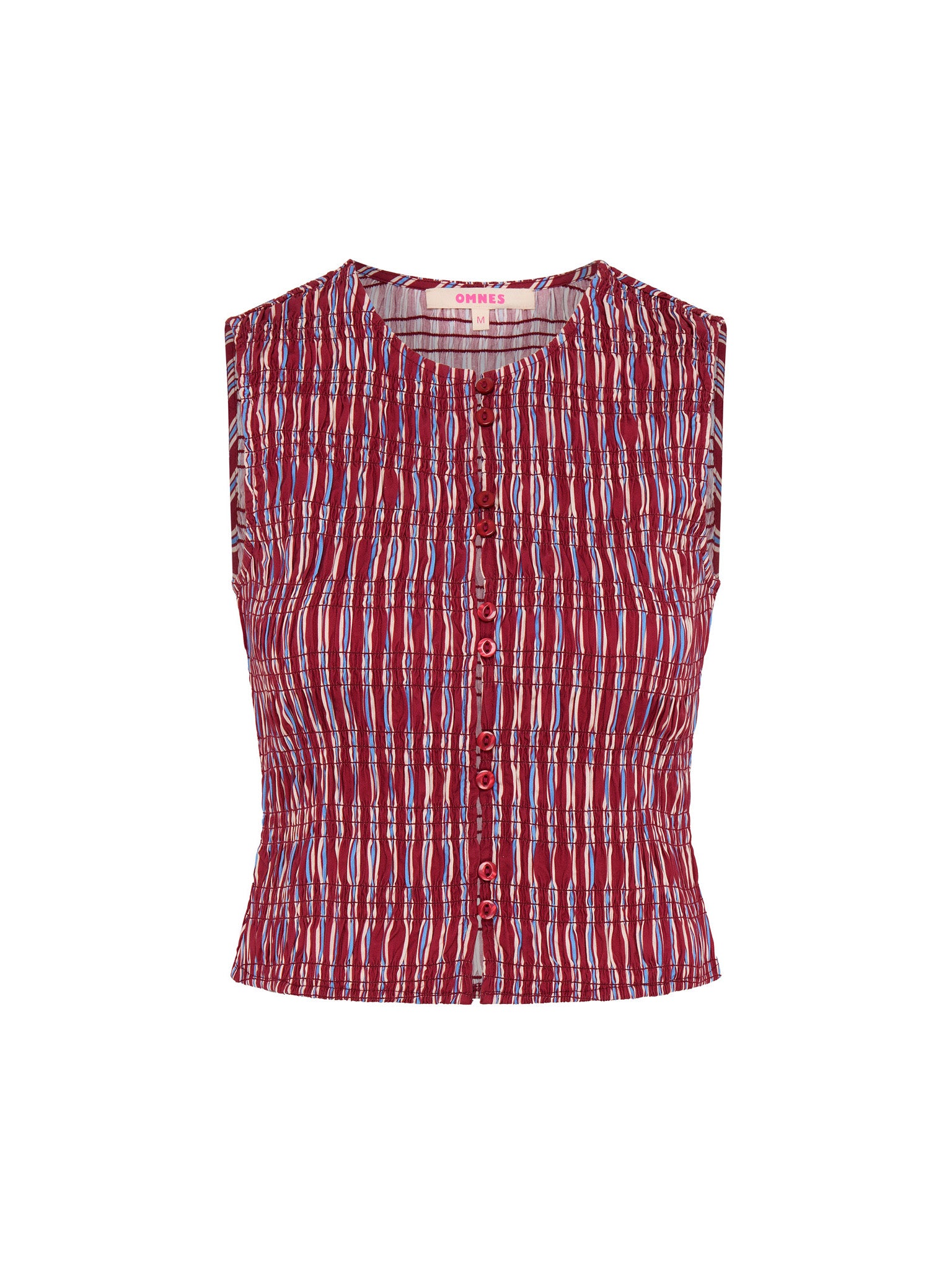 Alana is a sleeveless staple with subtle charm. Designed in a brown and blue vertical striped cotton, it’s fully shirred for a close, comfortable fit and finished with a delicate ruffle at the hem. Style it solo or layer it up; Alana brings the fun either way.