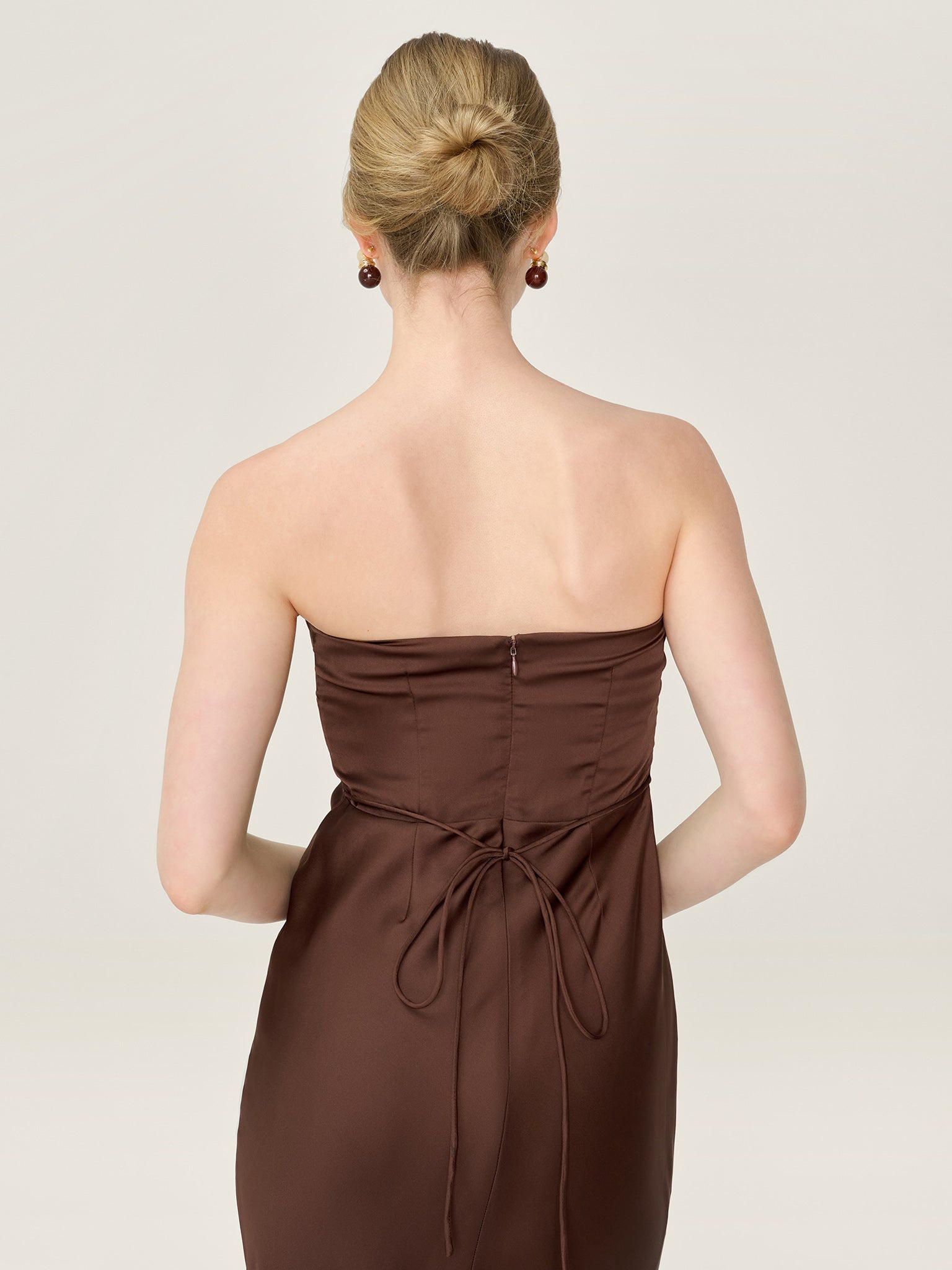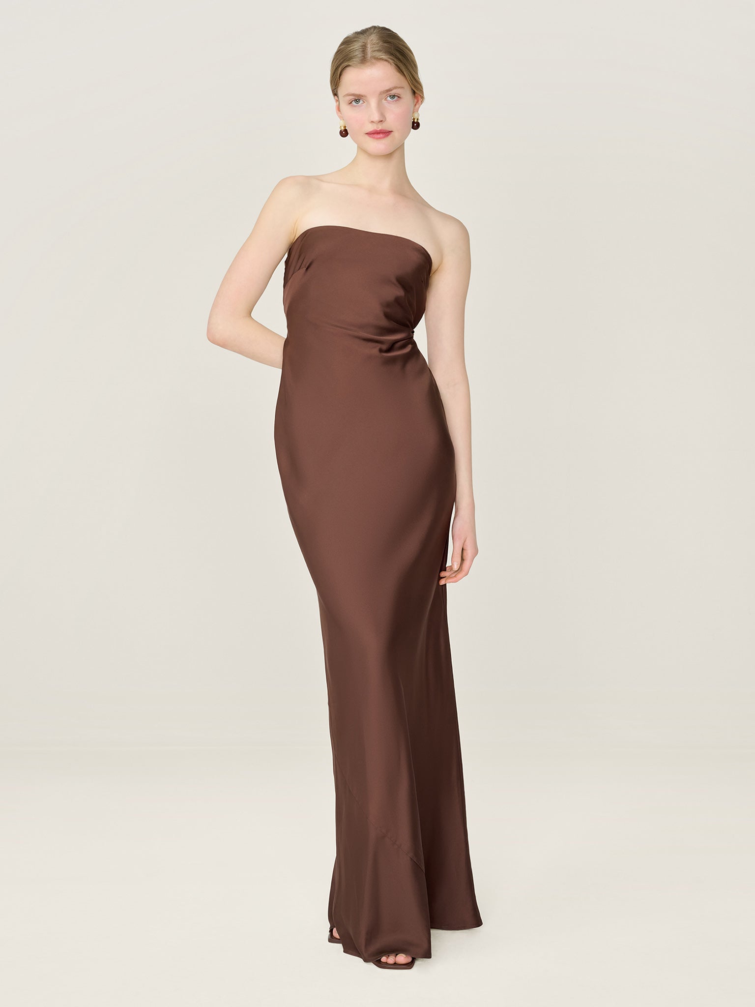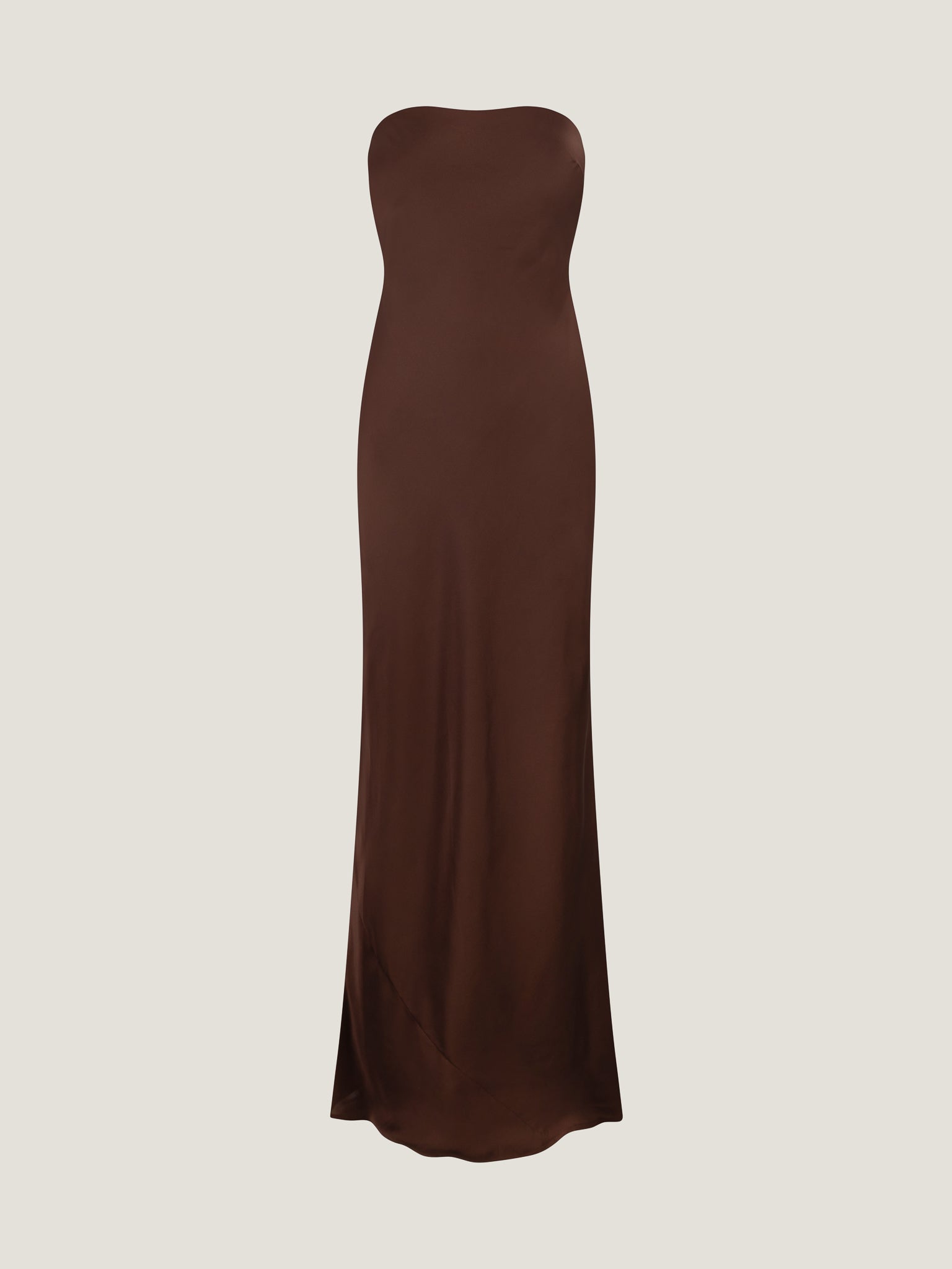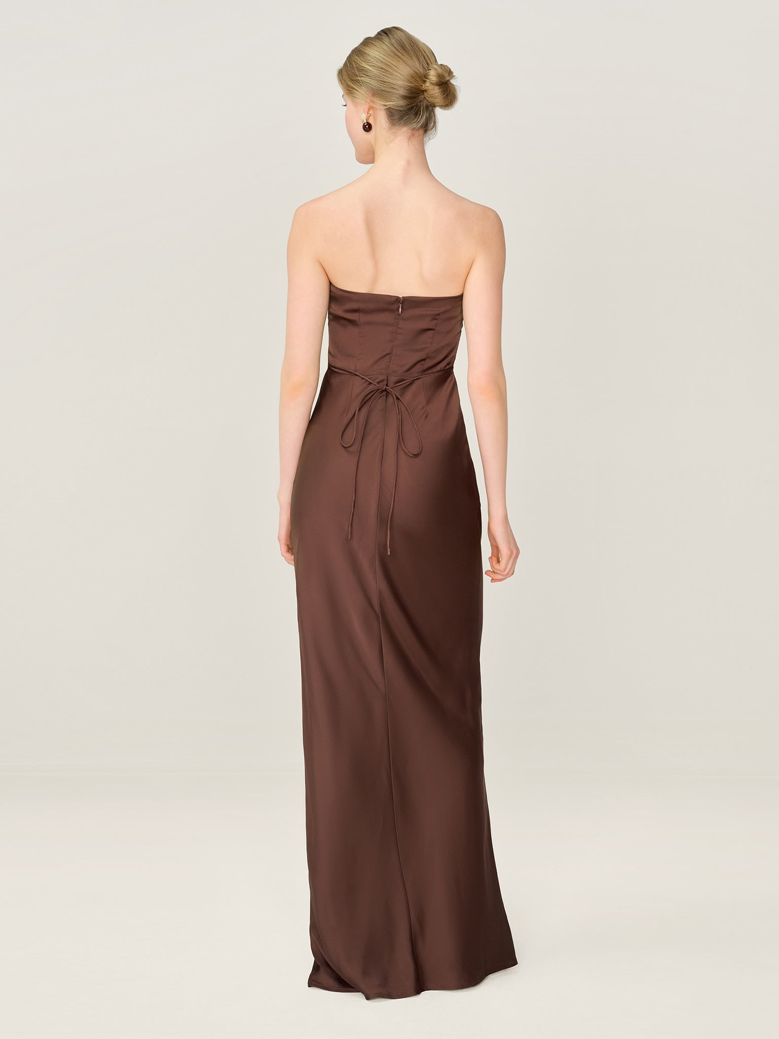 Simple, strapless, stunning; the Amdra is all that and more. Crafted from slinky satin in a gorgeous chocolate brown, she's fitted throughout to enhance the elegance of the silhouette.
