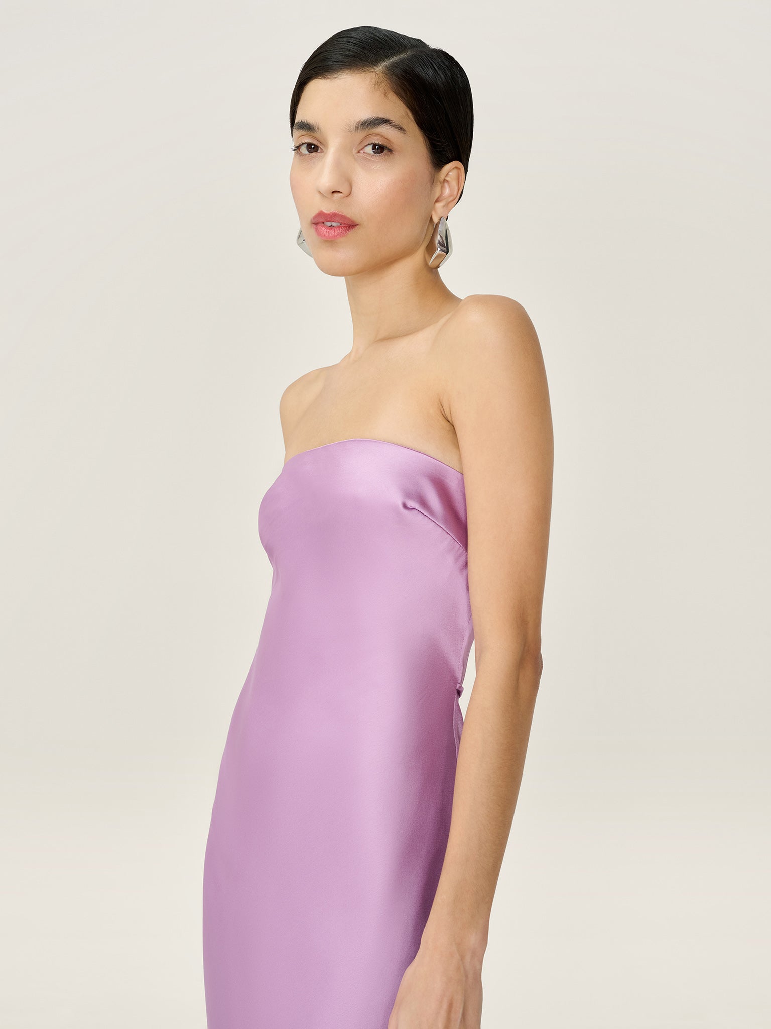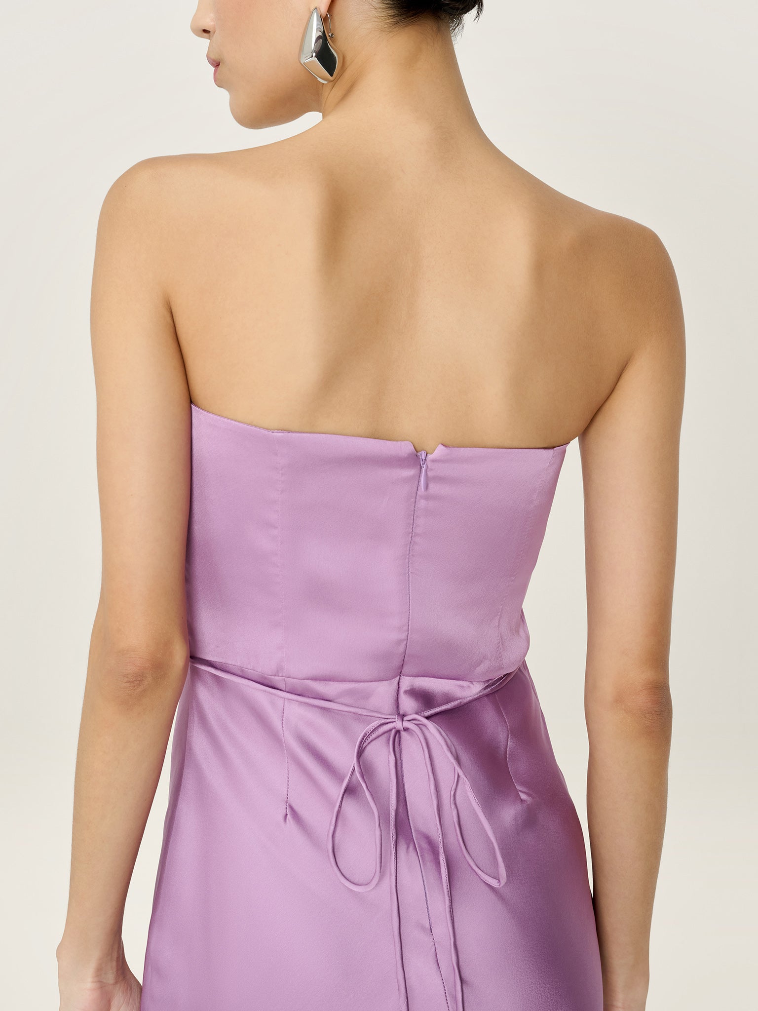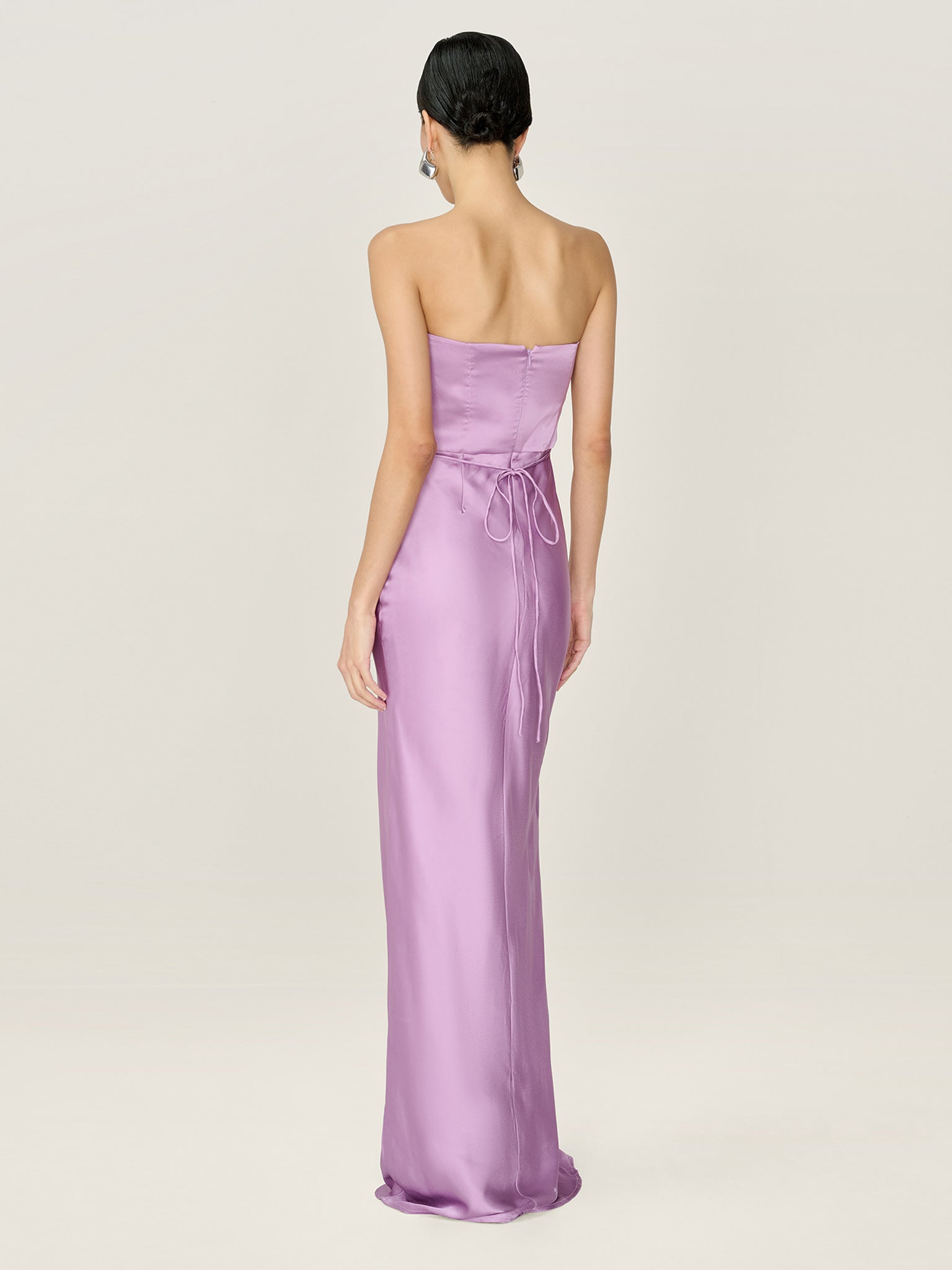 Simple, strapless, stunning; the Amdra is all that and more. Crafted from slinky 100% recycled polyester in a soft shade of lavender, she’s fitted throughout to enhance the elegance of the silhouette.