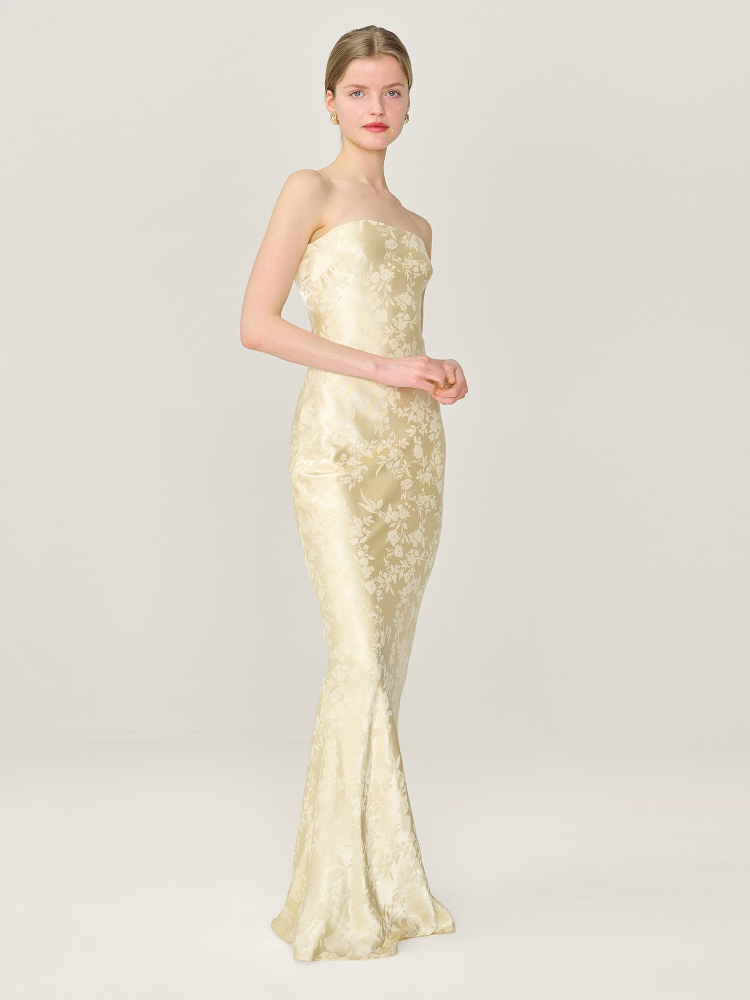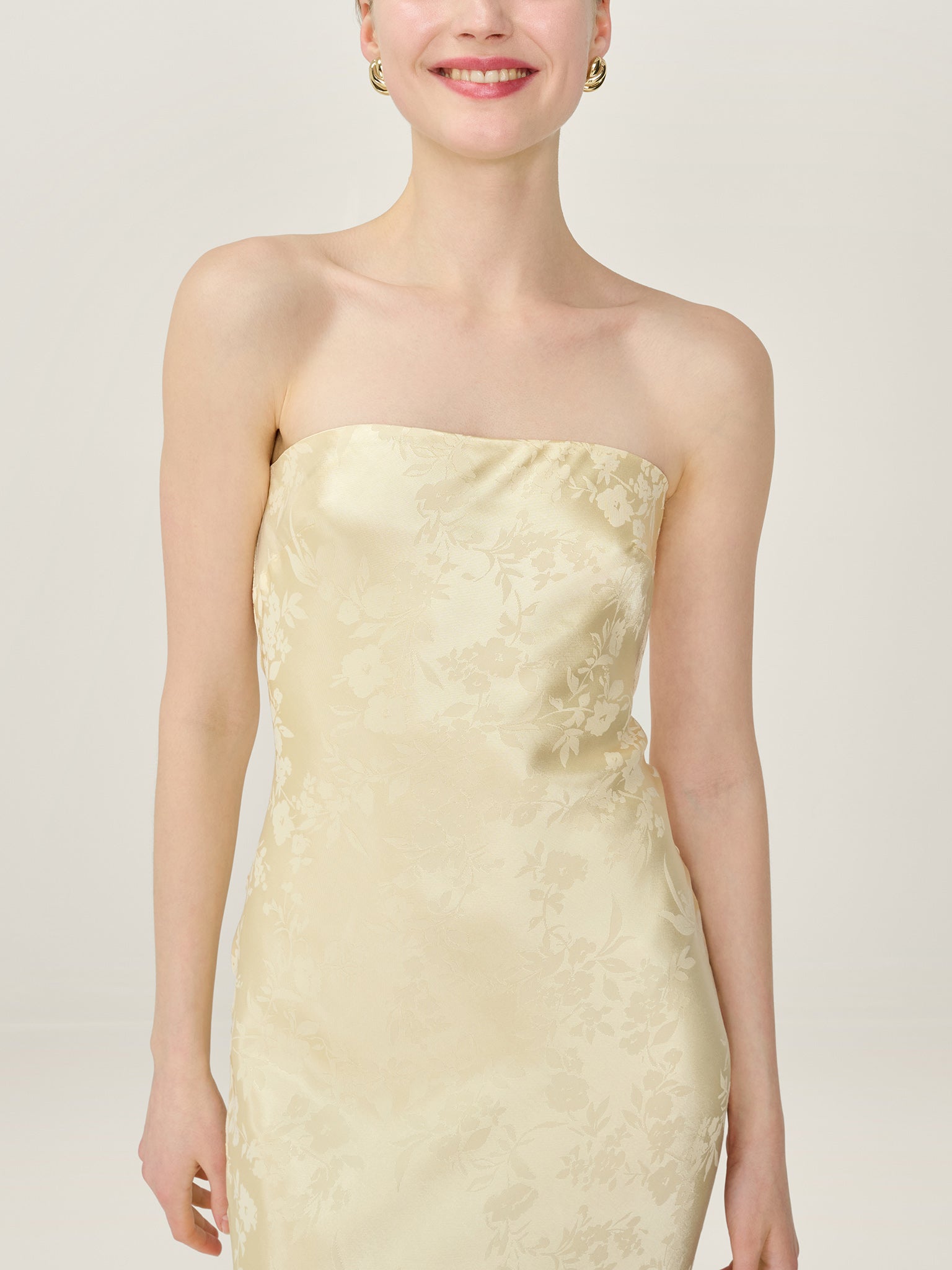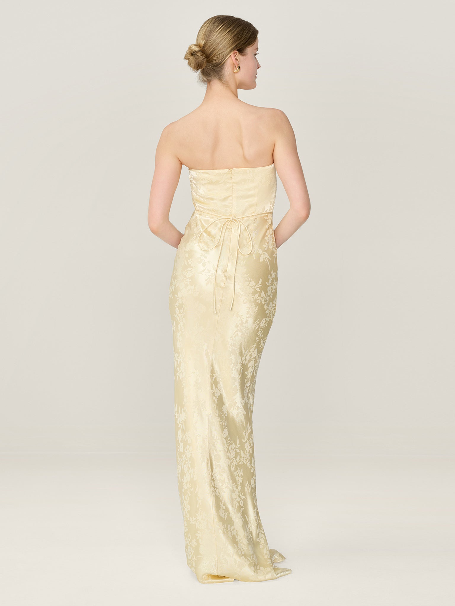 Simple, strapless, stunning; the Amdra is all that and more. Crafted from a slinky LENZINGª ECOVEROª Viscose blend in a gorgeous butter yellow floral jacquard, she's fitted throughout to enhance the elegance of your figure. Designed to sit within our wedding edit, she would make a great bridesmaid dress whether you're sticking to a theme or mixing and matching across colours and silhouettes.